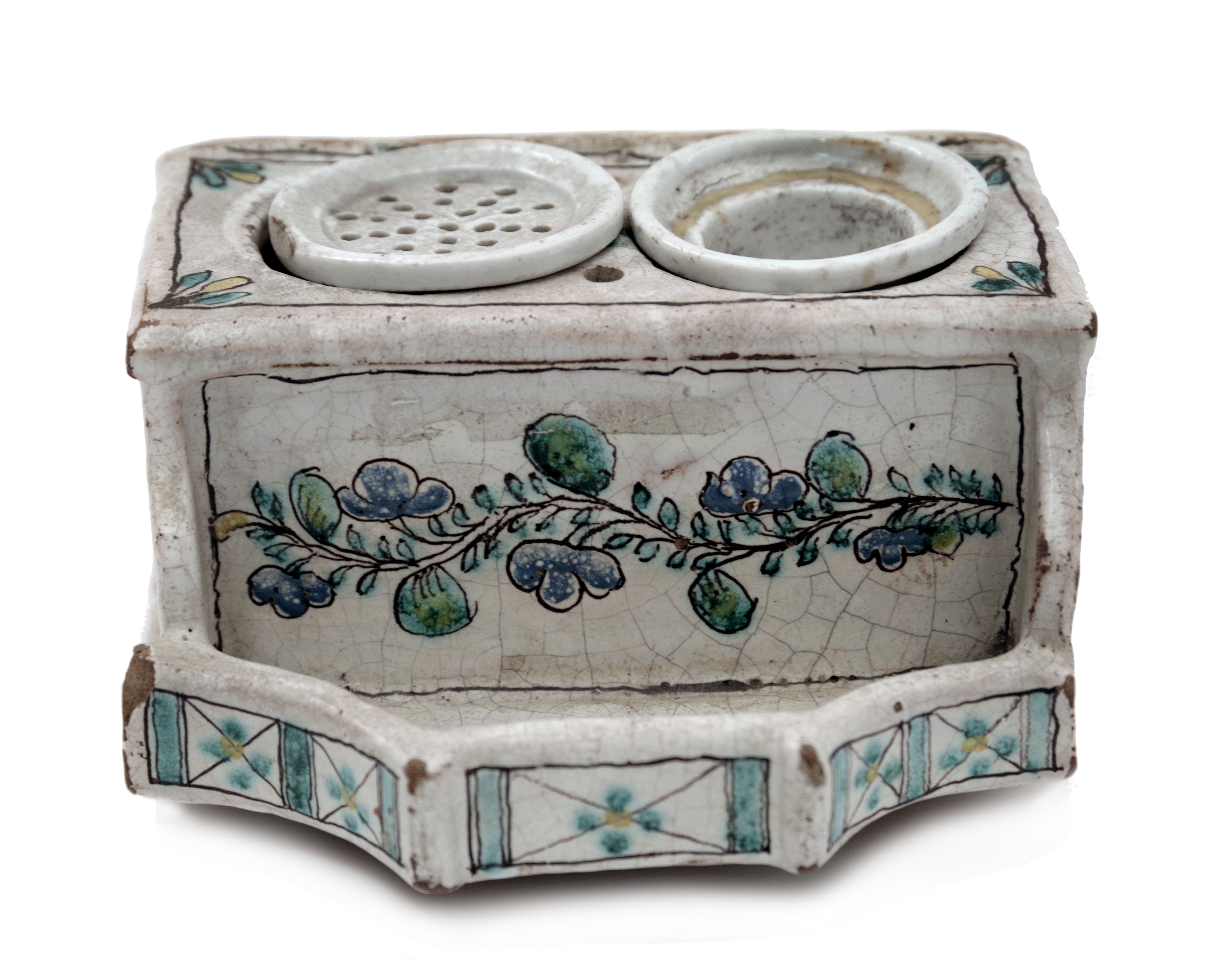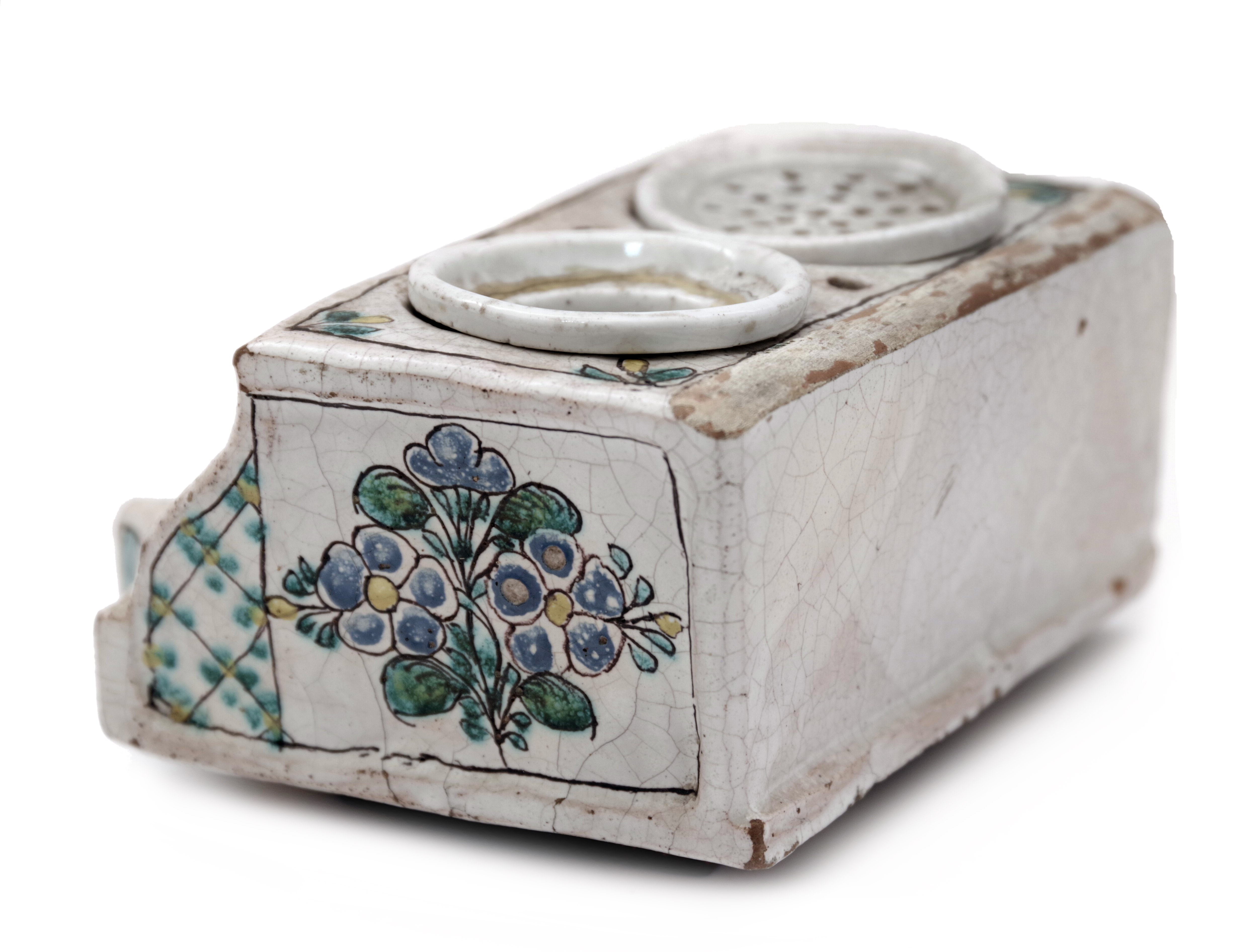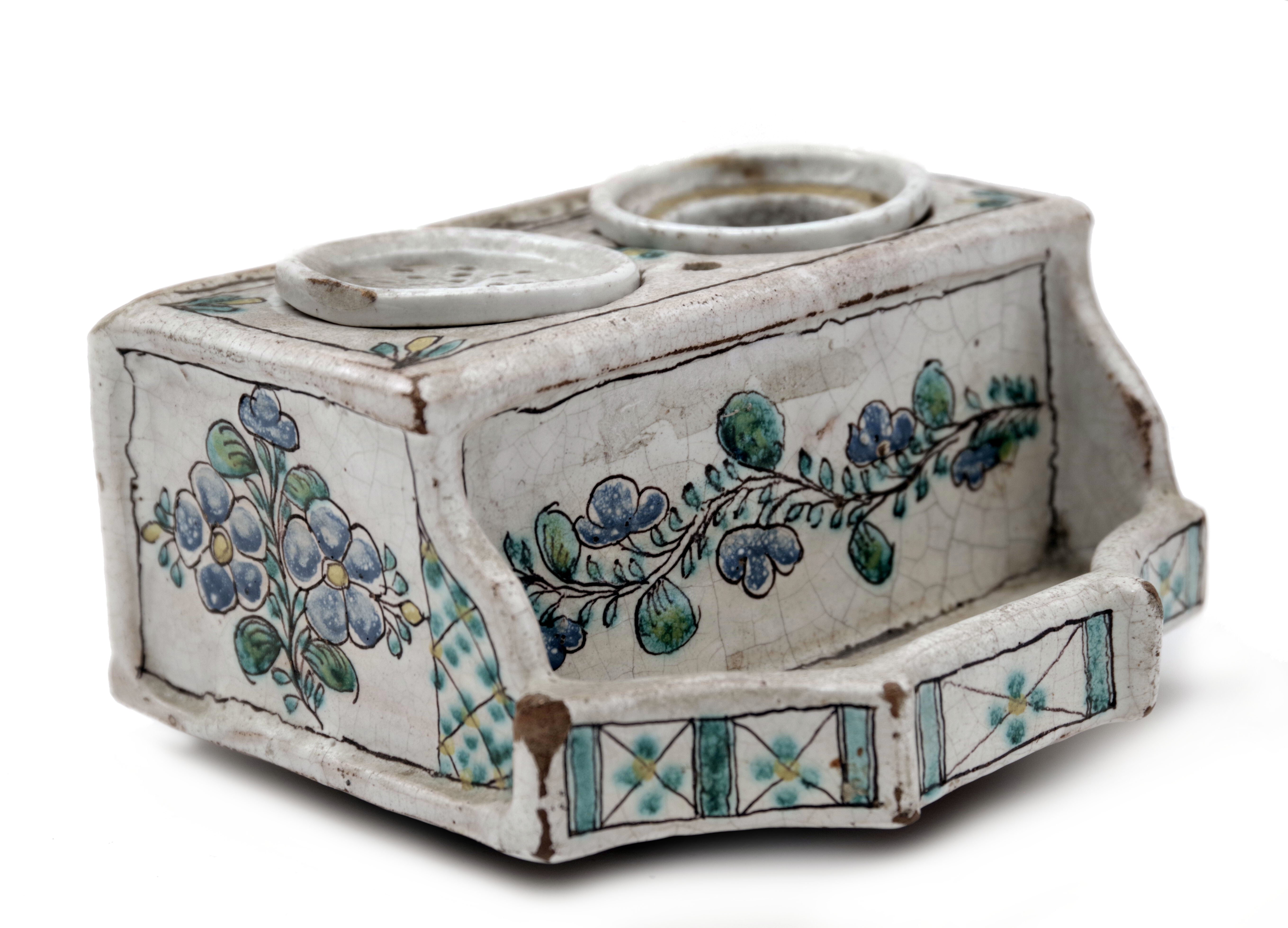 Fajáns, světle hnědý střep s krémovou cíničito-olovnatou glazurou. Prizmatický tvar s nádobkami na písek a inkoust. Malba vysokožárnými barvami. Rakousko, Gmunden, 18. století, délka 13,5 cm. Krakeláž, několikrát odražený. Neodborně restaurován. Stav 3