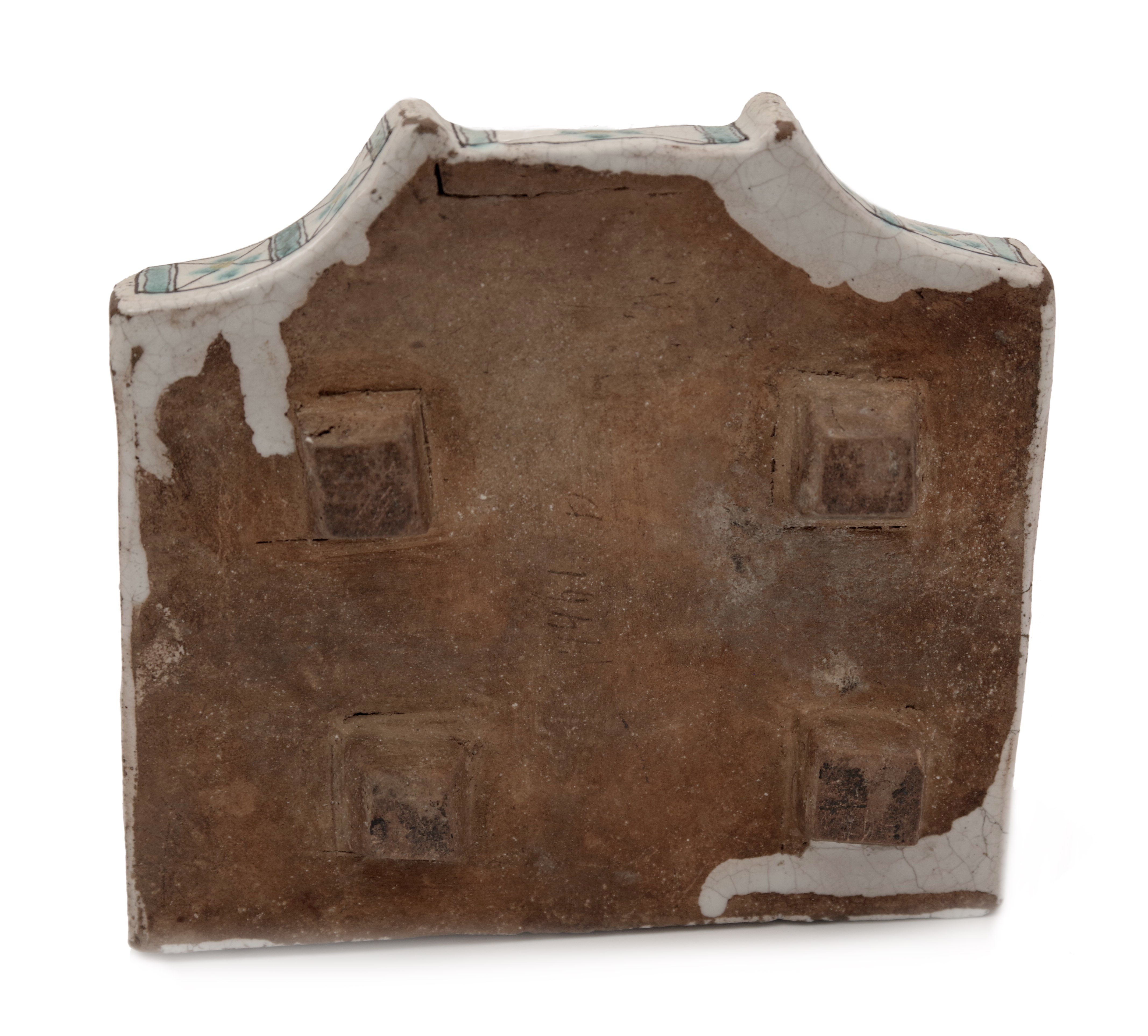 Fajáns, světle hnědý střep s krémovou cíničito-olovnatou glazurou. Prizmatický tvar s nádobkami na písek a inkoust. Malba vysokožárnými barvami. Rakousko, Gmunden, 18. století, délka 13,5 cm. Krakeláž, několikrát odražený. Neodborně restaurován. Stav 3, Faience, light brown shard with creamy tin-lead glaze. Prismatic form with containers for sand and ink. Painted with high-fired colours,. Austria, Gmunden, 18th century, length 13.5 cm. Craquelé, several chips. Unprofessionally restored. Condition 3