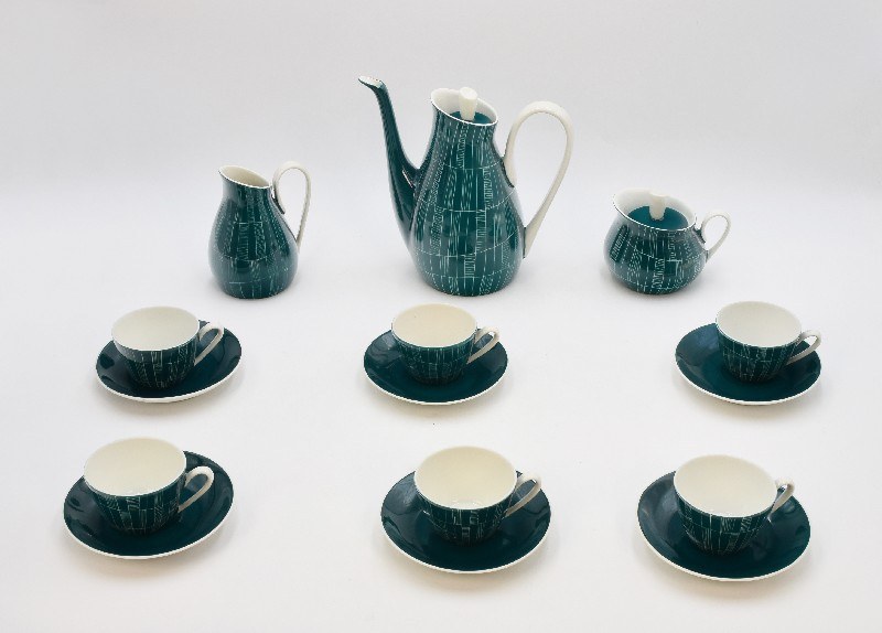 porcelana, natrysk wybierany; wymiary: dzbanek - wys. 18,5 cm, mlecznik - wys. 11,5 cm, filiżanka - wys. 4,5 cm, spodek - średn. 11,5 cm, cukiernica - 9 cm;