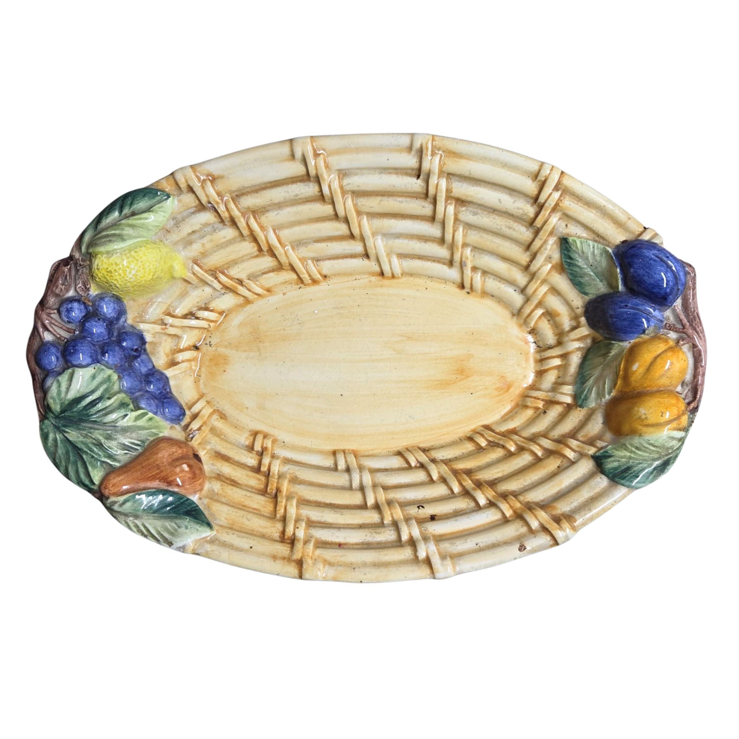 Oryginalna, ceramiczna patera na owoce w formie koszyczka, zdobionego na brzegach owocami, w stylu ceramiki Bassano. Włochy.