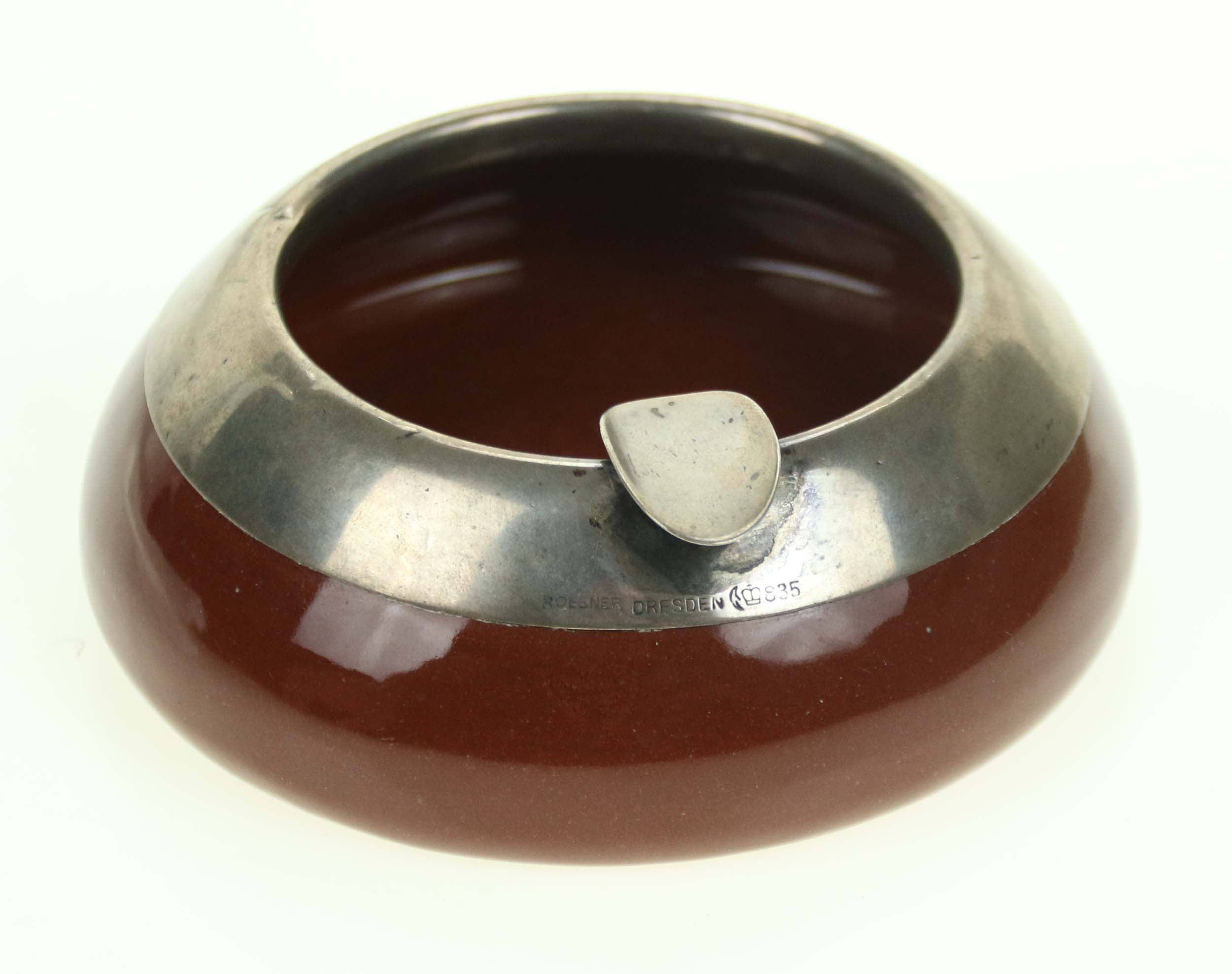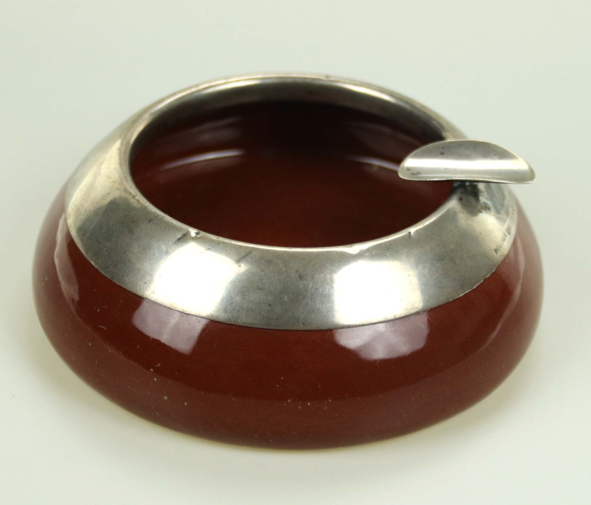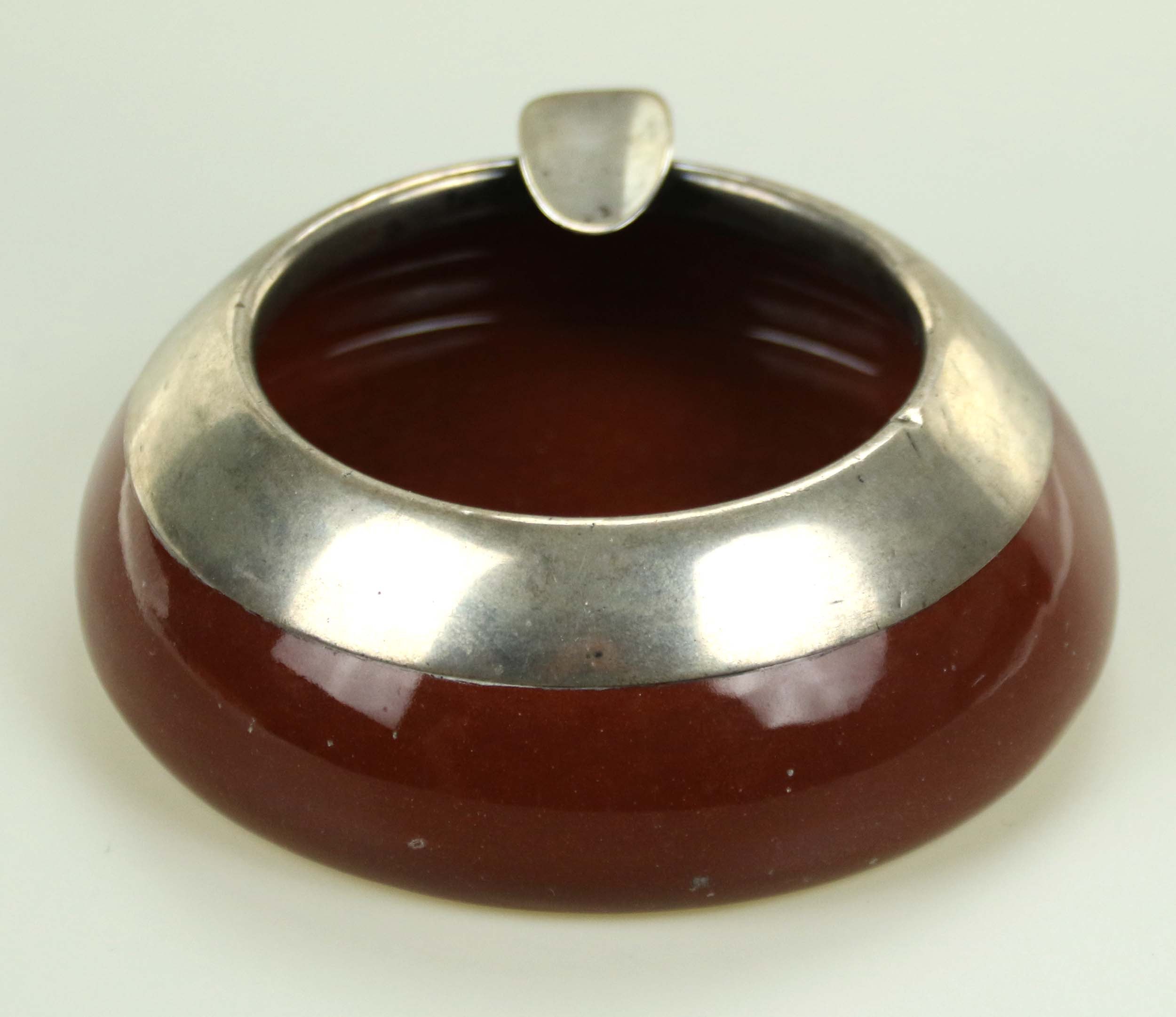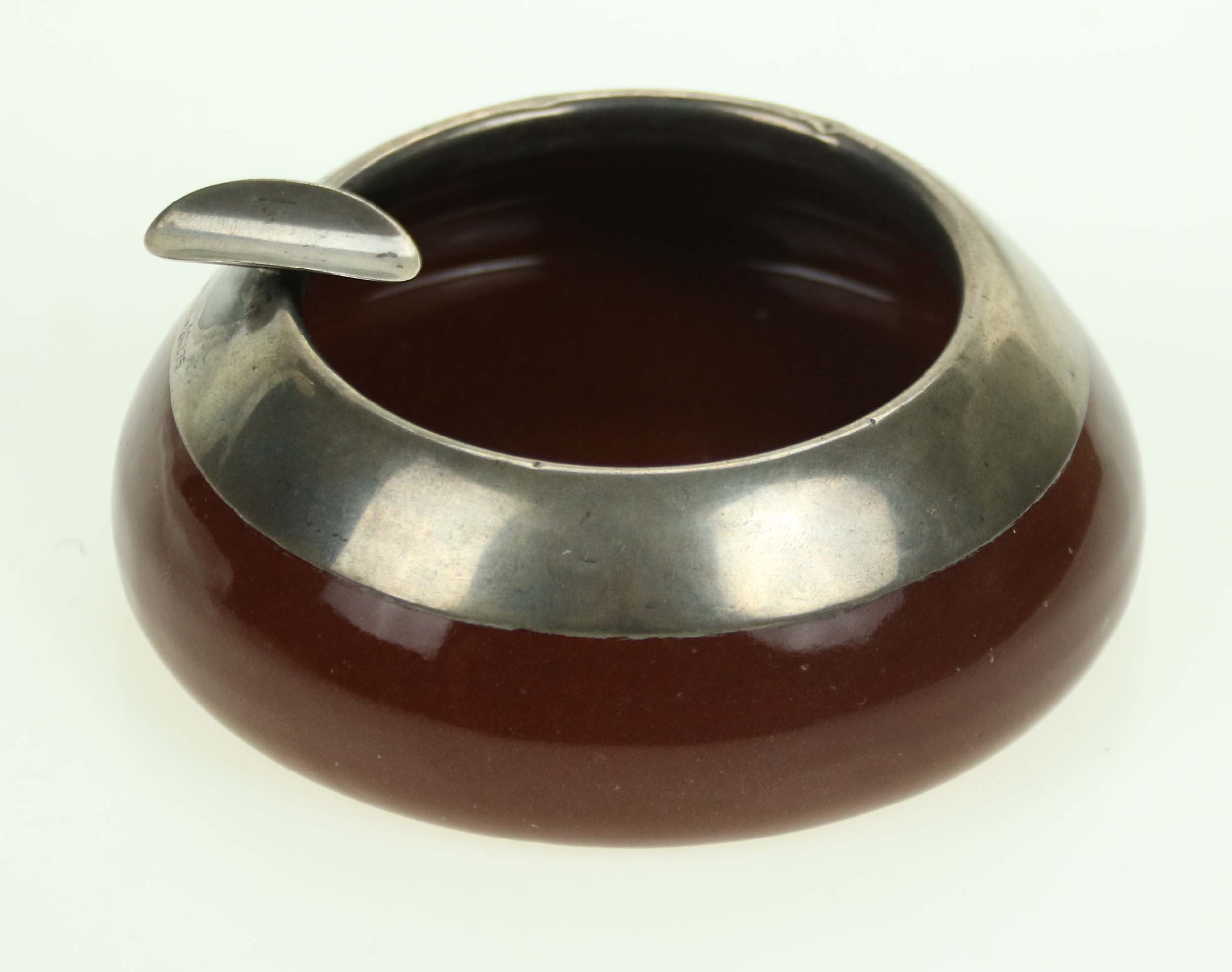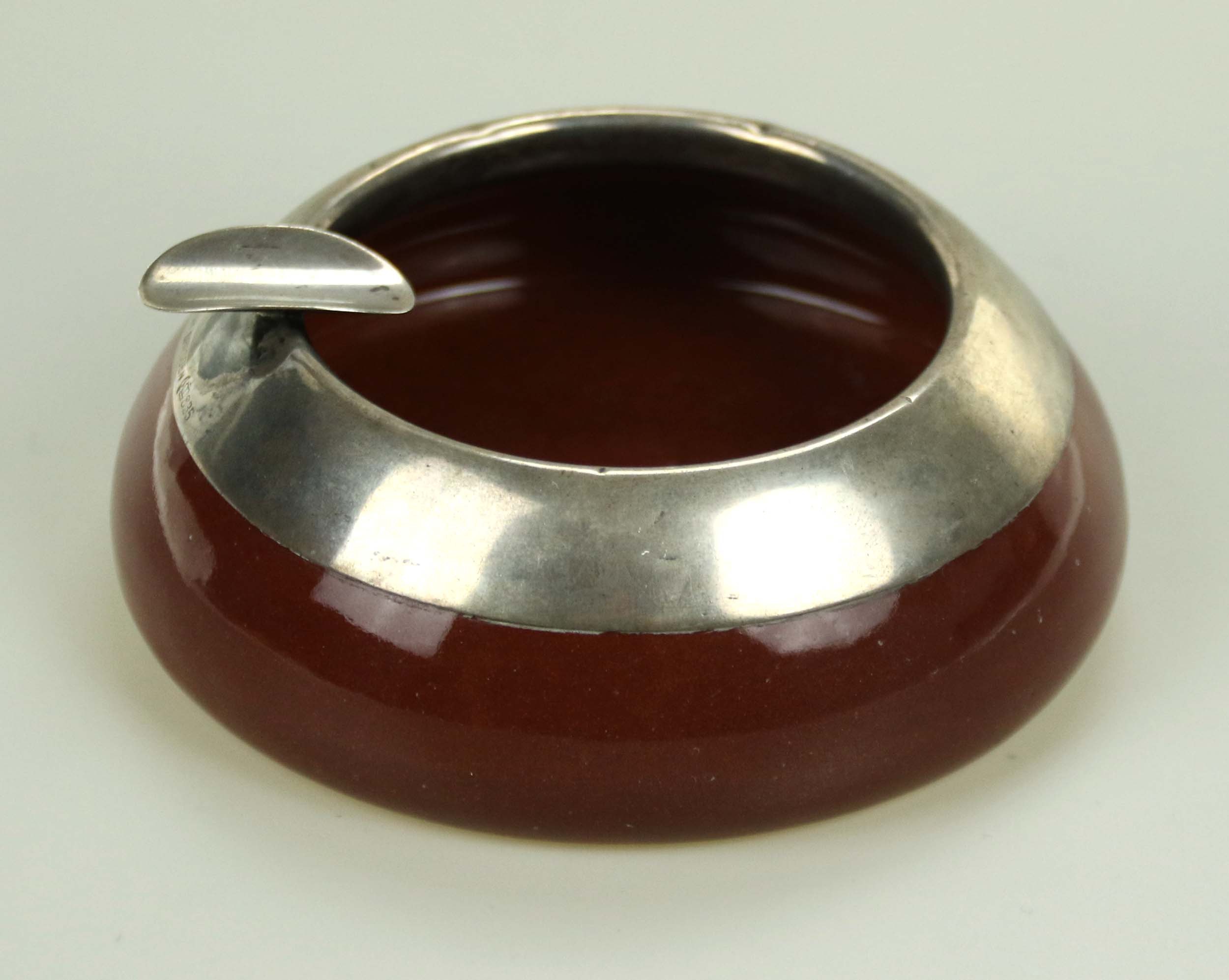 Popielniczka, Królewska Wytwórnia Majoliki w Kadynach, l. 1915-1930, Sygnowana na spodzie. Glina szkliwiona, srebro pr. 800; wys. 4,2 cm śred. 11 cm