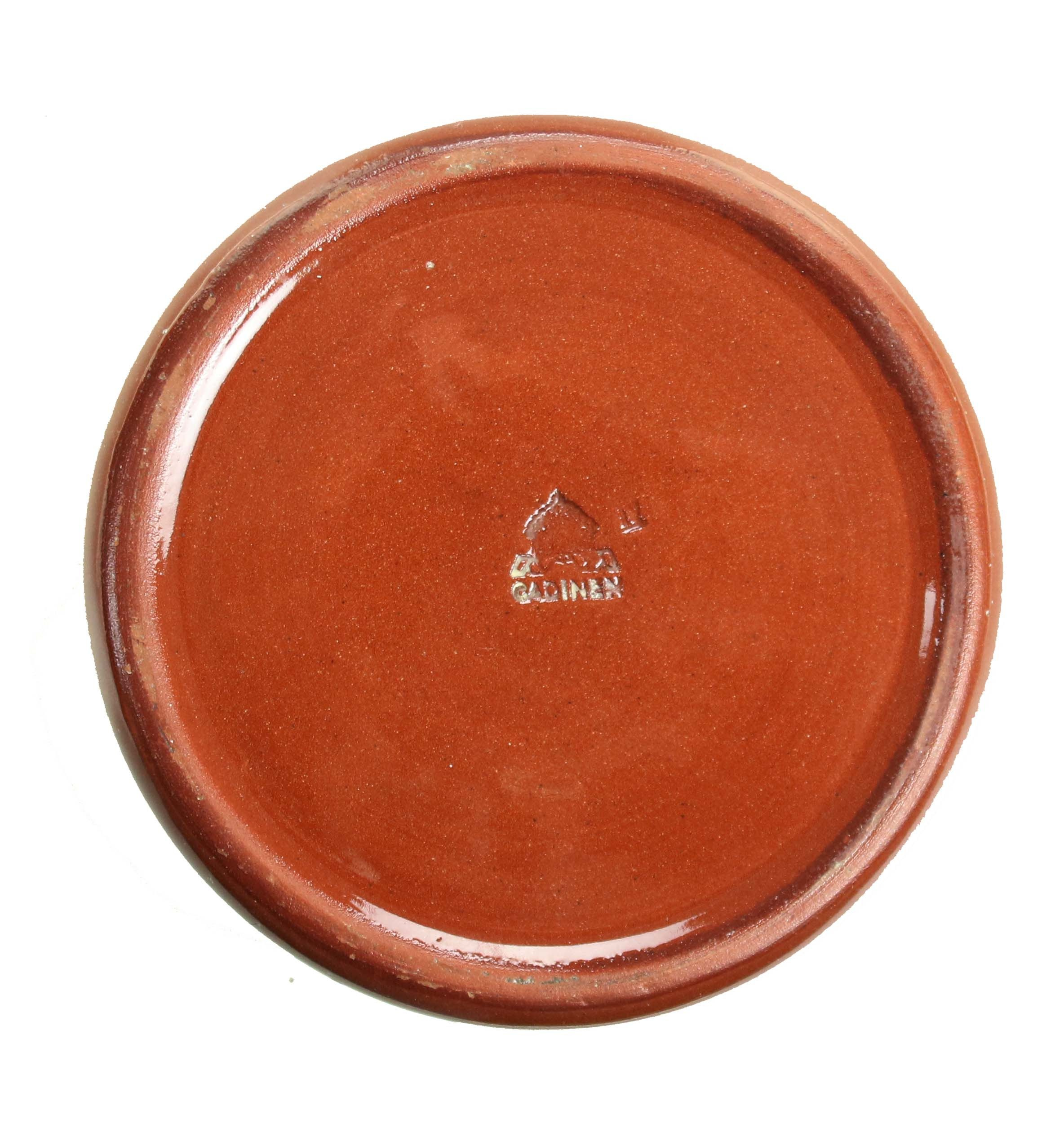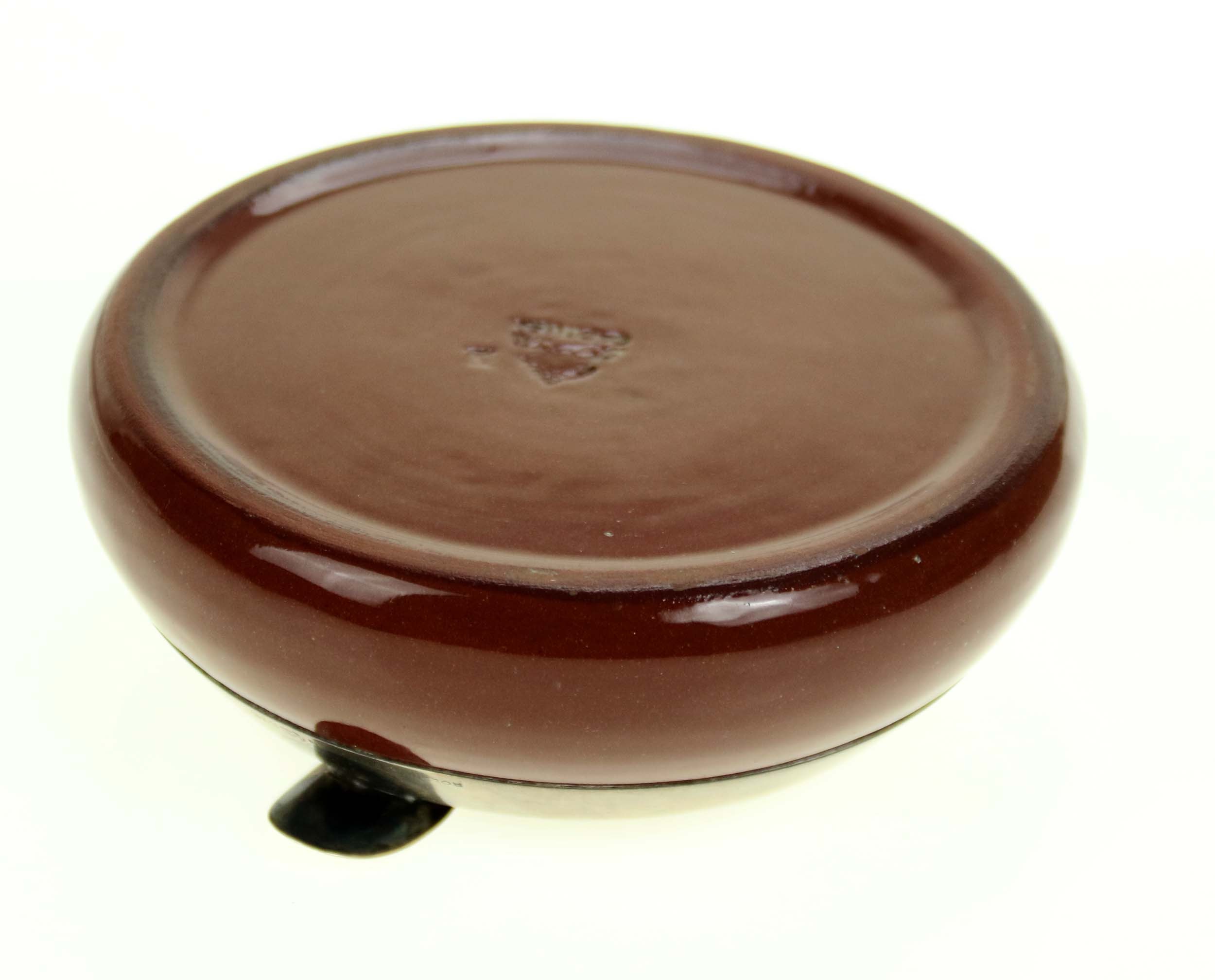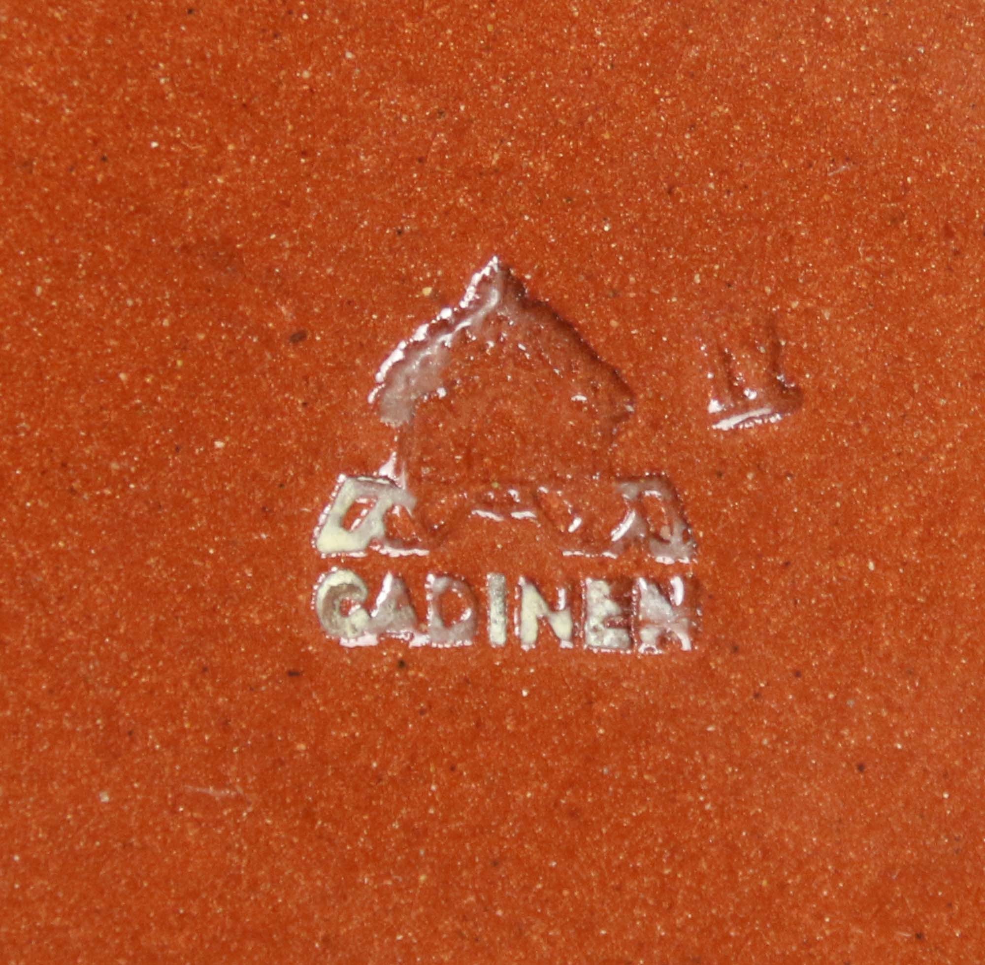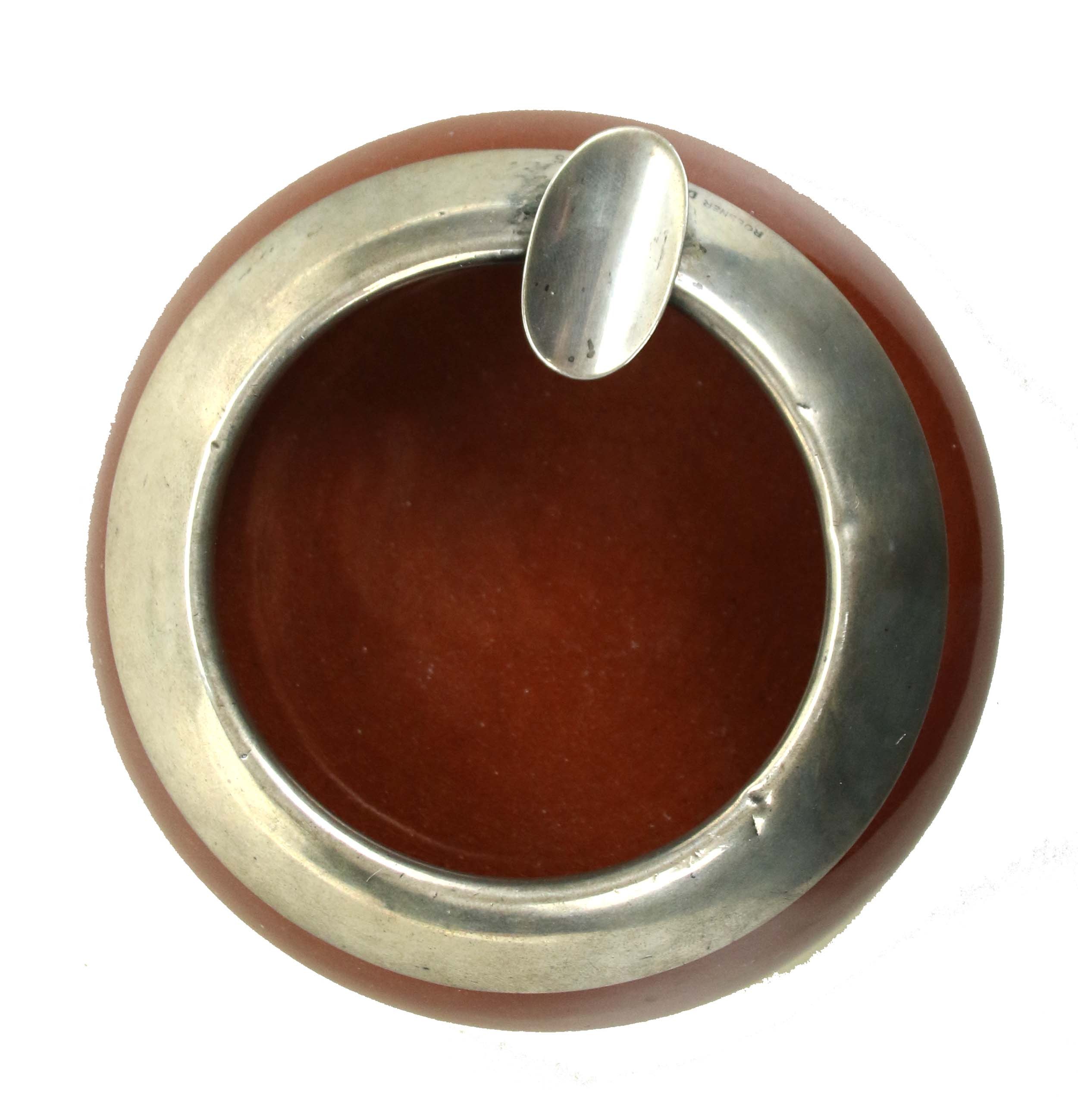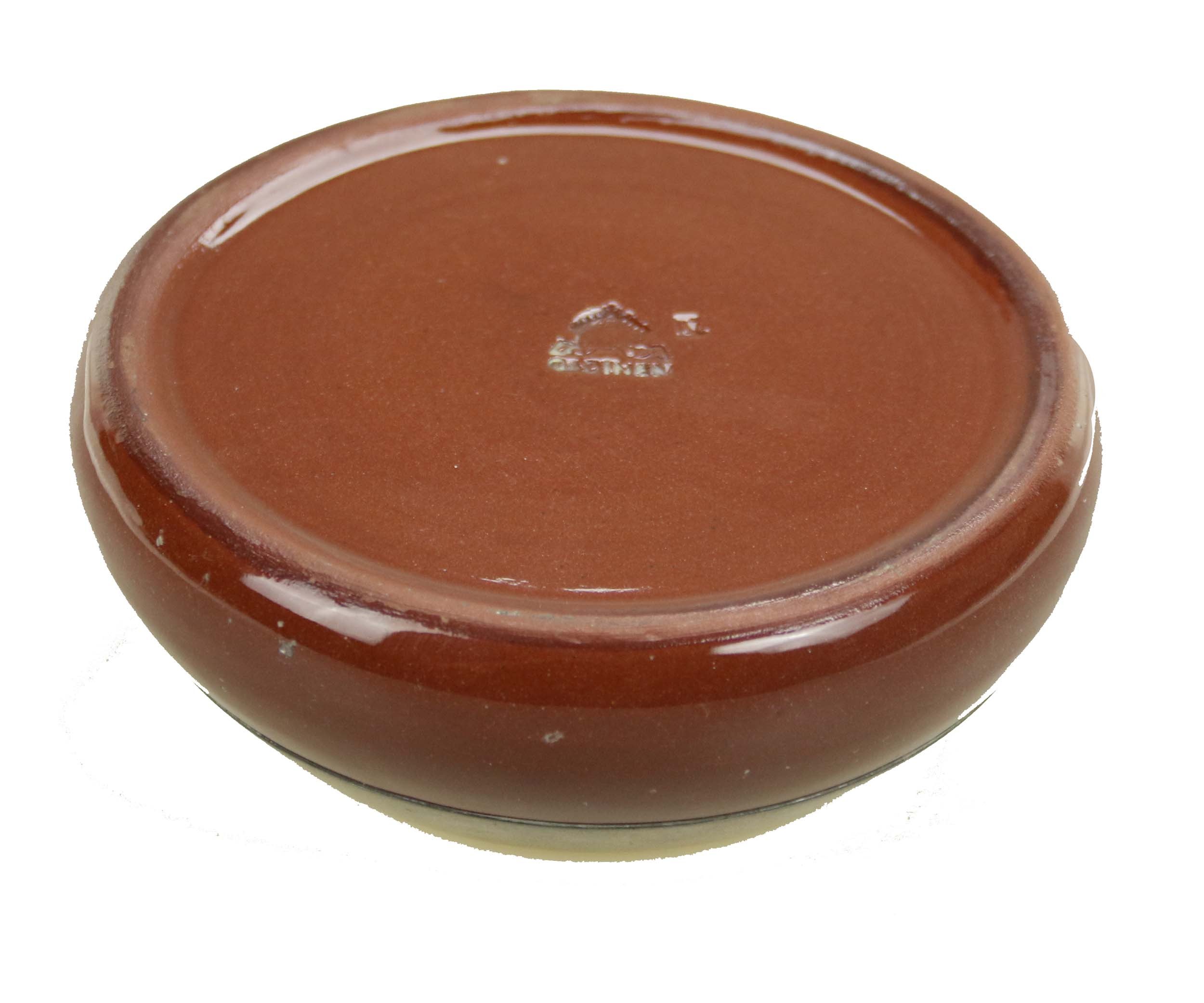 Popielniczka, Królewska Wytwórnia Majoliki w Kadynach, l. 1915-1930, Sygnowana na spodzie. Glina szkliwiona, srebro pr. 800; wys. 4,2 cm śred. 11 cm