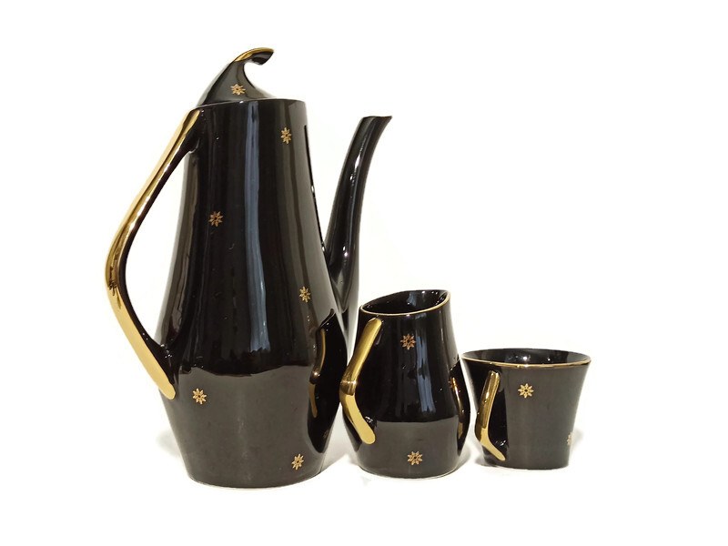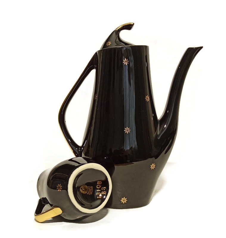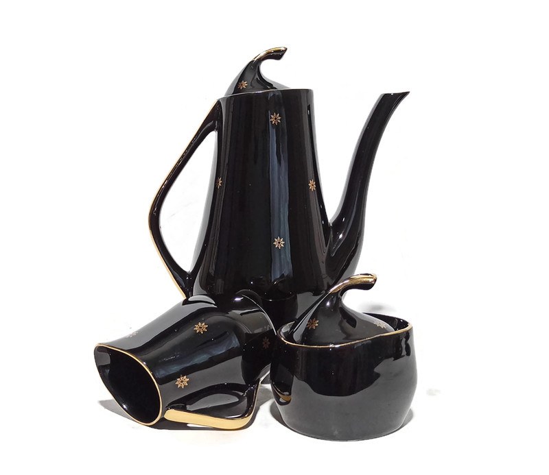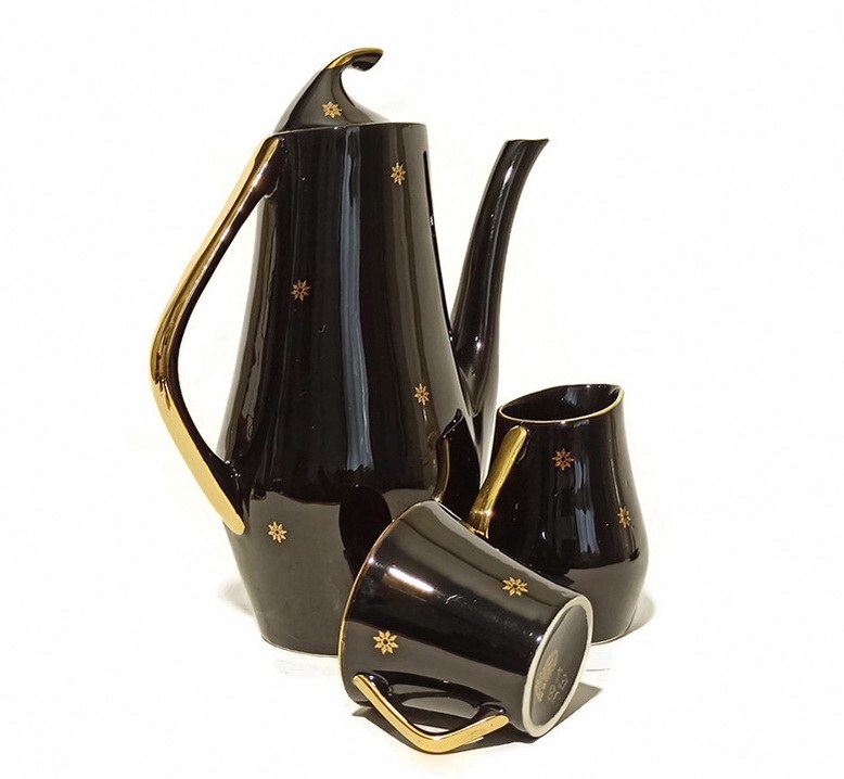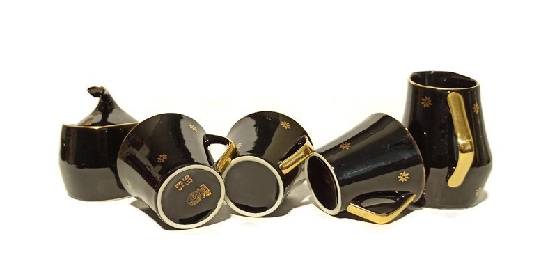 porcelana malowana, kolor czarny, złote obwódki, uchwyty i kwiatowe elementy dekoracyjne, wszystkie elementy sygnowane,