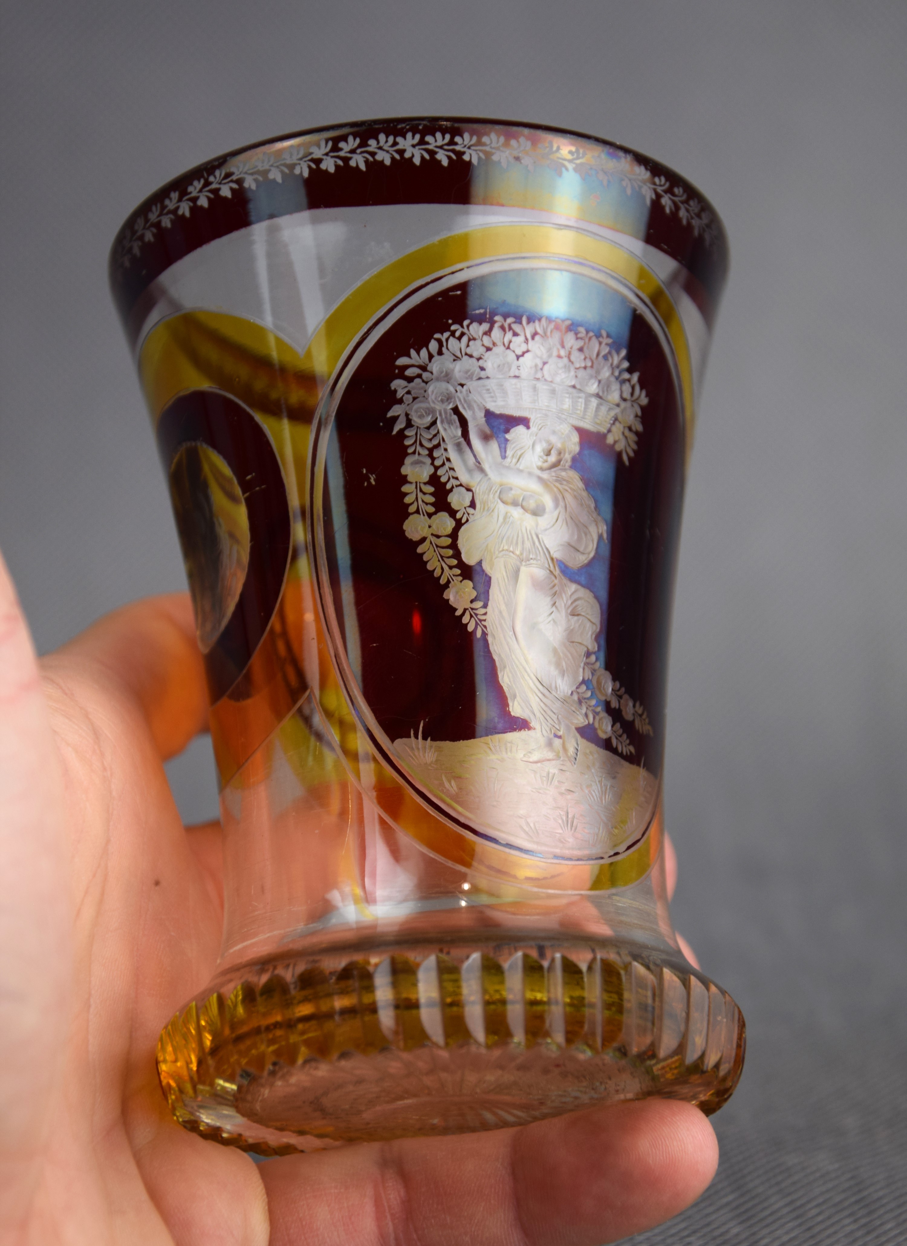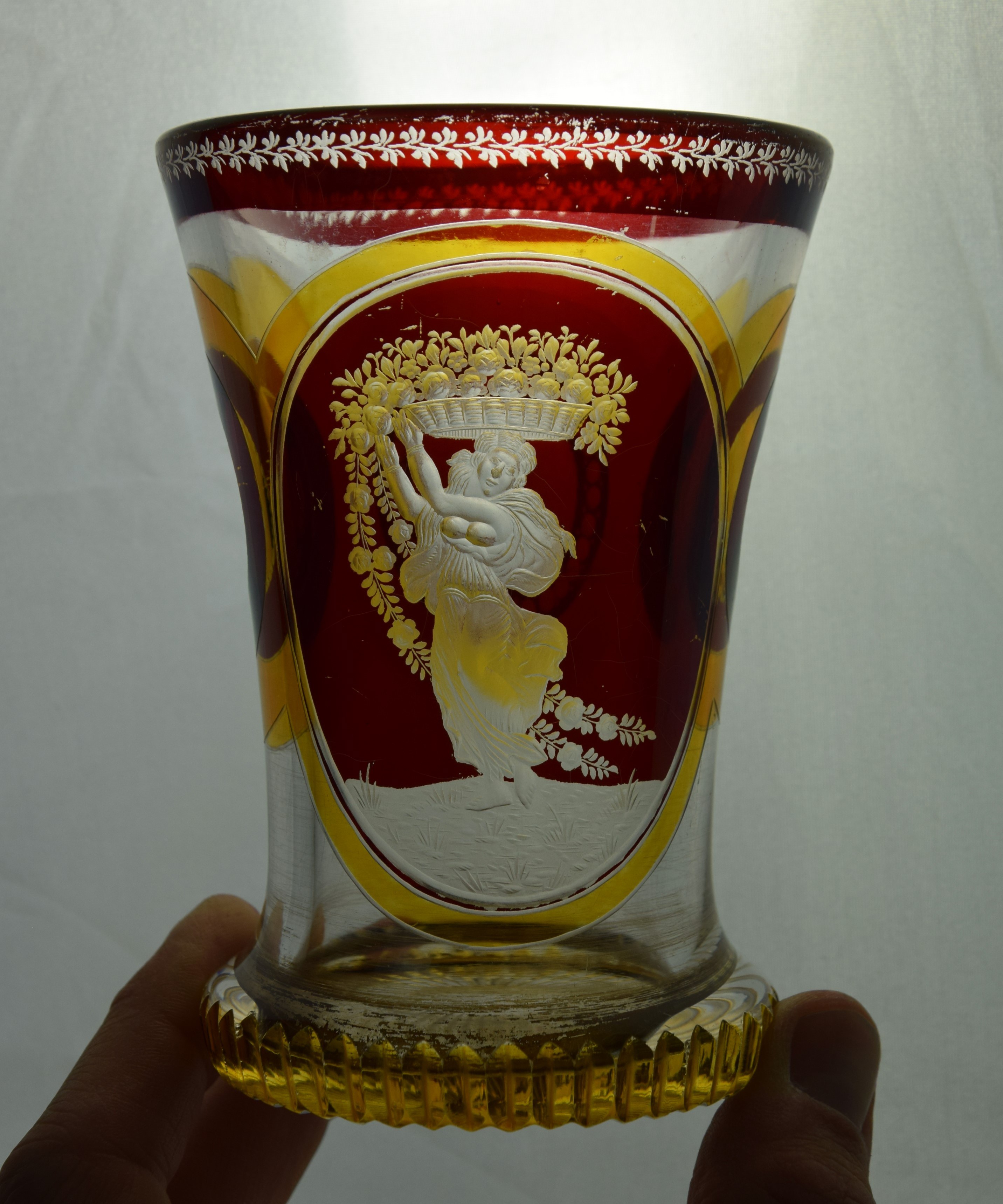Szklanica z alegorią - kobieta z koszem pełnym róż może symbolizować wiosnę