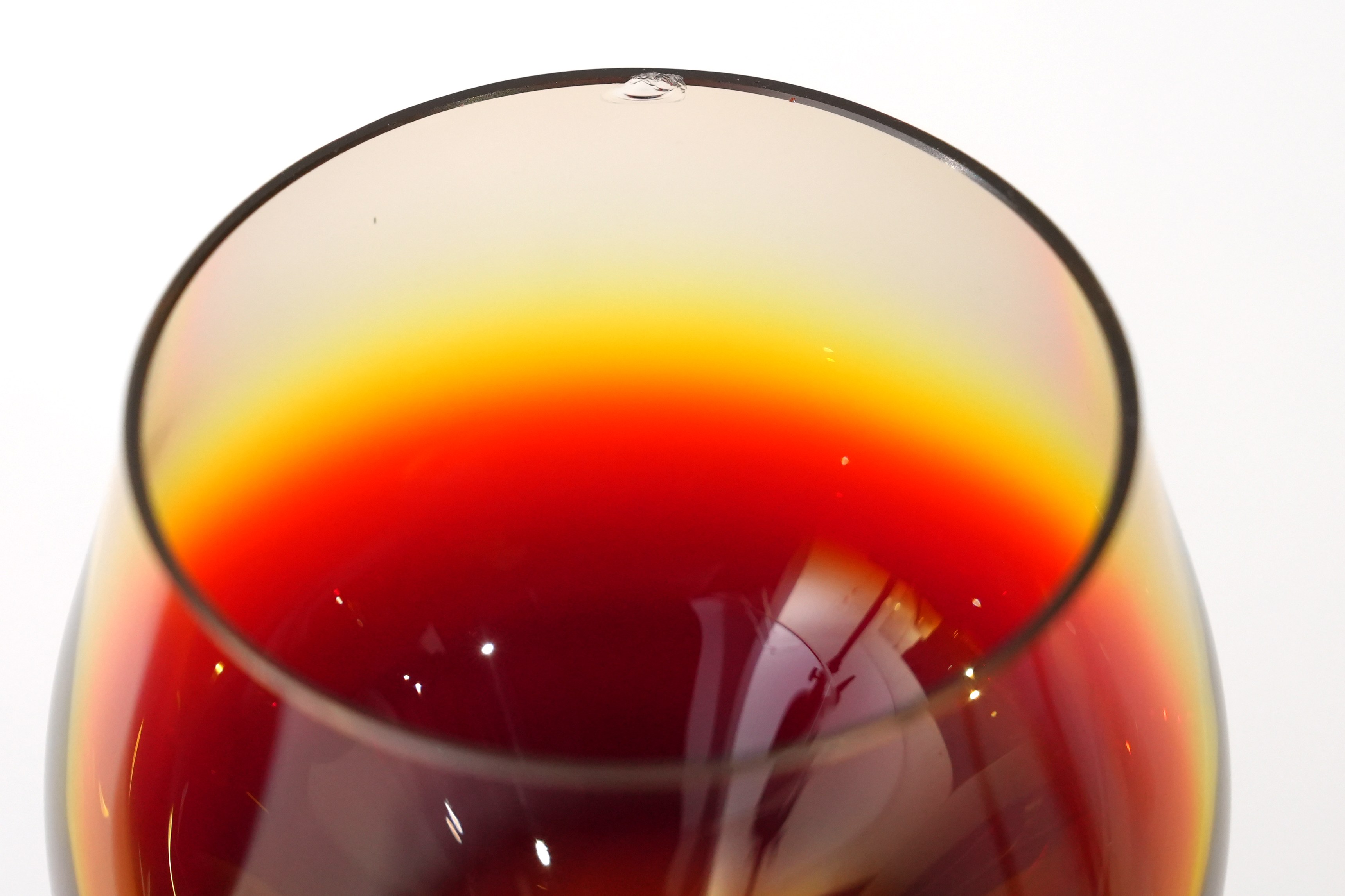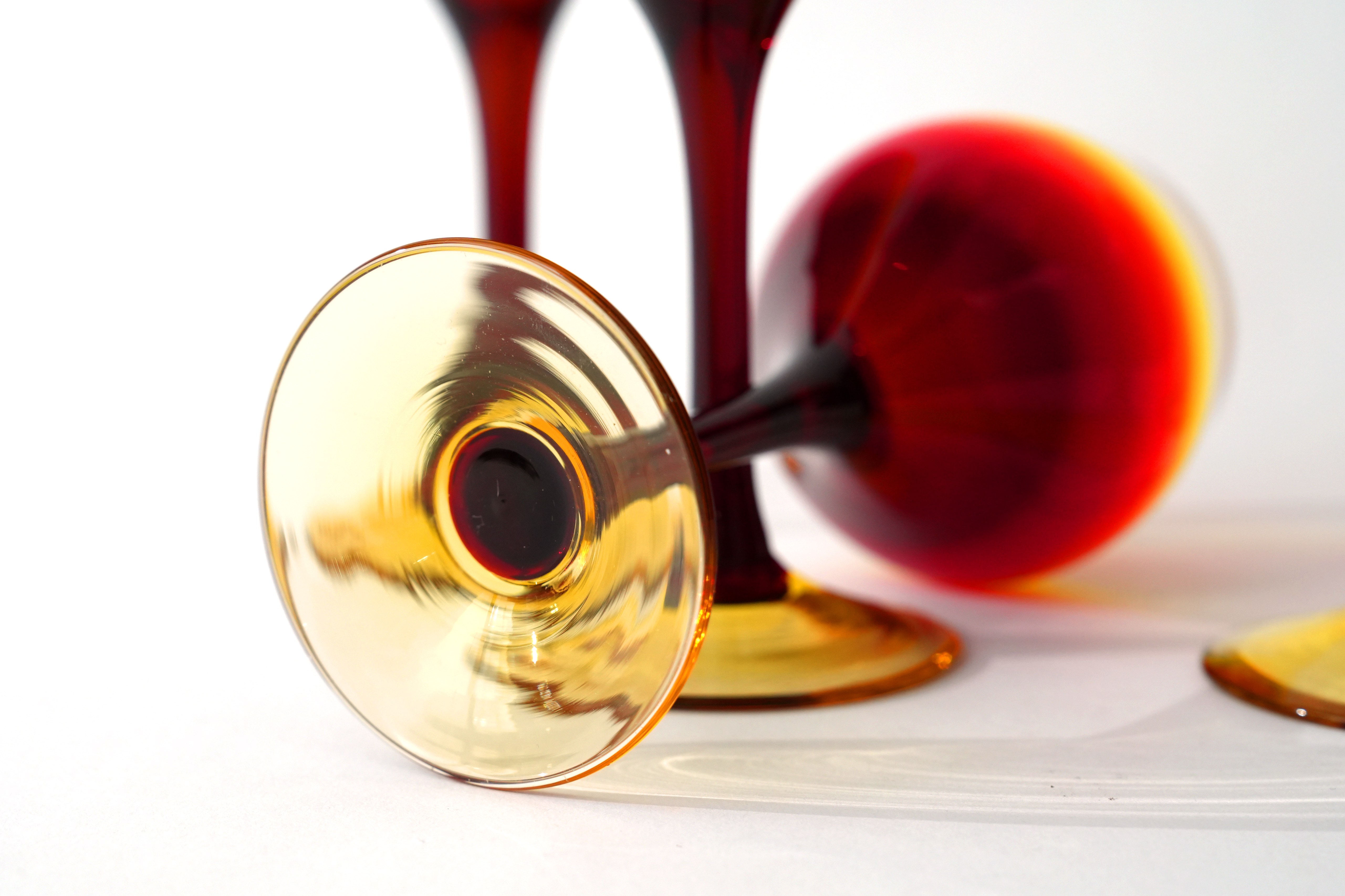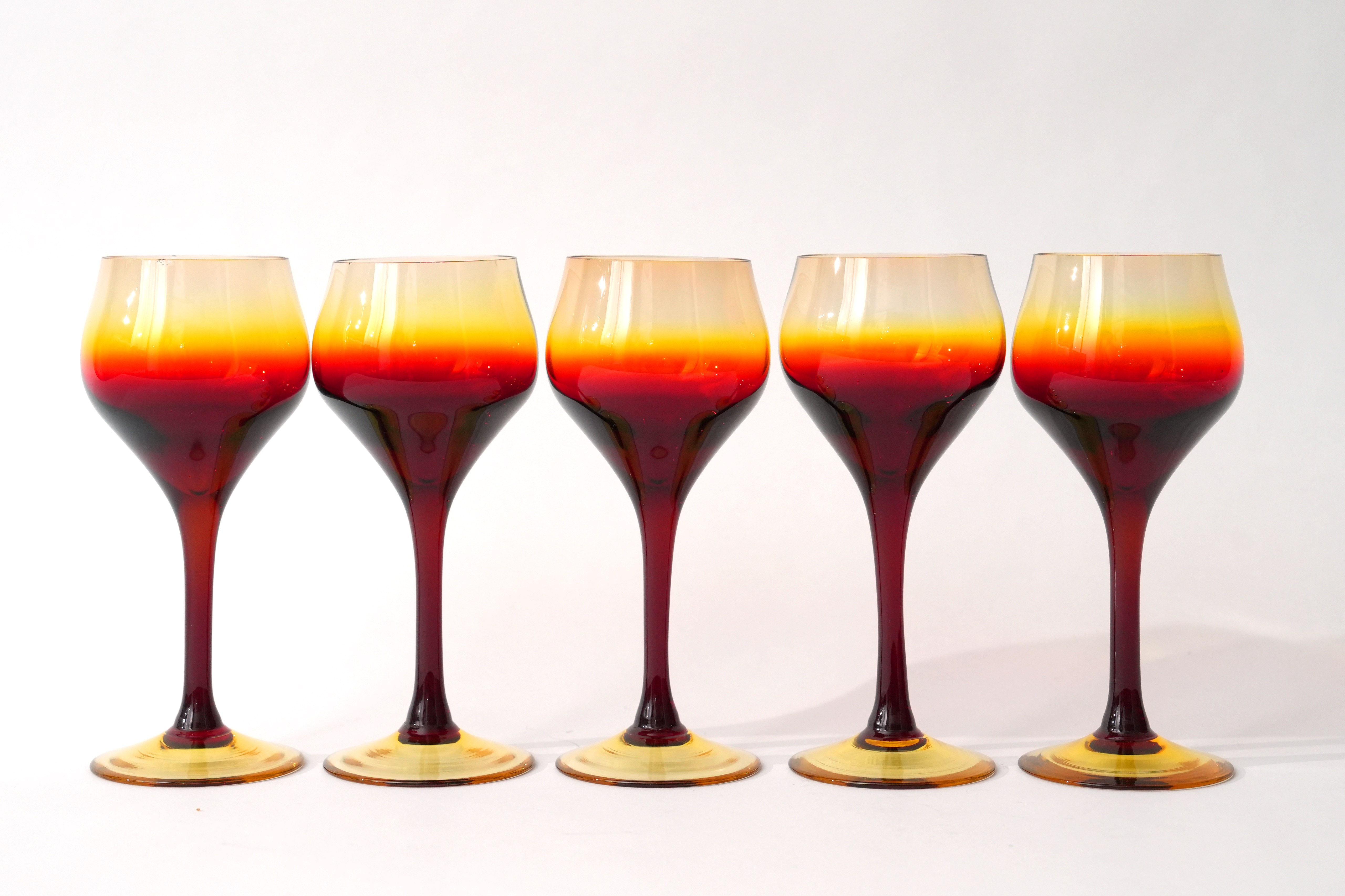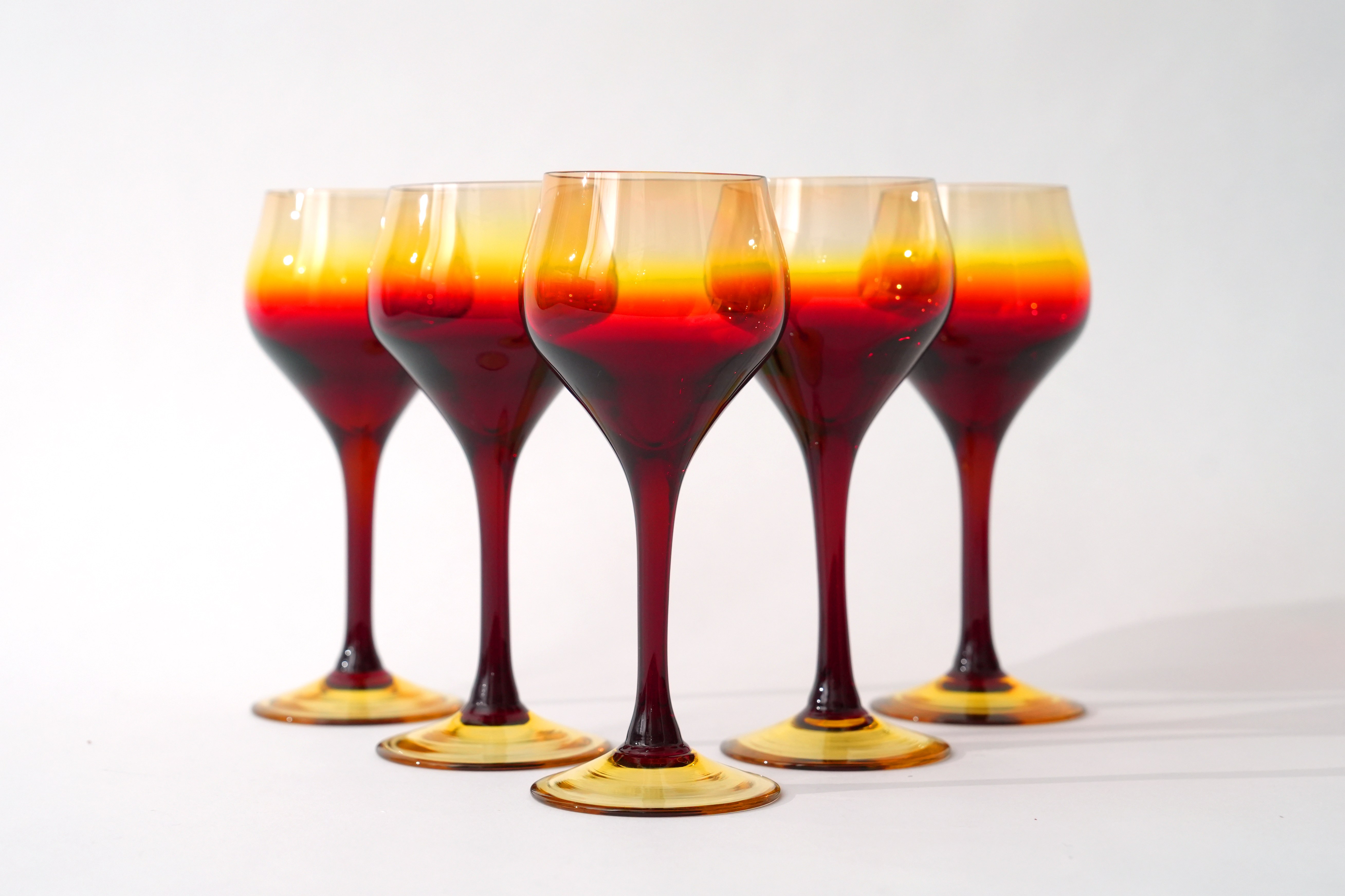 Komplet 5 szklanych kieliszków na wysokiej nóżce w ognistym kolorze.