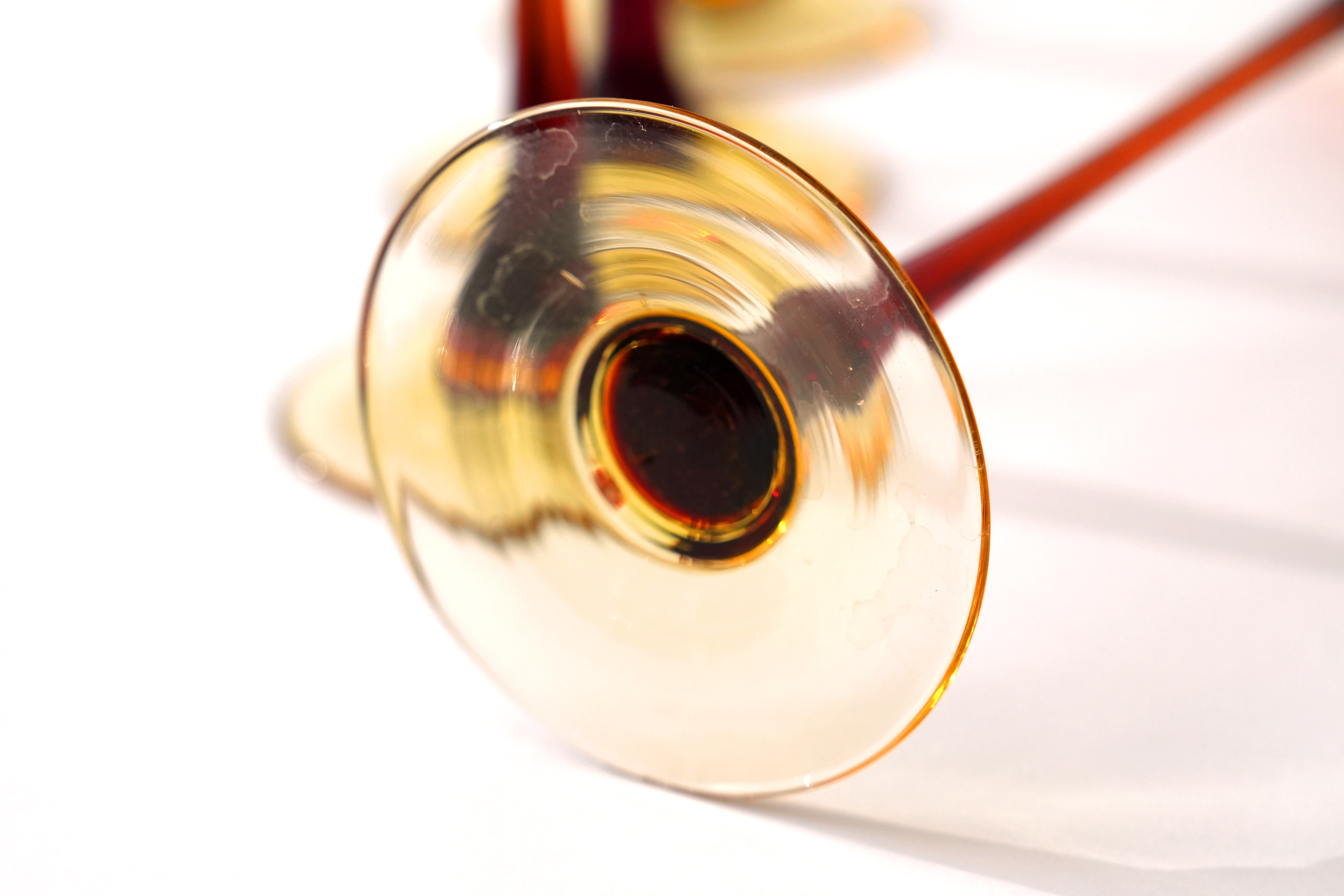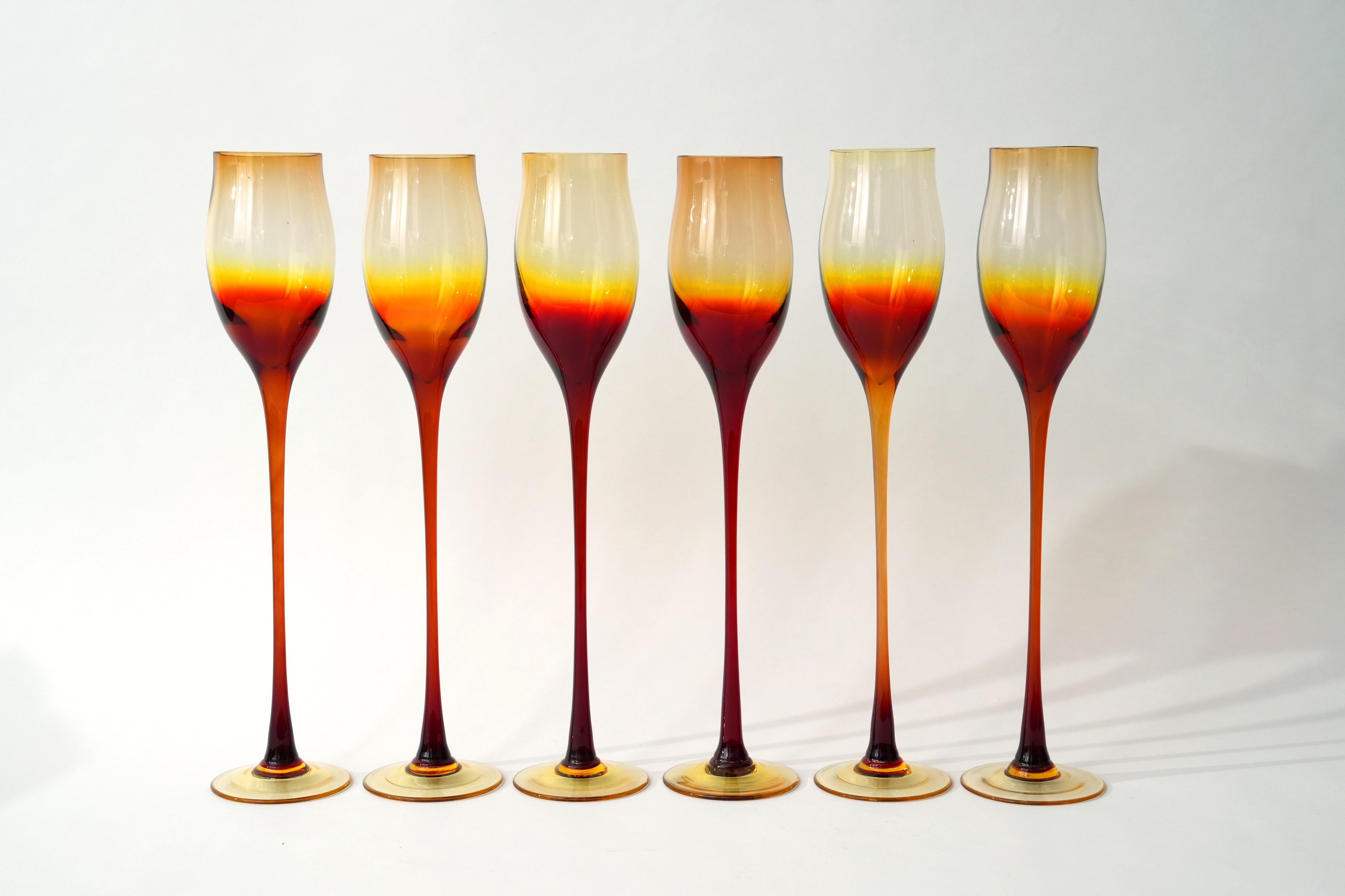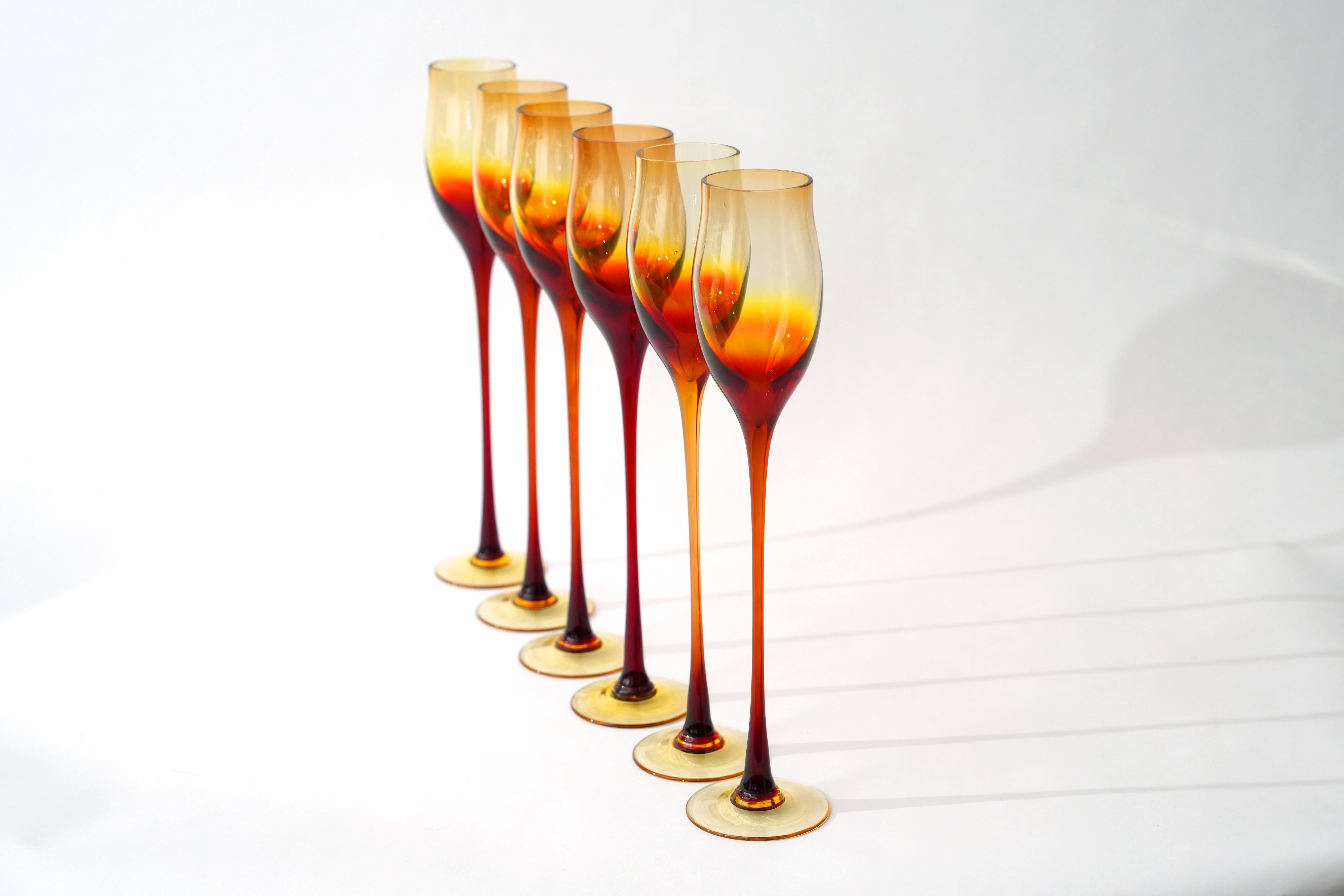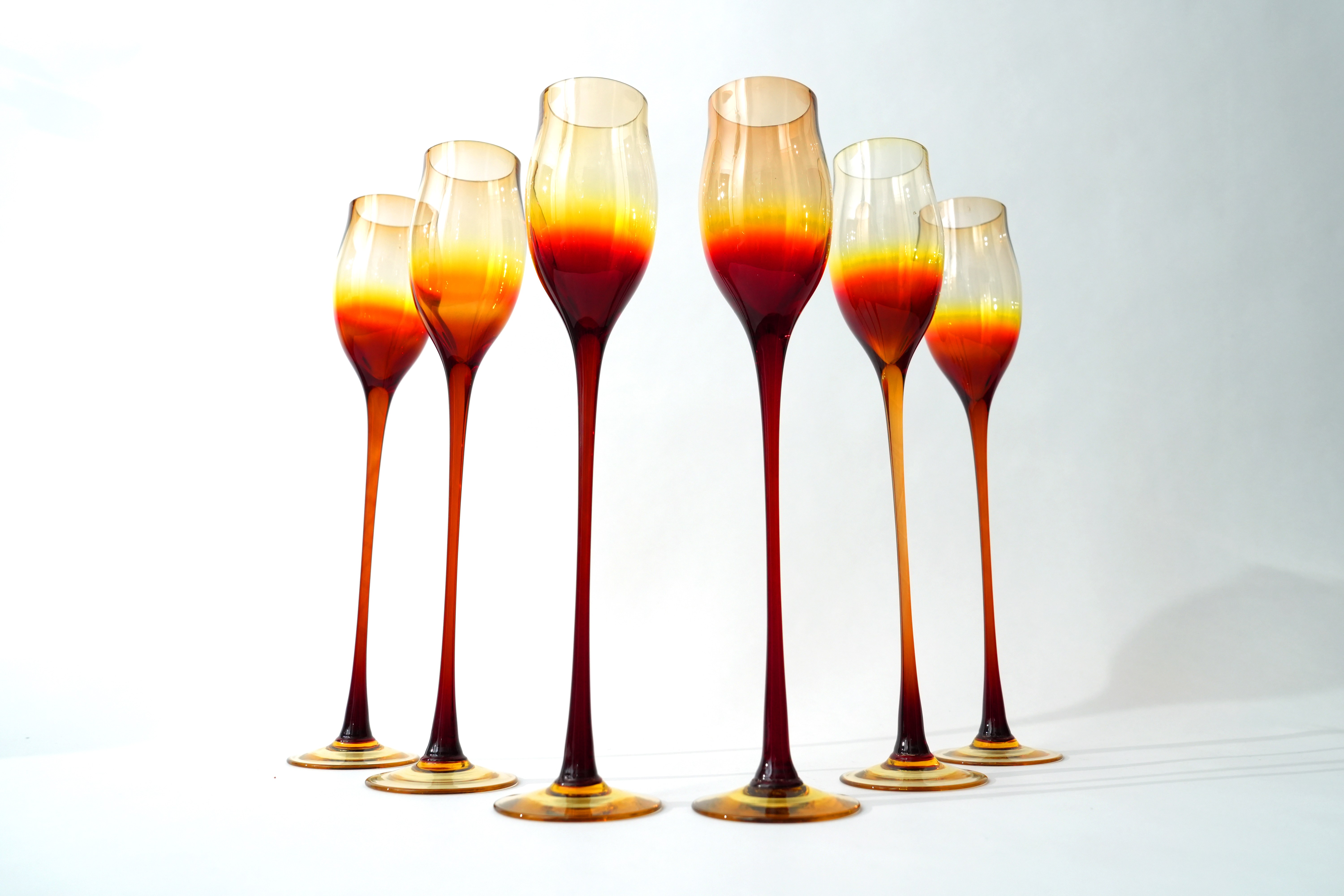 Komplet 6 szklanych kieliszków na wysokiej nóżce w ognistym kolorze.