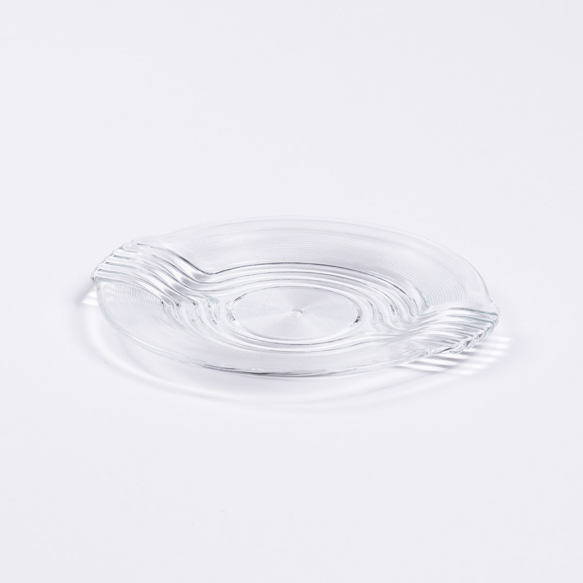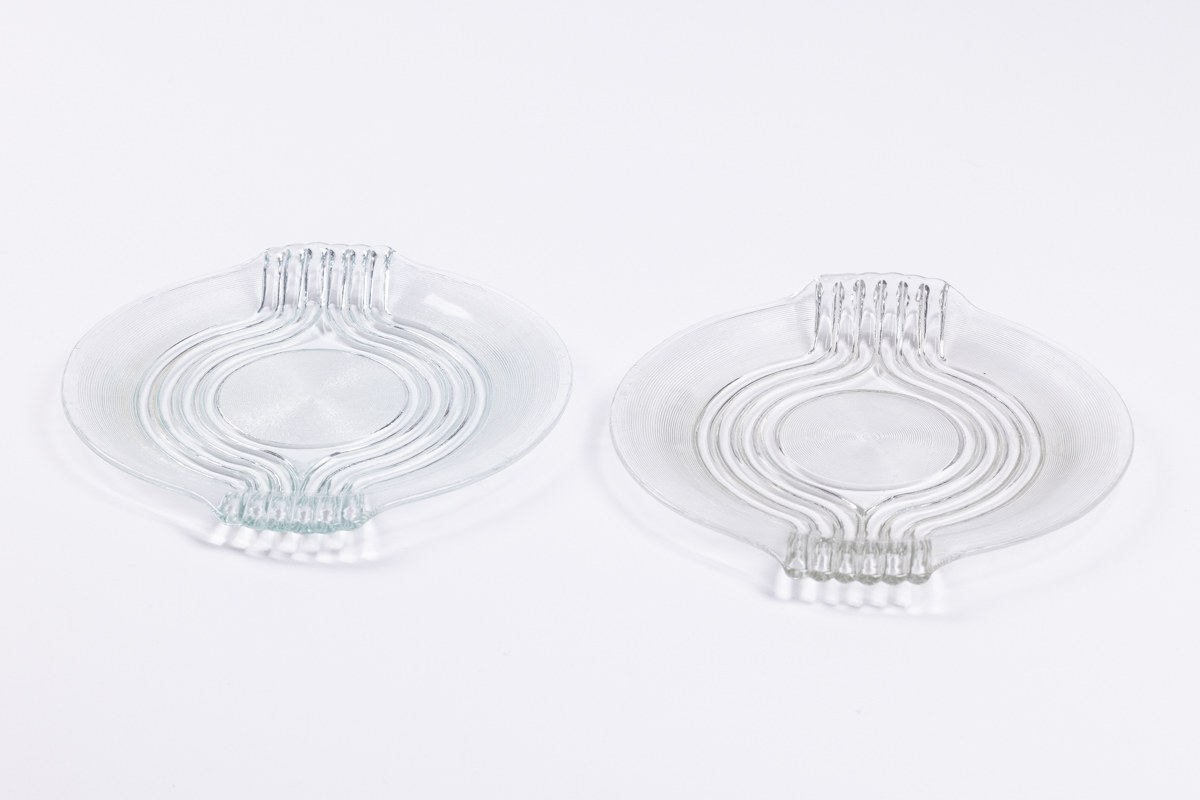 Huta Szkła Gospodarczego "Ząbkowice", lata 70. XX w., szkło sodowe, prasowane, bezbarwne, talerz duży śr. 26 cm, talerzyki deserowe śr. 18 cm
