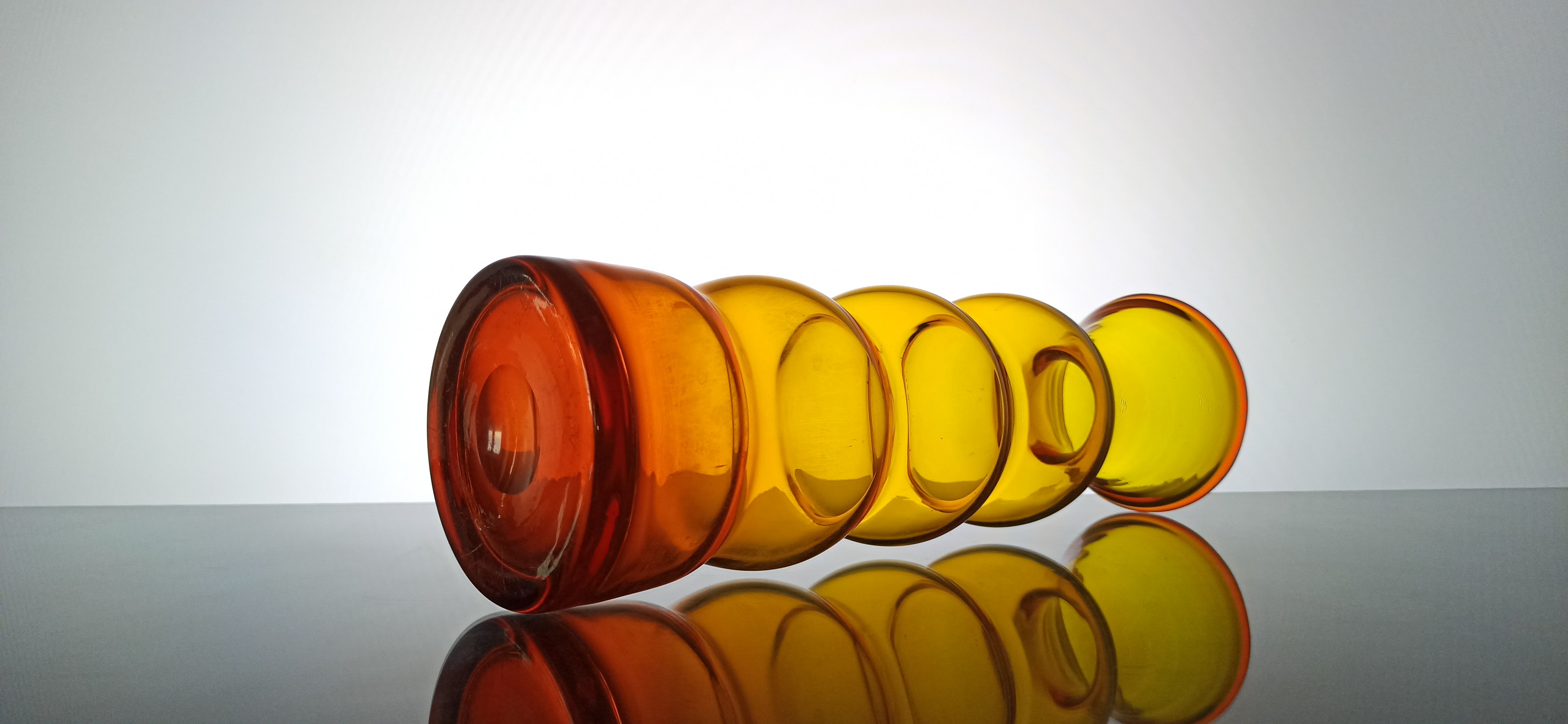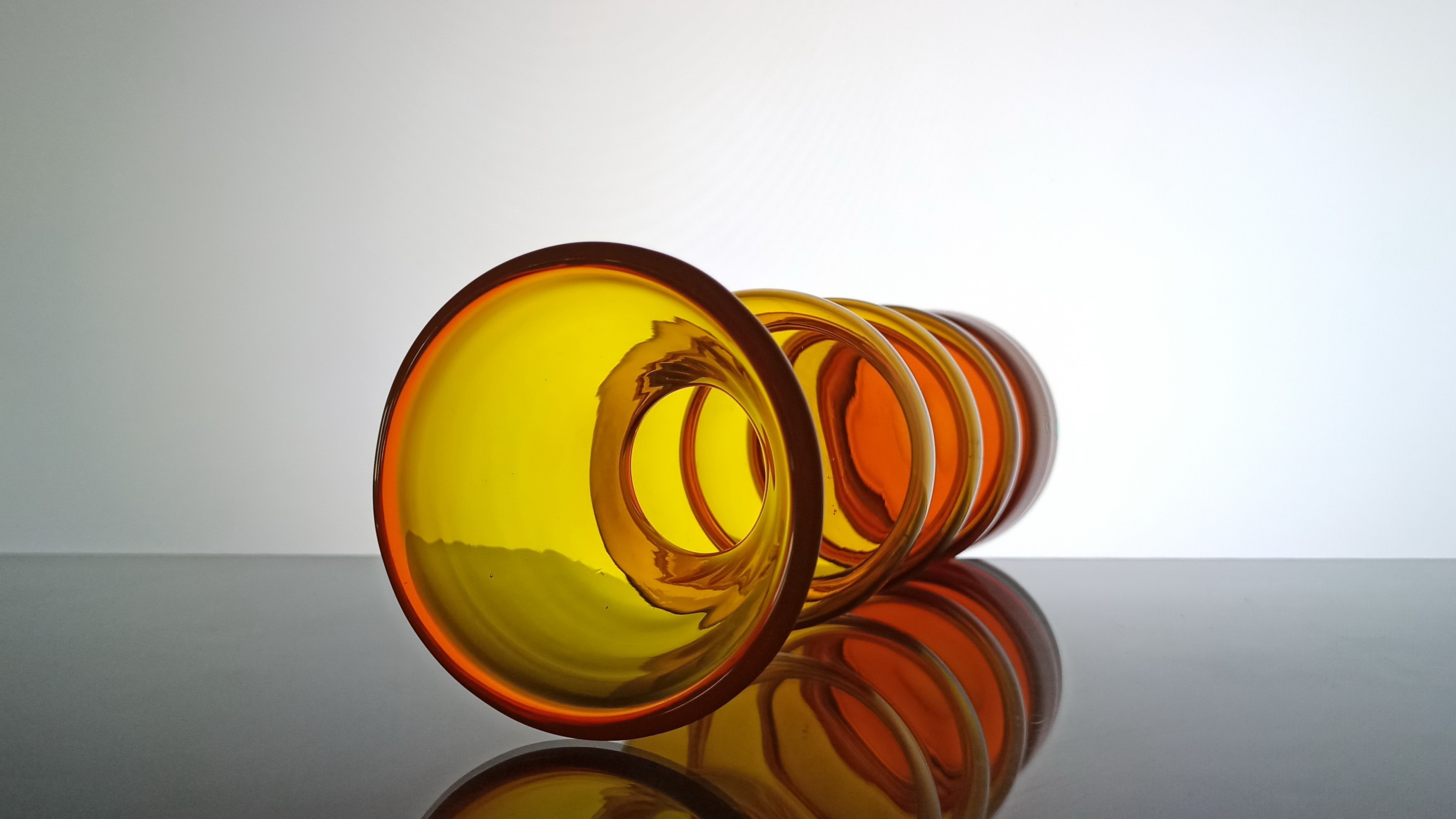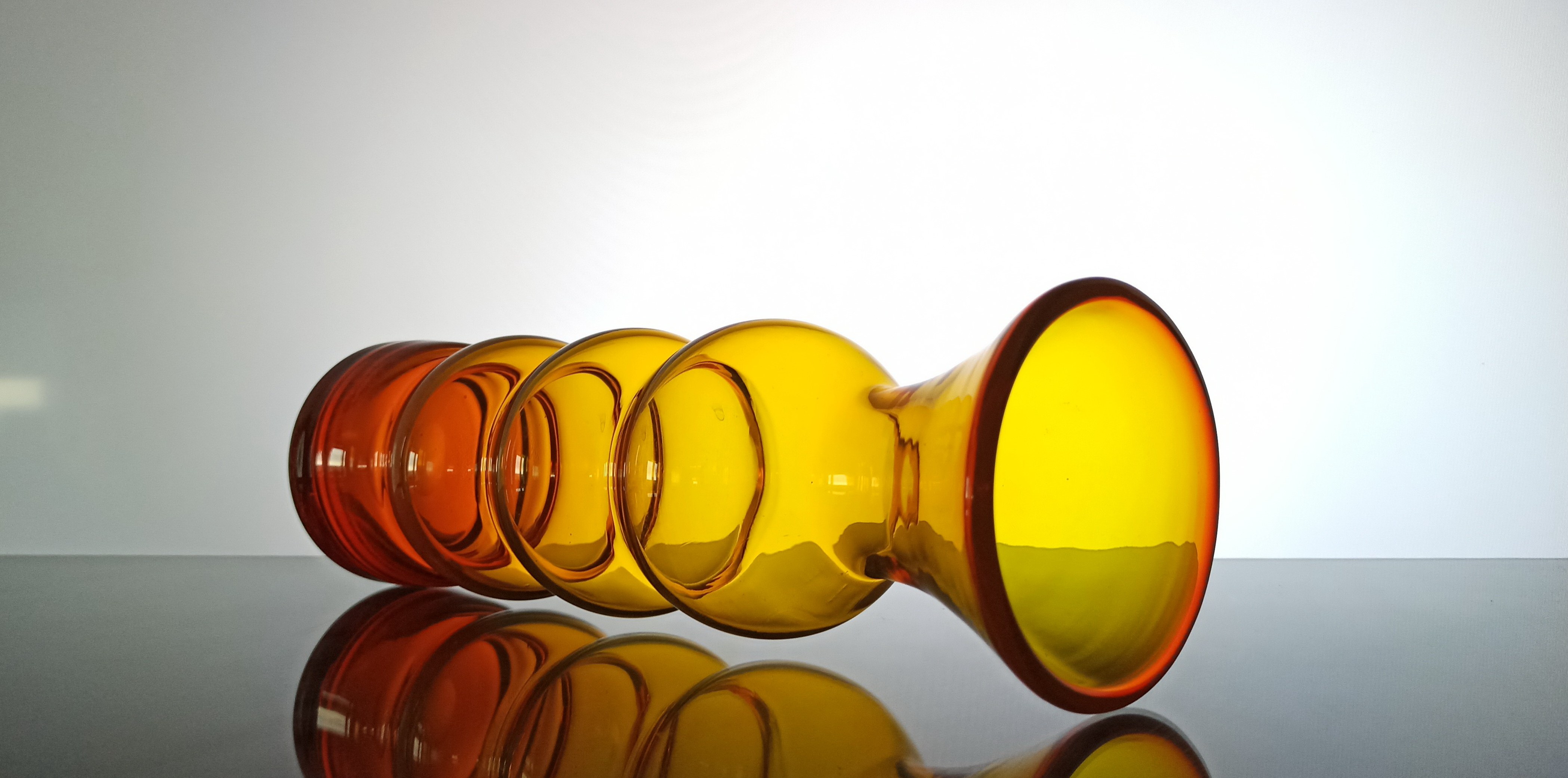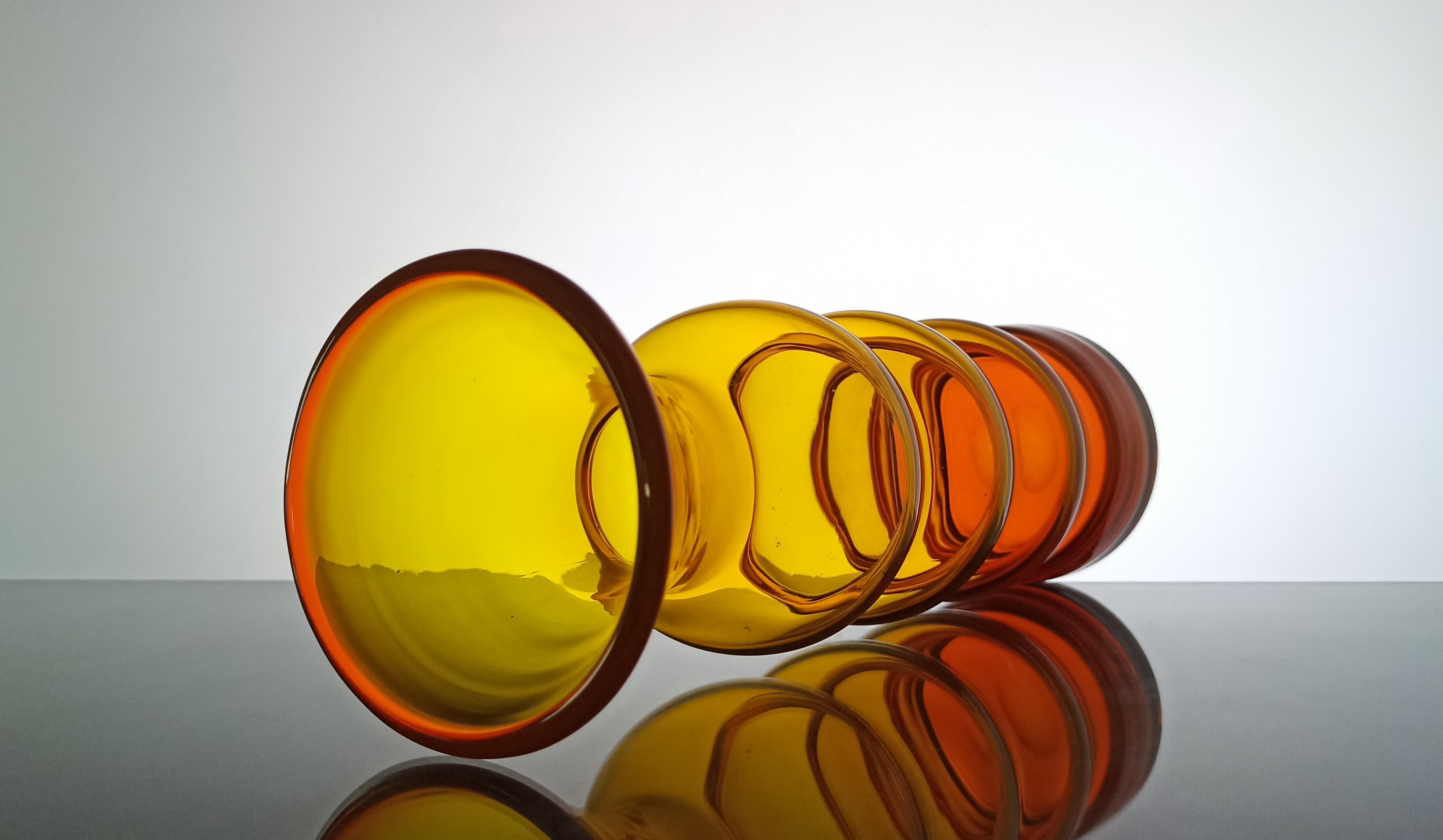 szkło sodowe, barwione w masie, kolor pomarańczowy, transparentny, obrzeże mleczne, wysokość 33cm