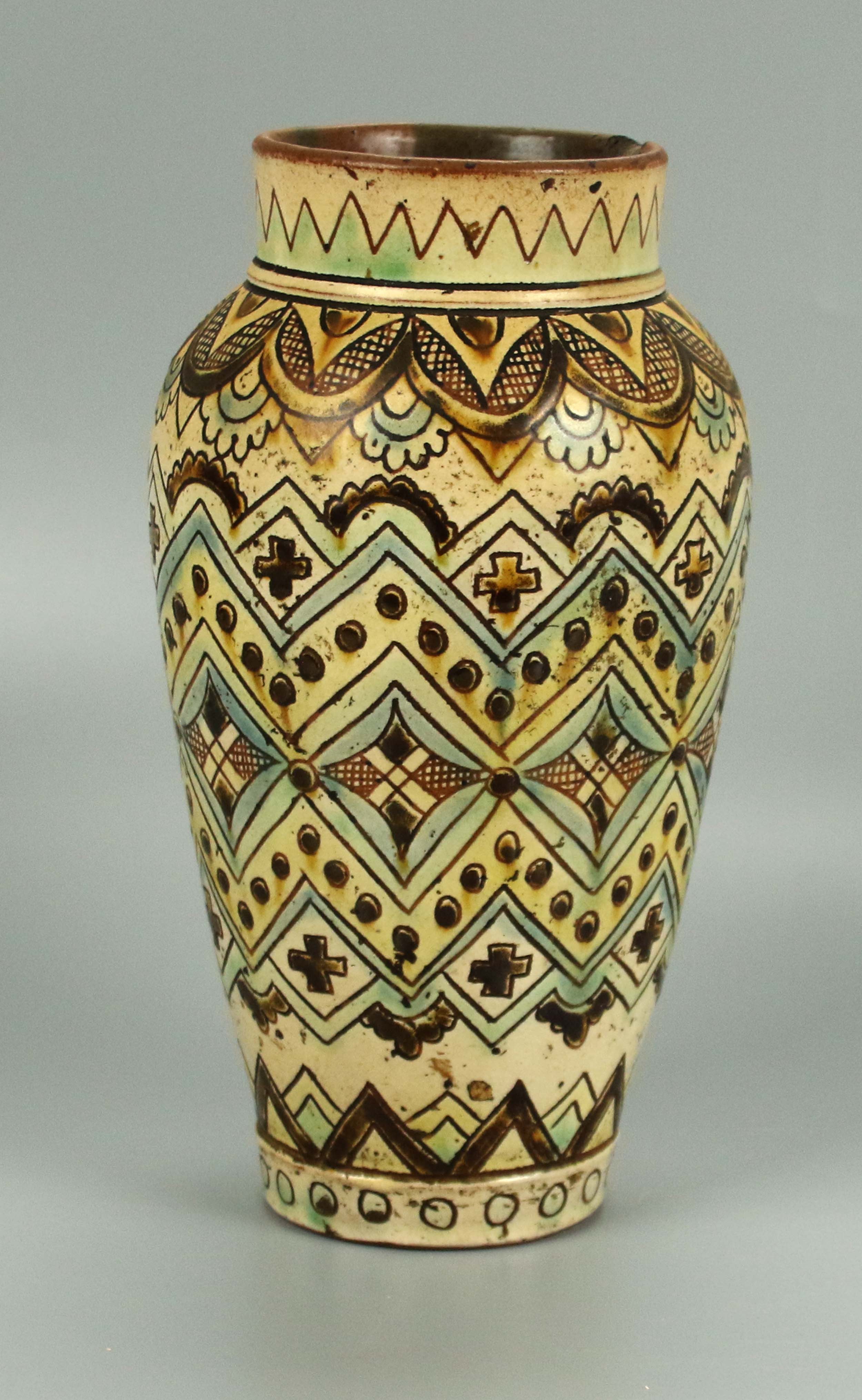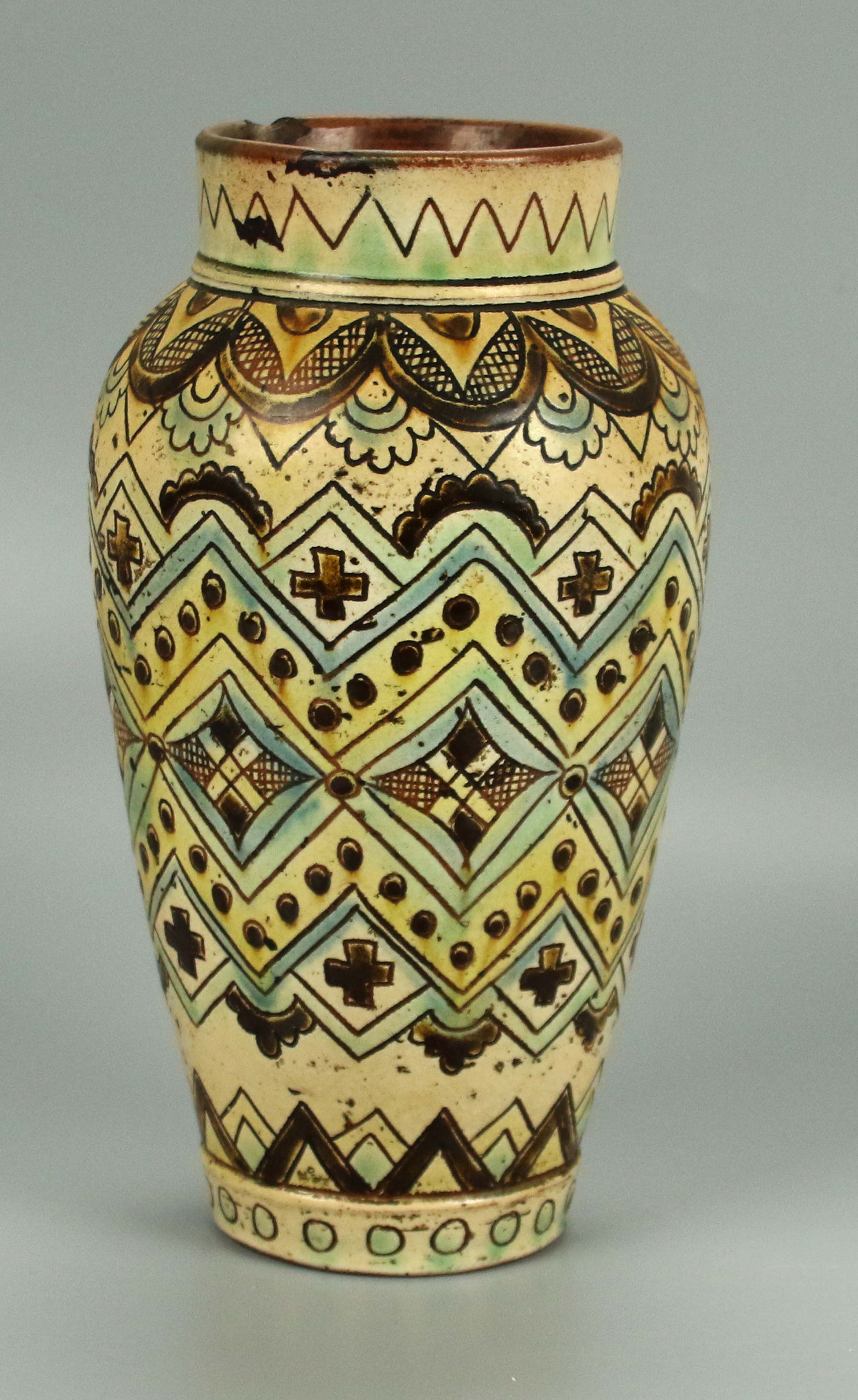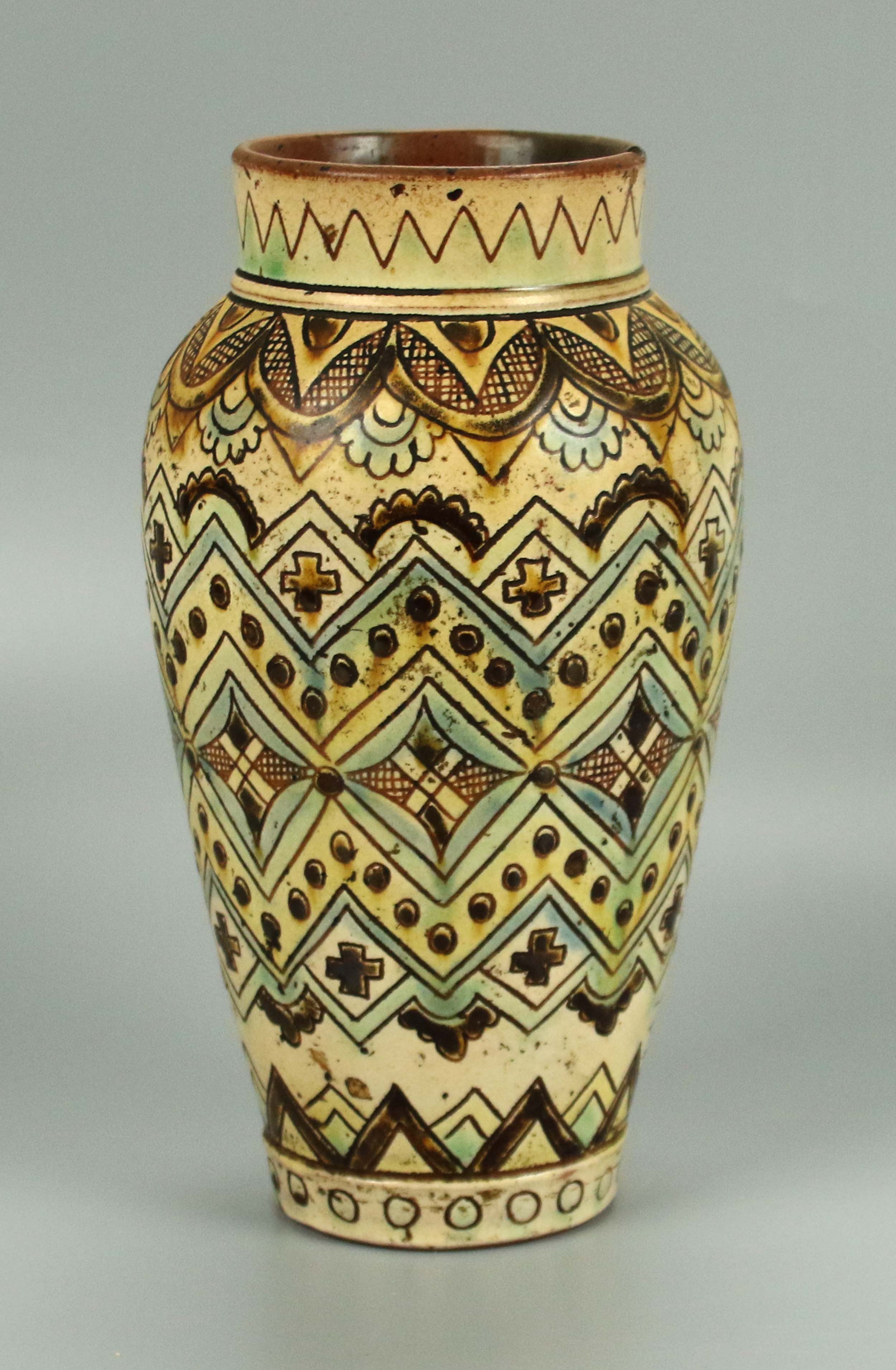 Wazon huculski, Pokucie, 1 poł. XX w. Wazon szkliwiony, niesygnowany. Wysokość 20 x 7 x 12 cm. Punktowy odprysk na górnej krawędzi.