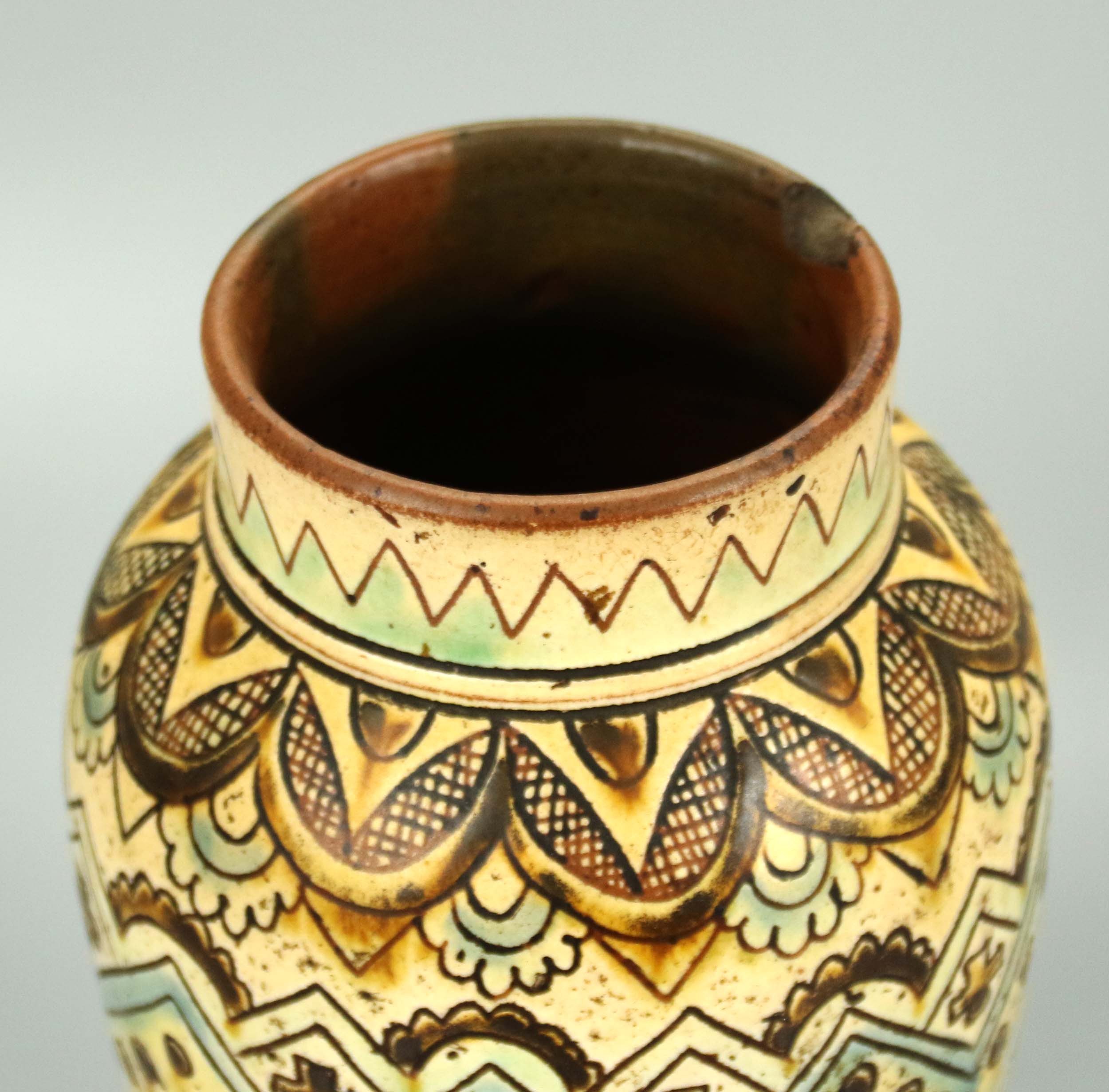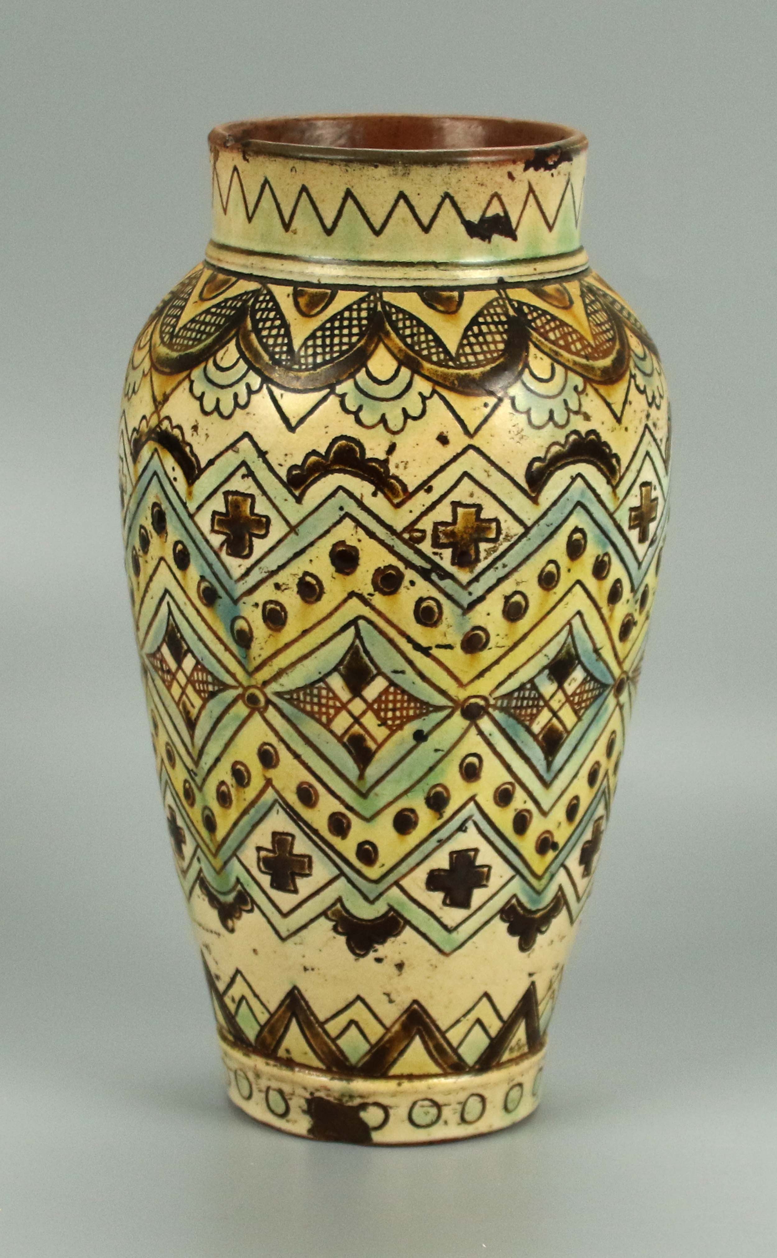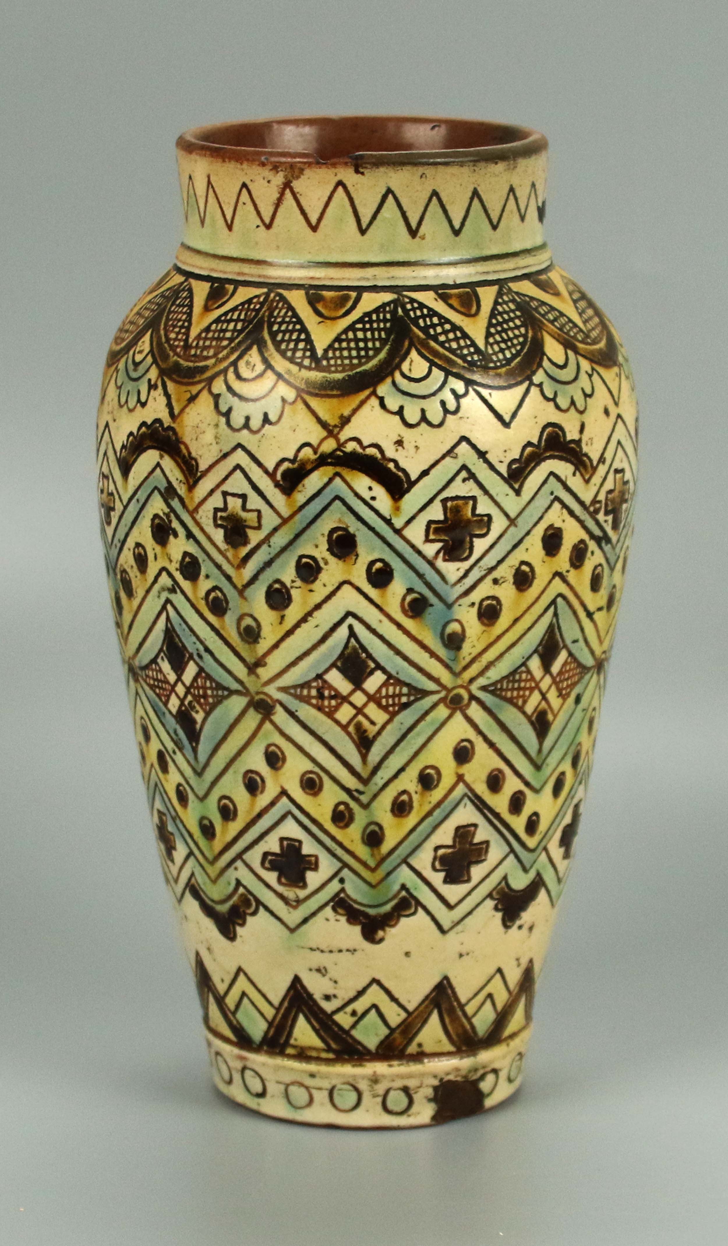 Wazon huculski, Pokucie, 1 poł. XX w. Wazon szkliwiony, niesygnowany. Wysokość 20 x 7 x 12 cm. Punktowy odprysk na górnej krawędzi.