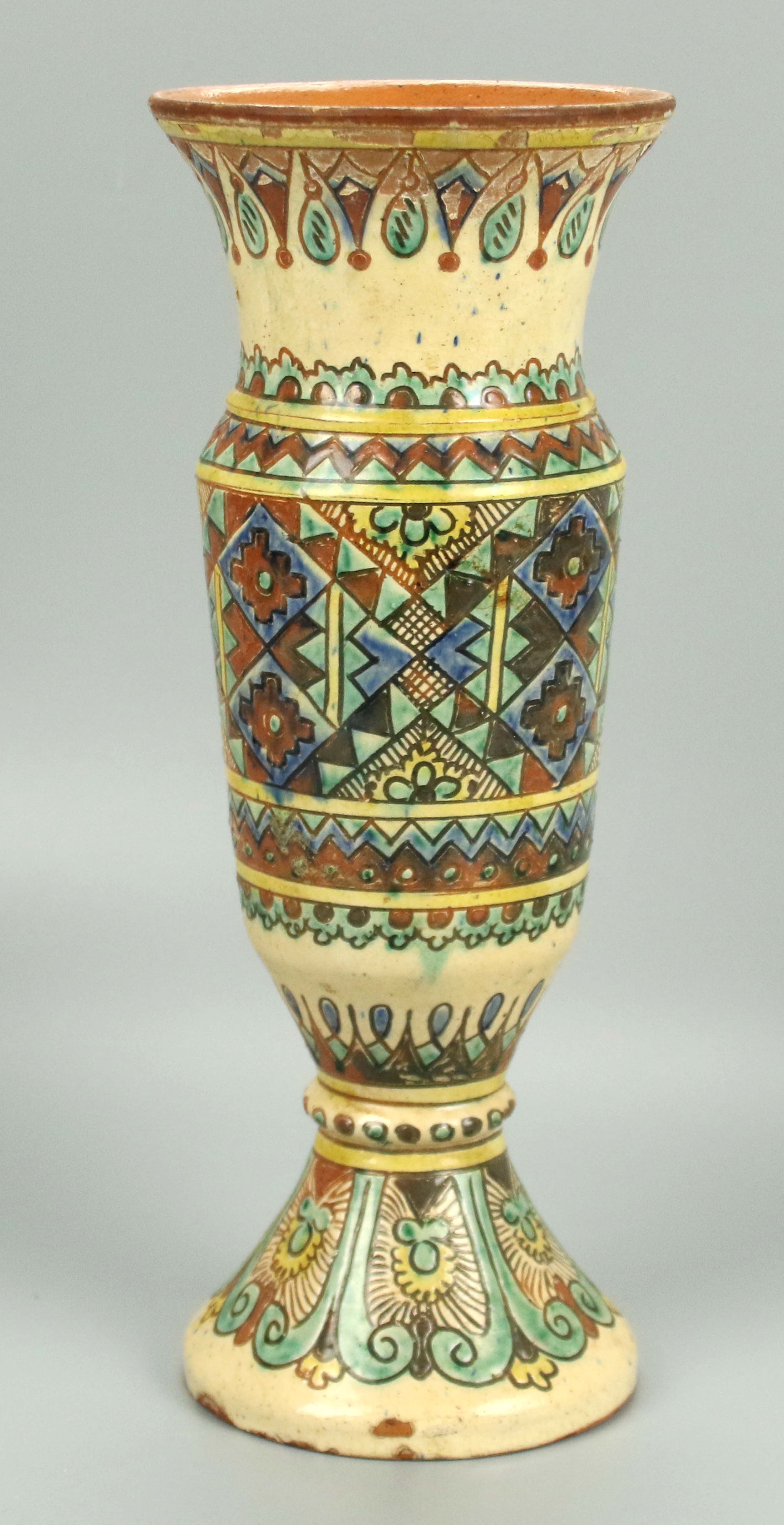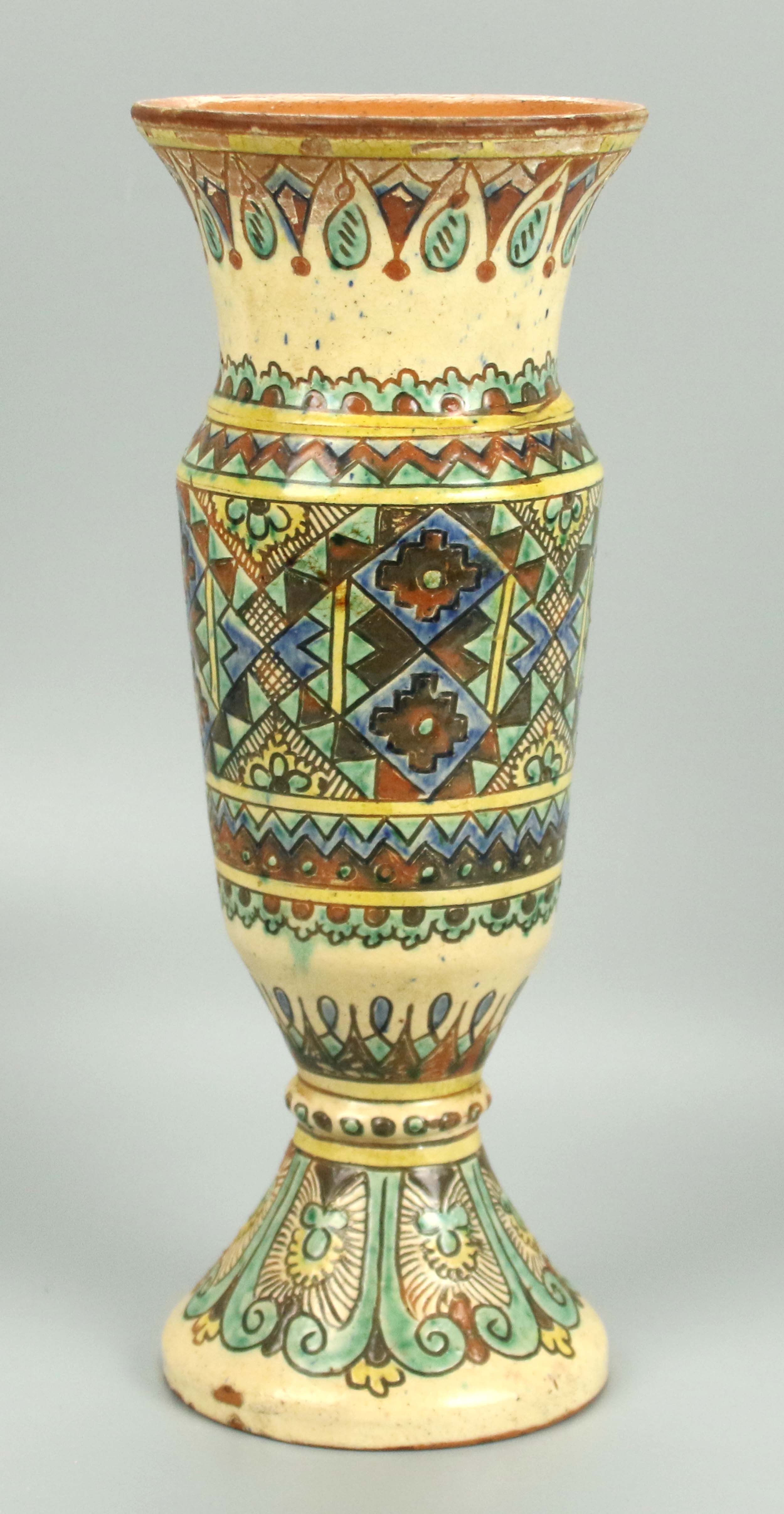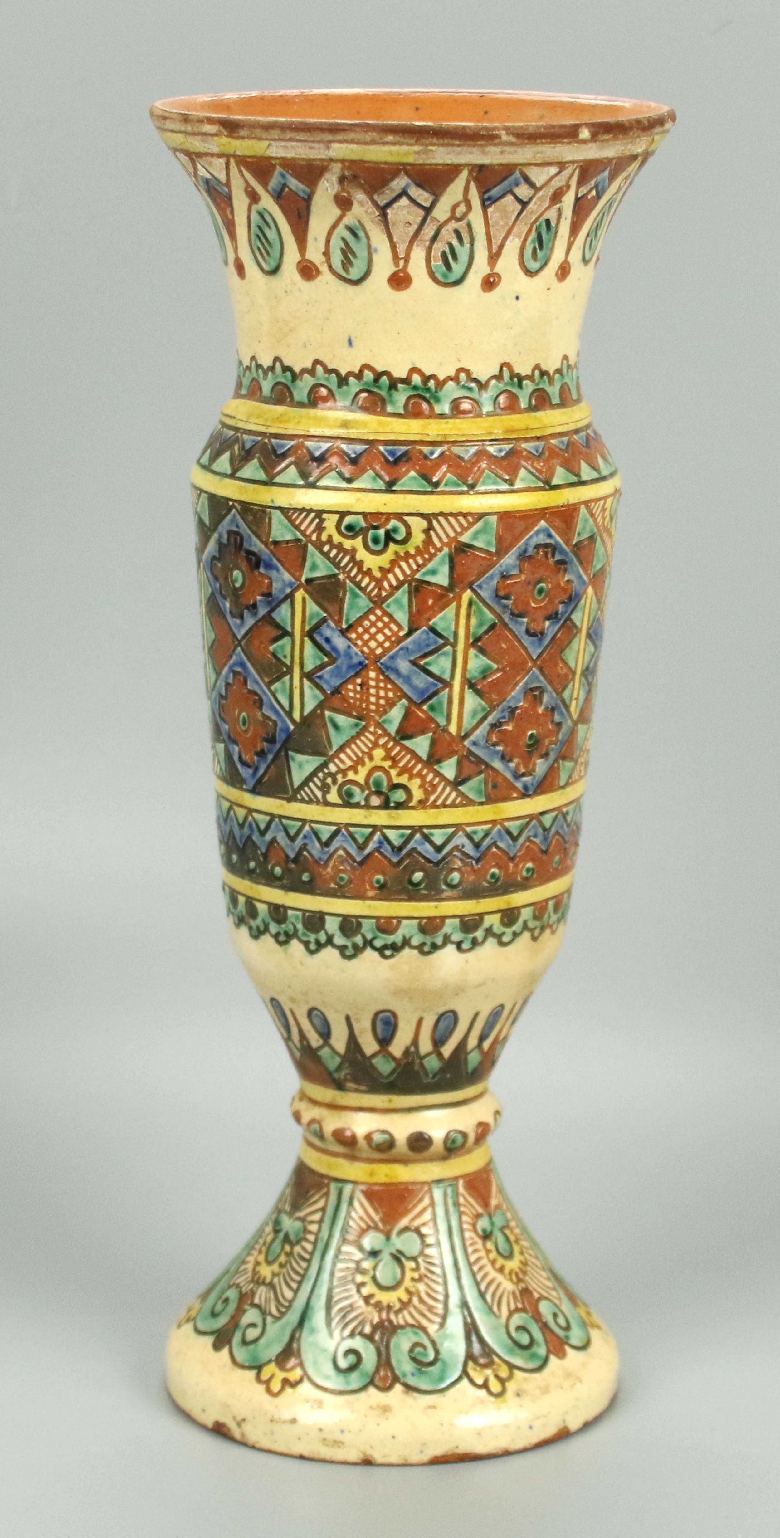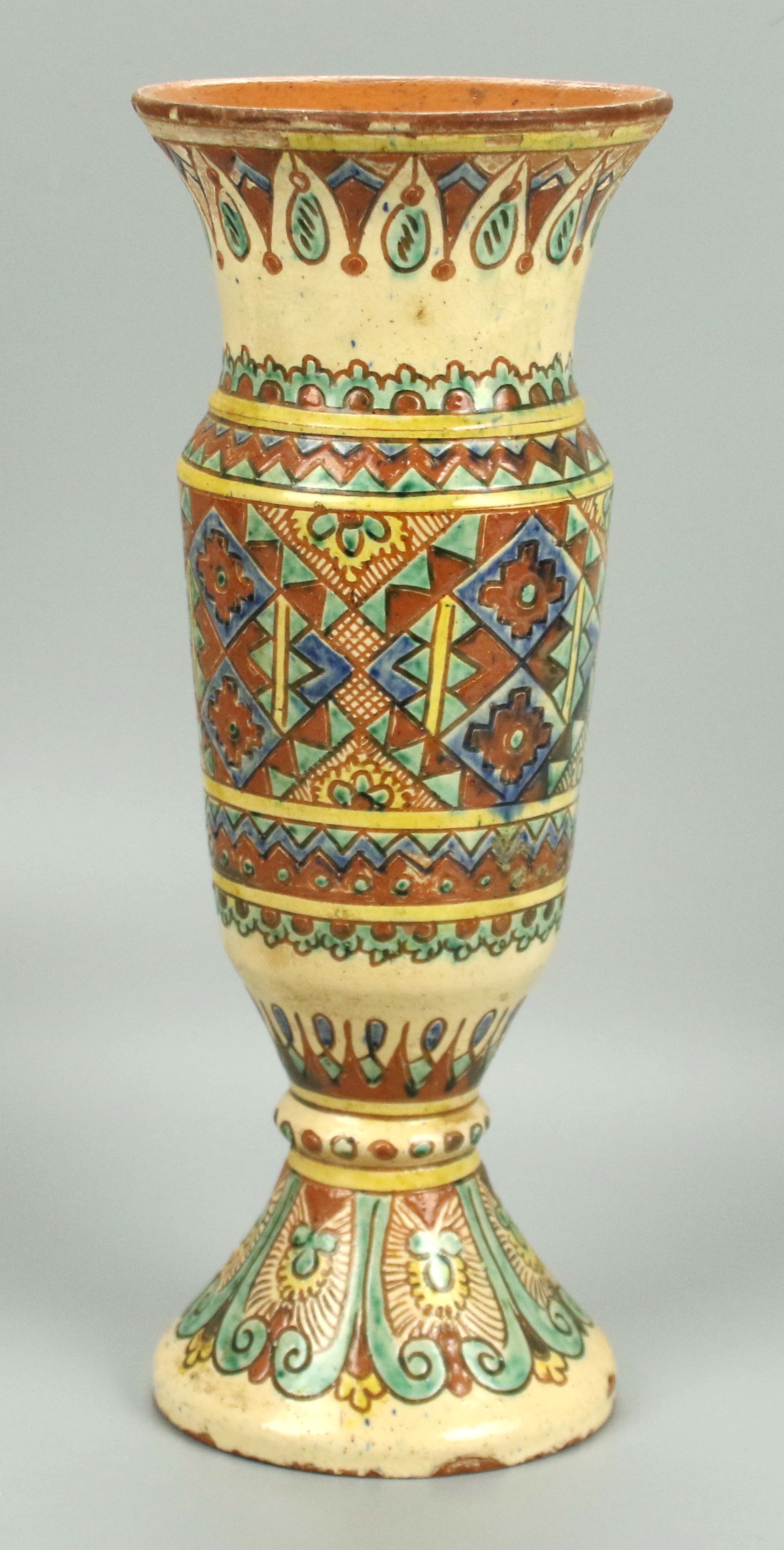 Wazon huculski, Pokucie, 1 poł. XX w. Duży wazon szkliwiony, niesygnowany. Wysokość 27,5 x 10 x 10,5 cm. Na podstawie pękniecie przy wypale.
