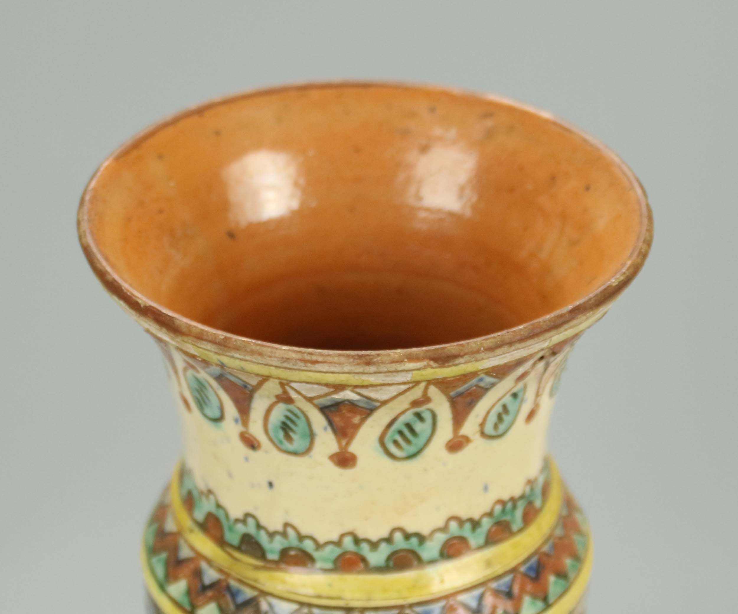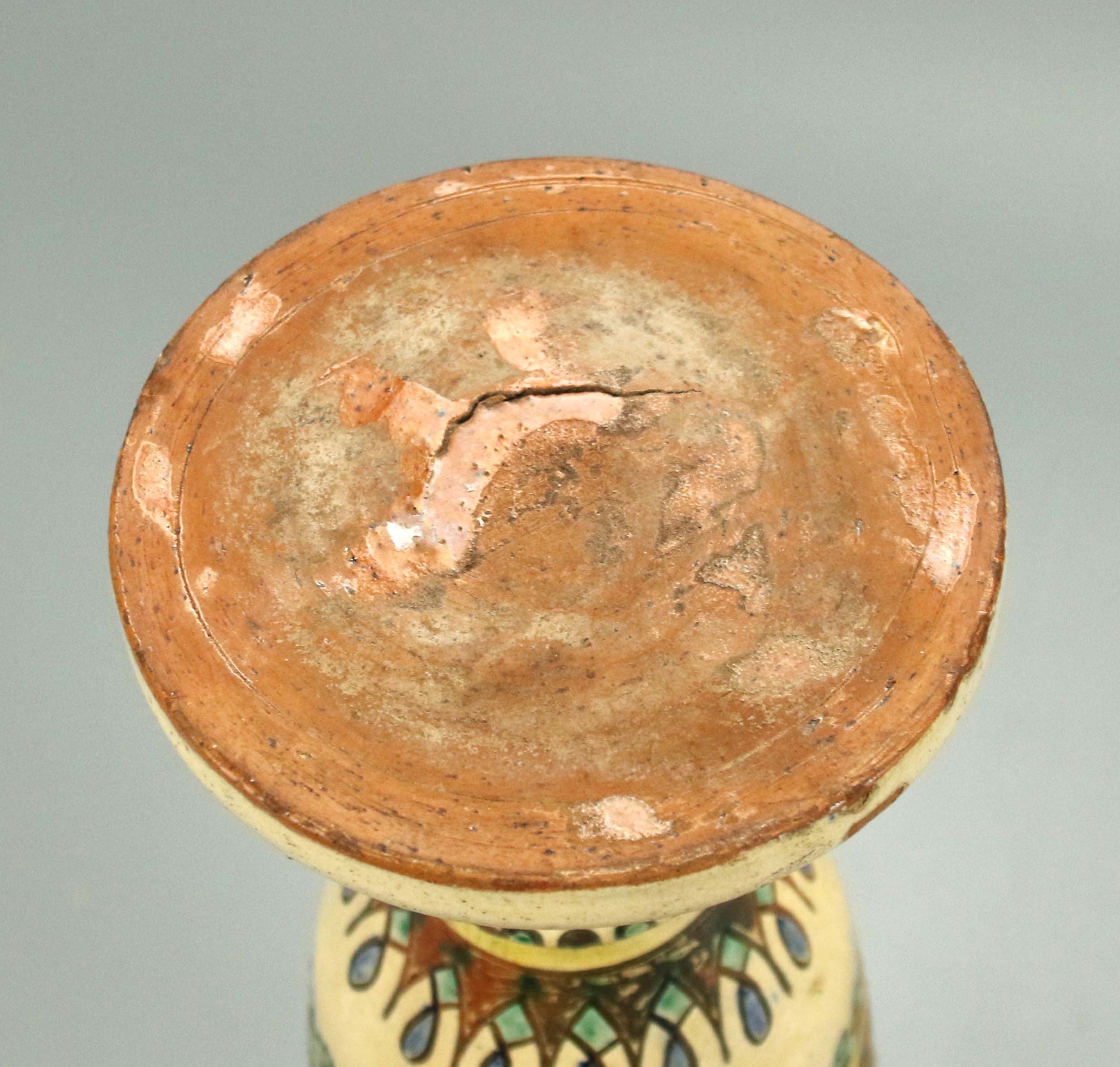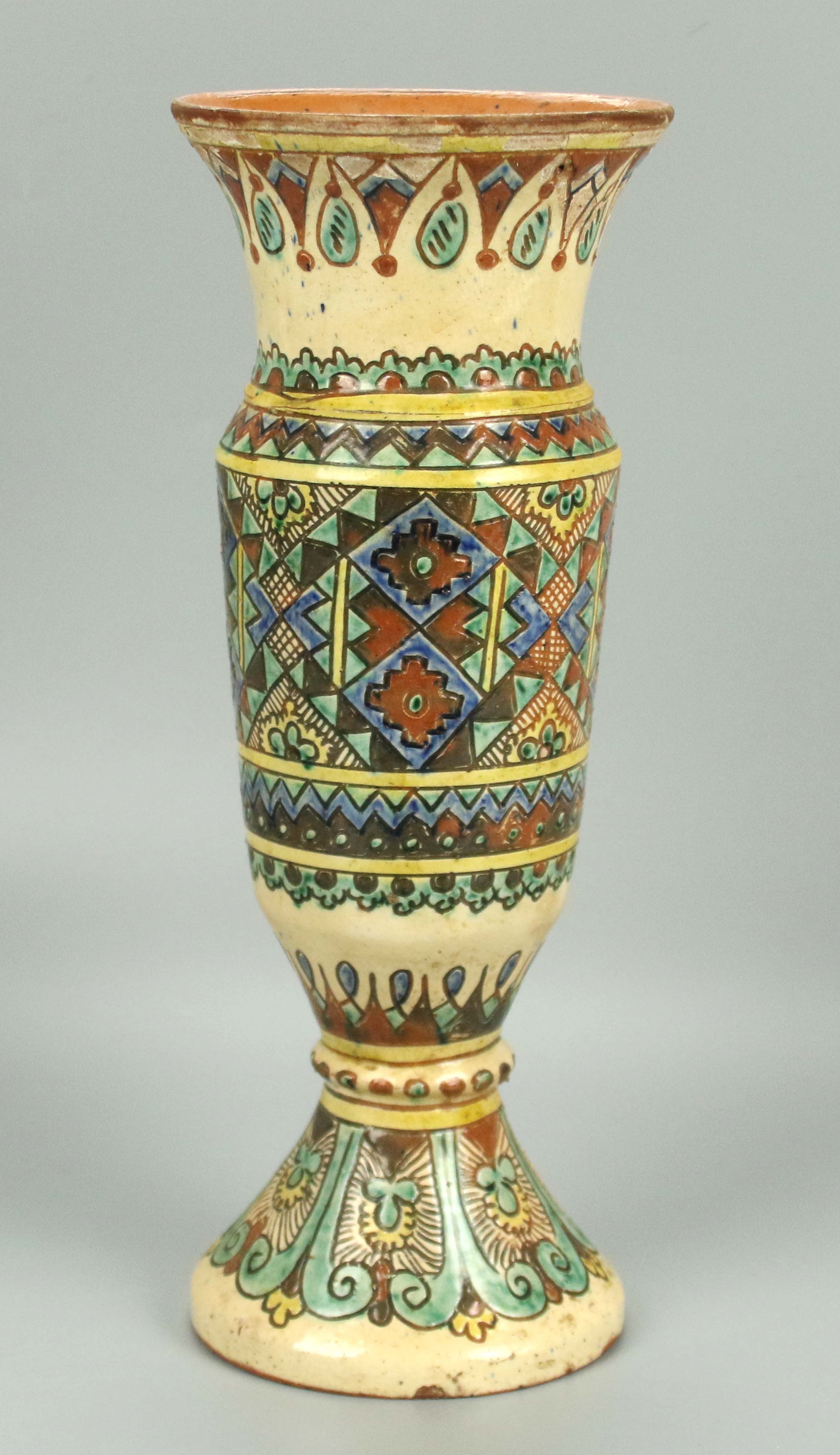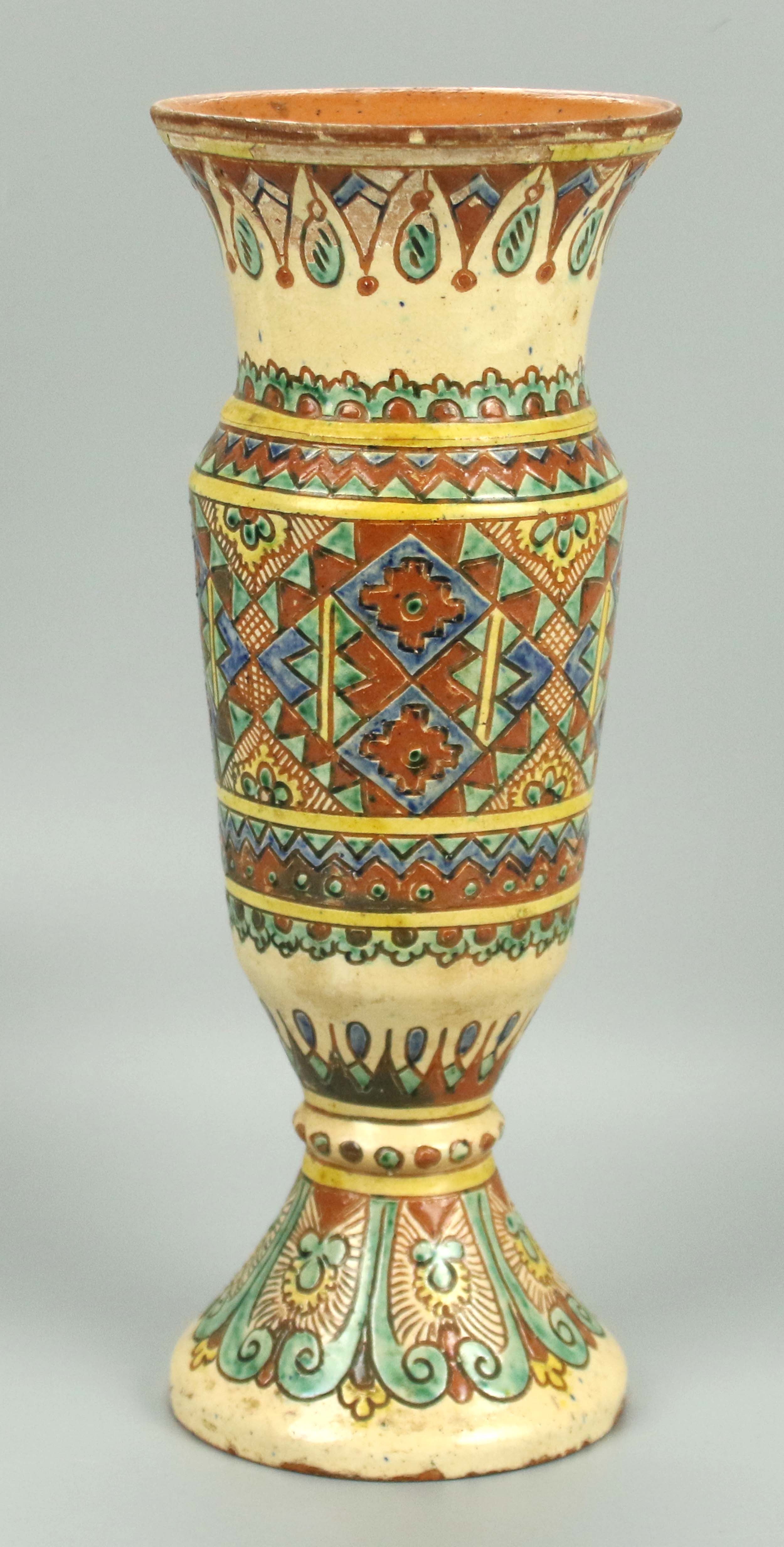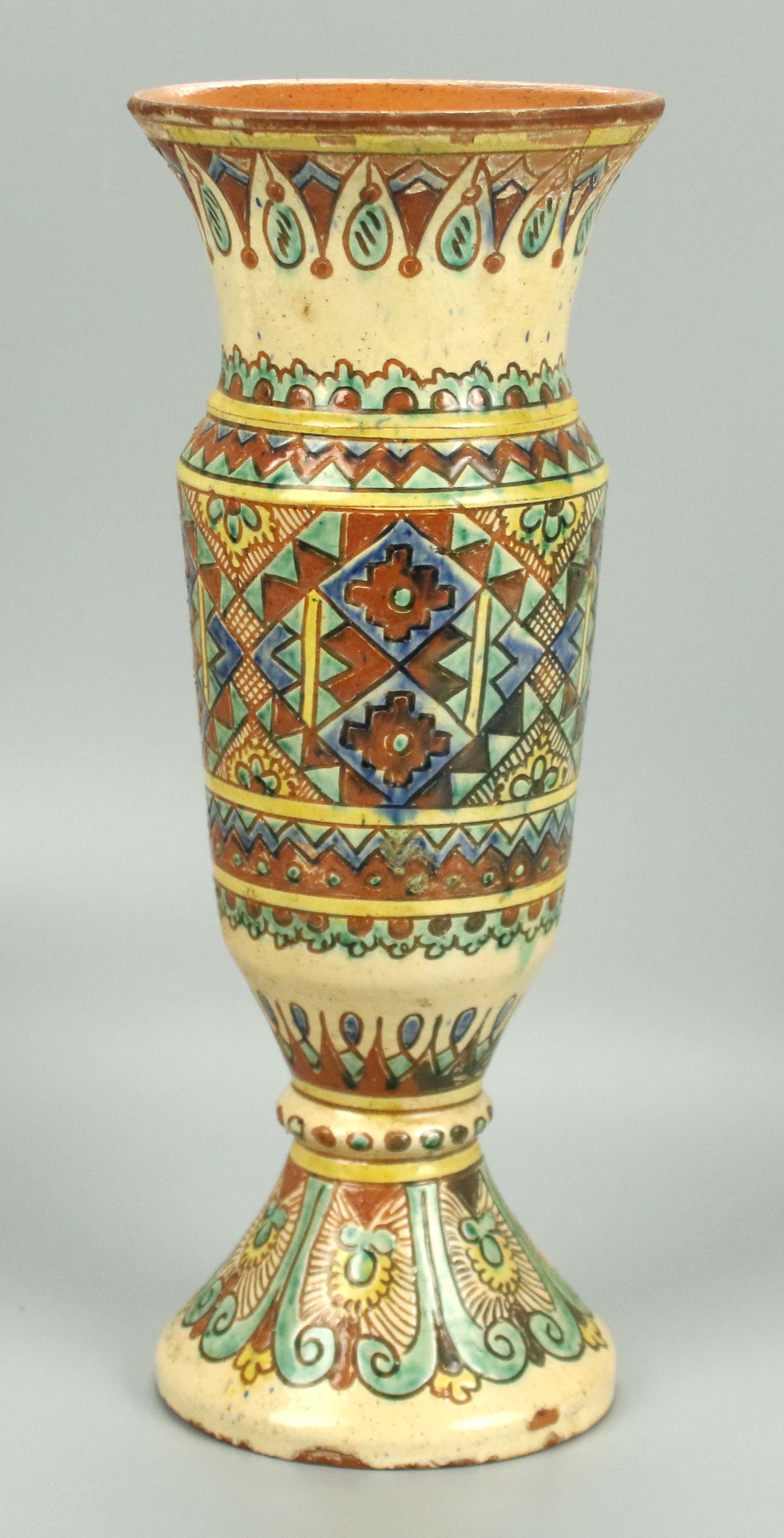 Wazon huculski, Pokucie, 1 poł. XX w. Duży wazon szkliwiony, niesygnowany. Wysokość 27,5 x 10 x 10,5 cm. Na podstawie pękniecie przy wypale.