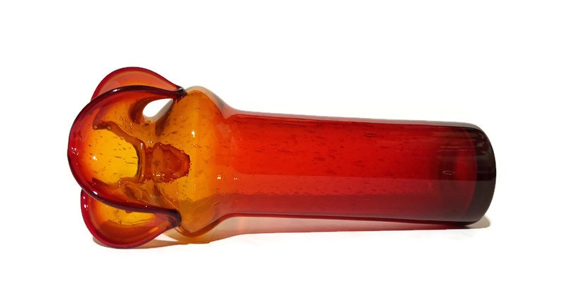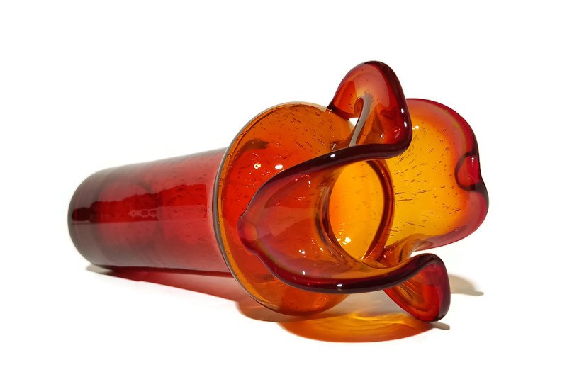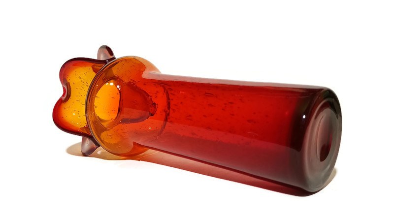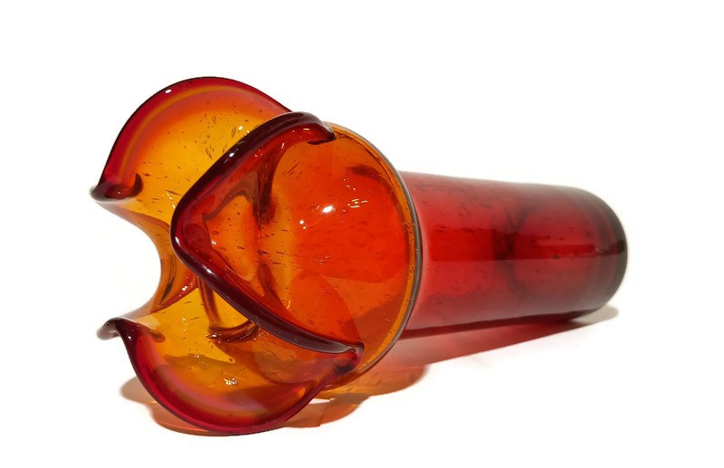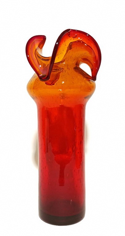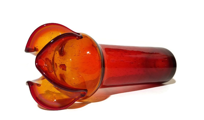 szkło barwione w masie, wysokość 29,5cm, kolor czerwony, tonowany, jaśniejący ku górze, obrzeże wlewu z intensywnie czerwoną obwódką i lekką żółtą smugą, szkło napowietrzone,