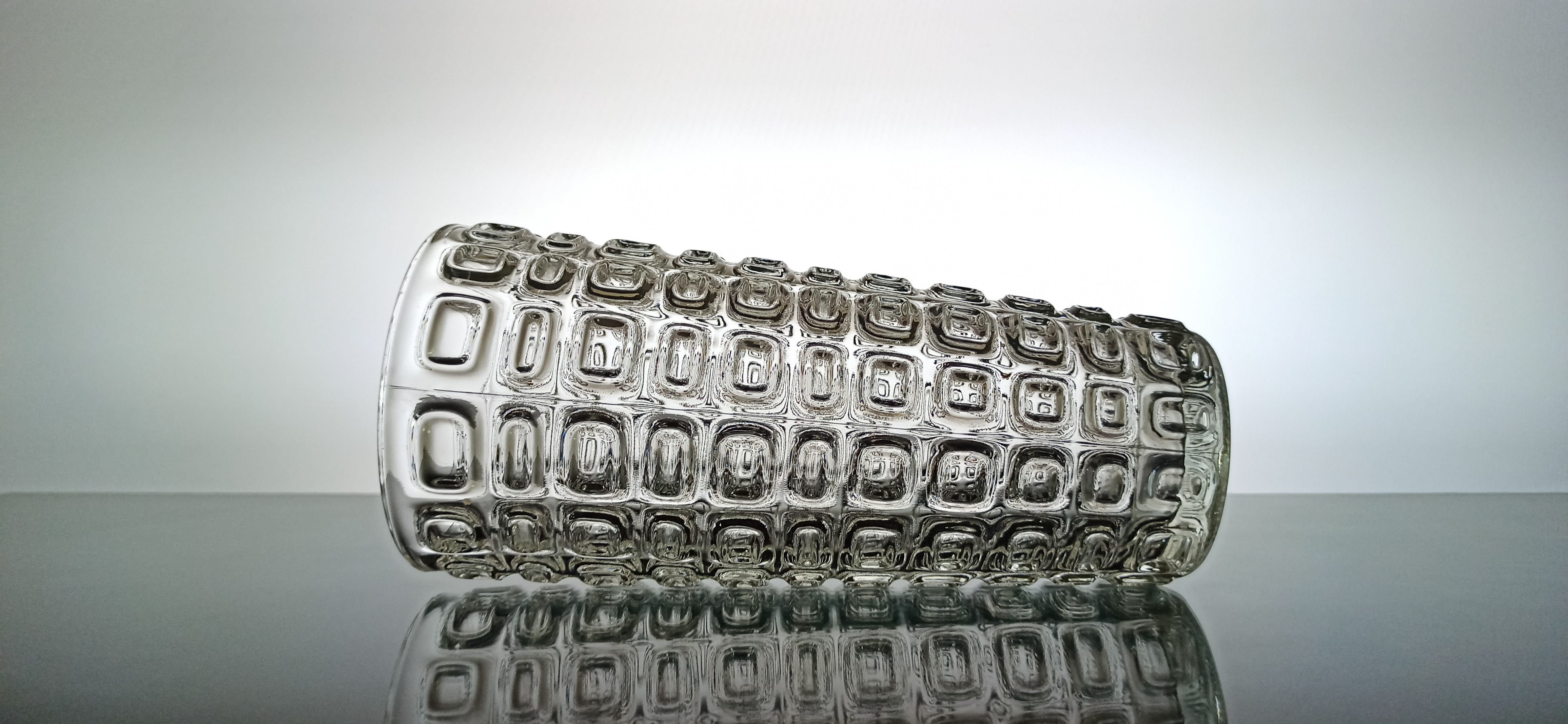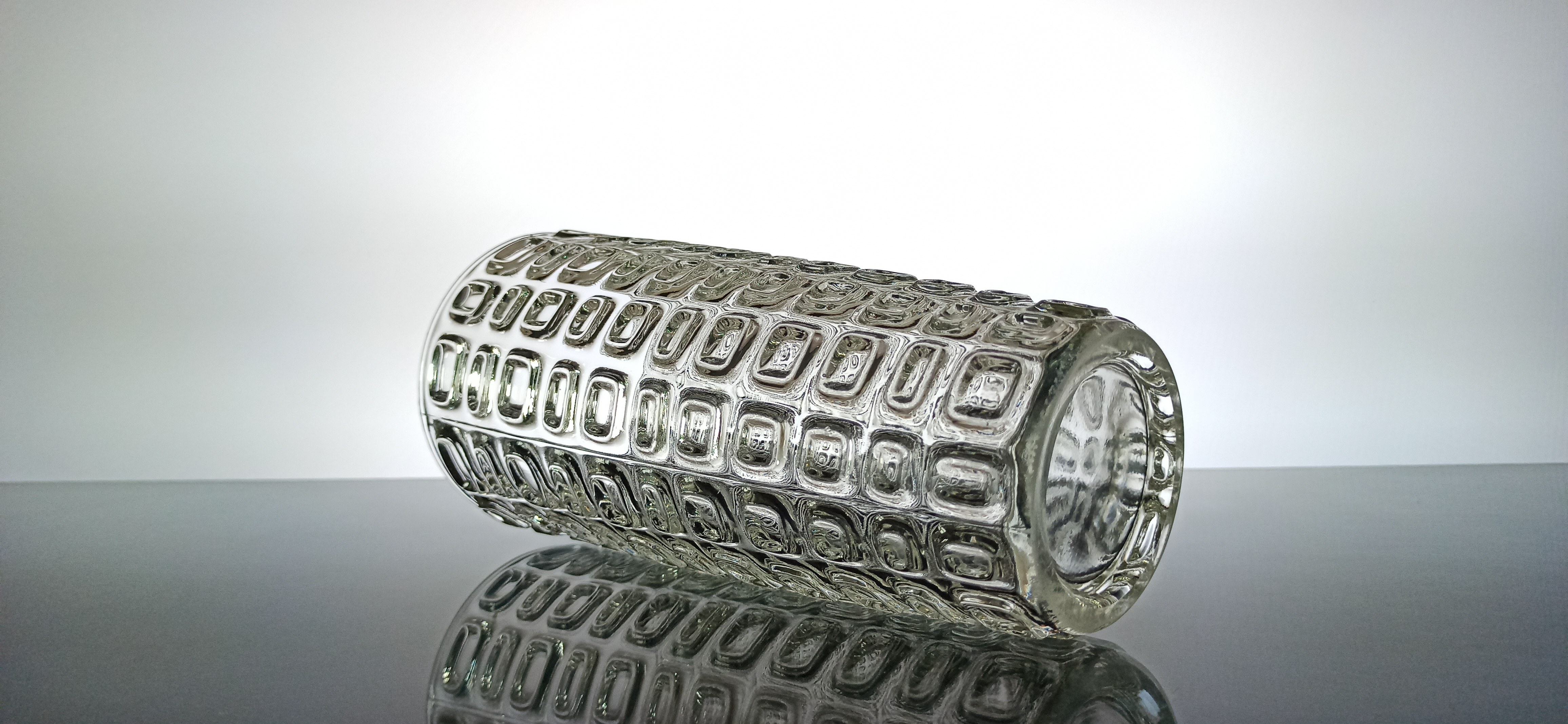 szkło sodowe, bezbarwne, prasowane, wysokość 22,5cm, stan bardzo dobry-, małe rysy na podstawie