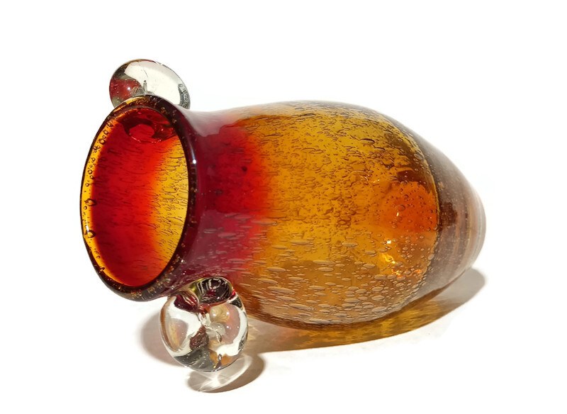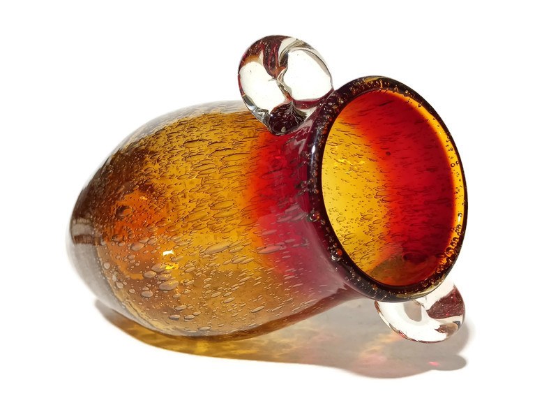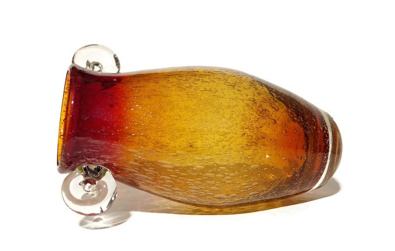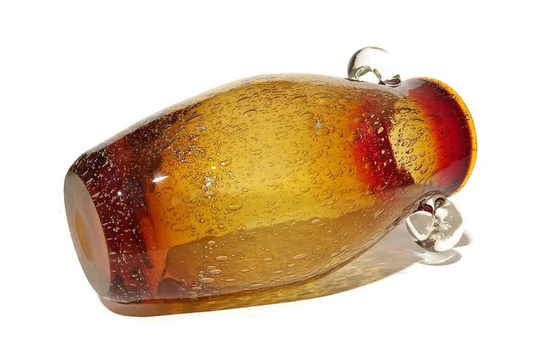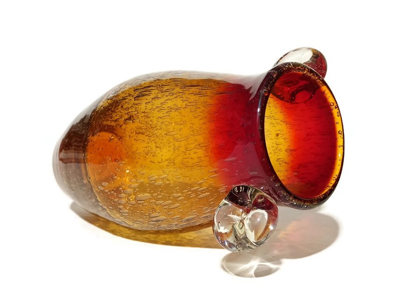 szkło sodowe barwione w masie, kolor tonowany, mocne napowietrzenie szkła, transparentne ozdobne uchwyty, podstawa szlifowana z soczewką, wysokość 26cm