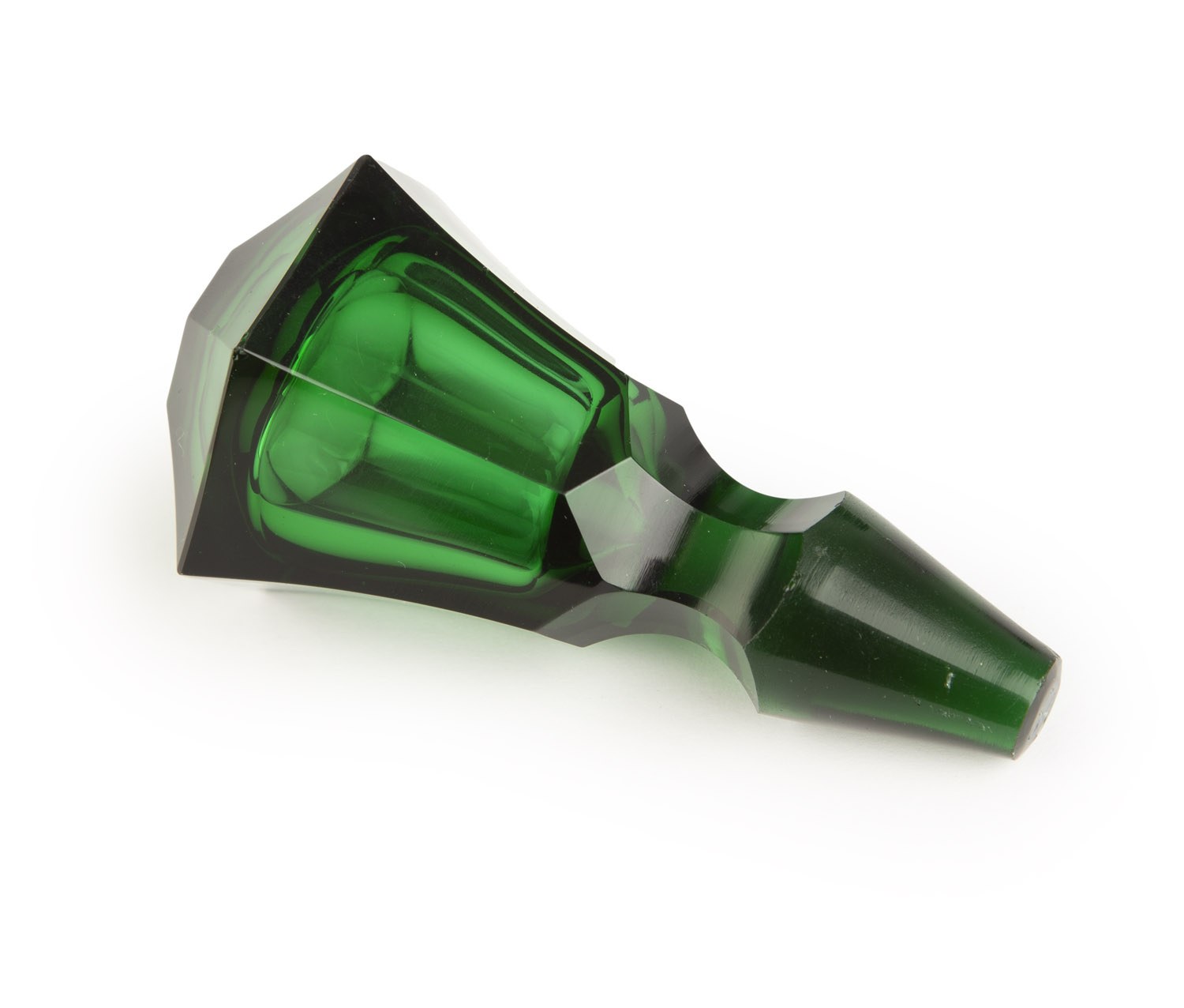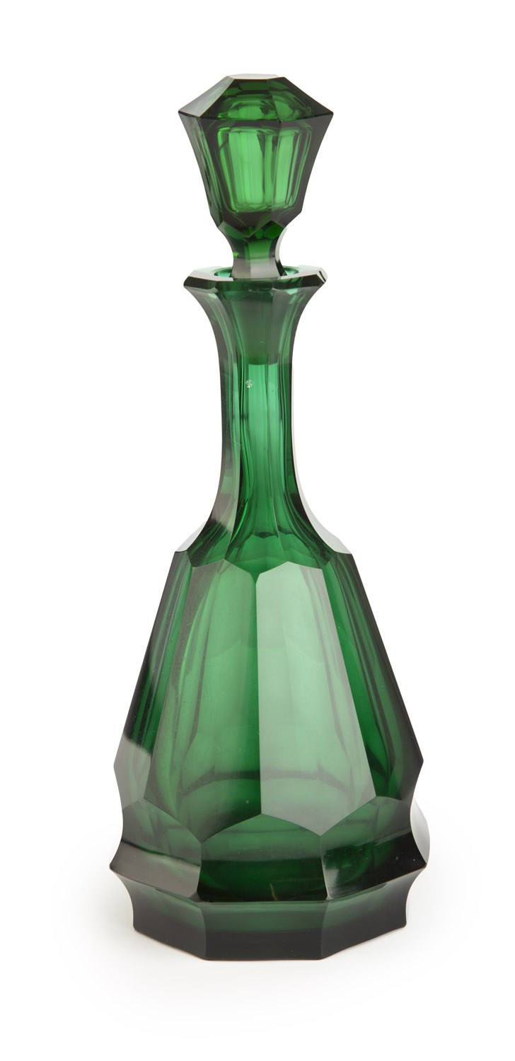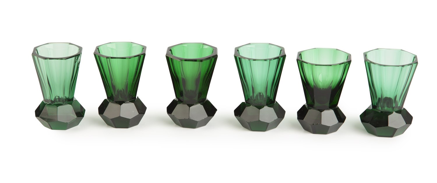 punktowe odpryski na rantach i wlewach kieliszków, liczne zarysowania na spodzie, osad wewnątrz karafki, dwa duże odpryski na kieliszkach, odpryski na rantach korka i wlewu karafki
