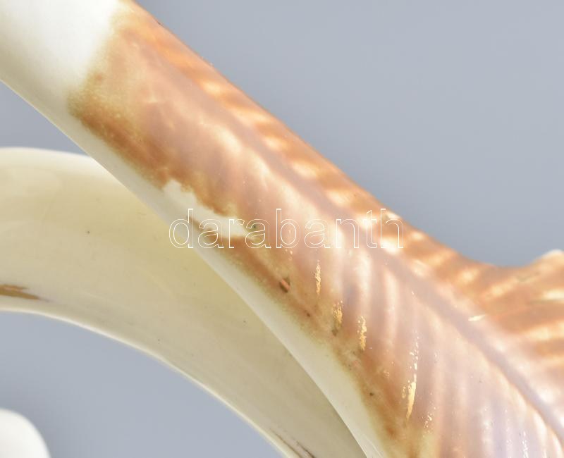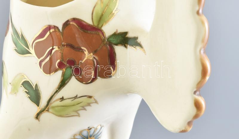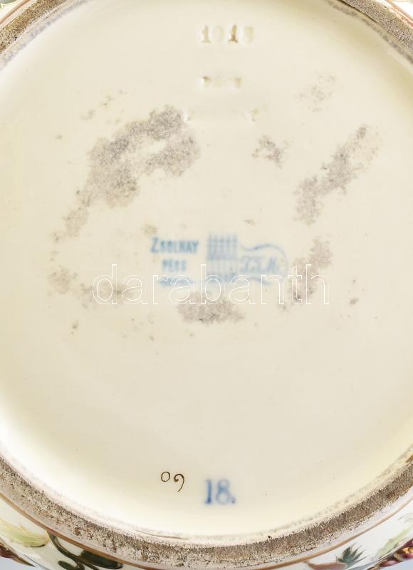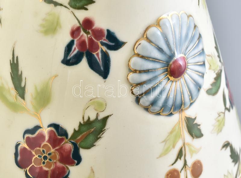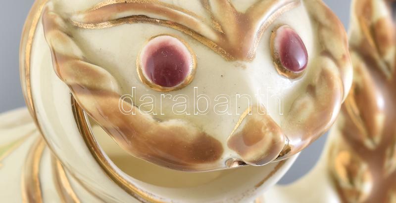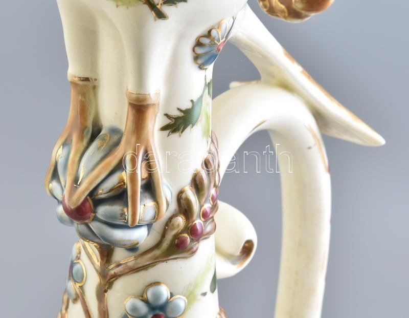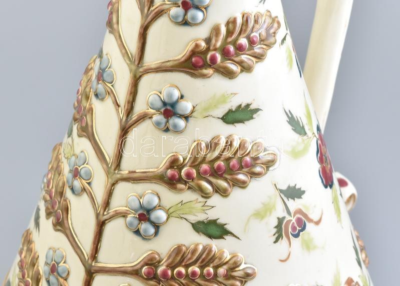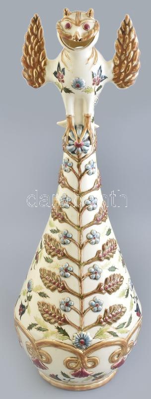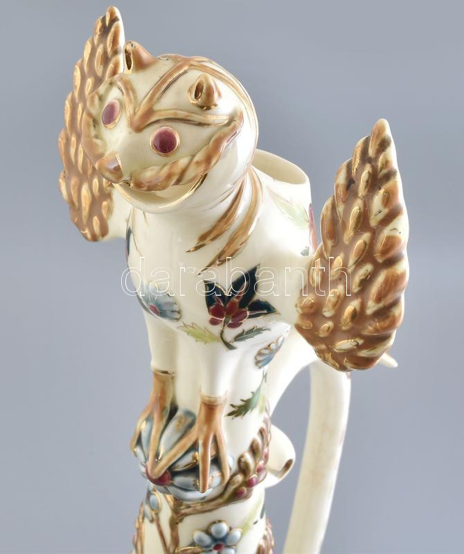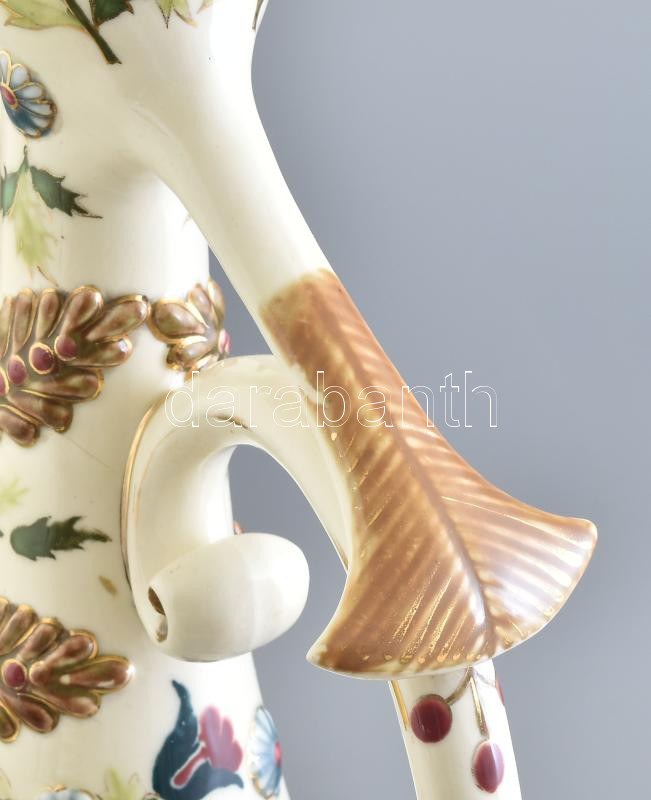 Zsolnay monumentális Fülesbaglyos / ördögös díszkancsó. Formába préselt keménycserép, aranyozott (néhány helyen korának megfelelően kopottas), virágdíszes palásttal. Elefántcsontszín alapmázon kidomborodó, magastüzű, színes mázakkal festett virág ábrázolással. Hibátlan állapotban. Alján jelzett: masszába nyomott Zsolnay Pécs és 1018 (formaszám) és családi jegy, valamint máz alatt kékkel bélyegzett családi jegy. Zsolnay, Pécs, 1880-90 körül. m: 63 cm, d: 22 cm CSAK SZEMÉLYES ÁTVÉTEL NEM POSTÁZZUK