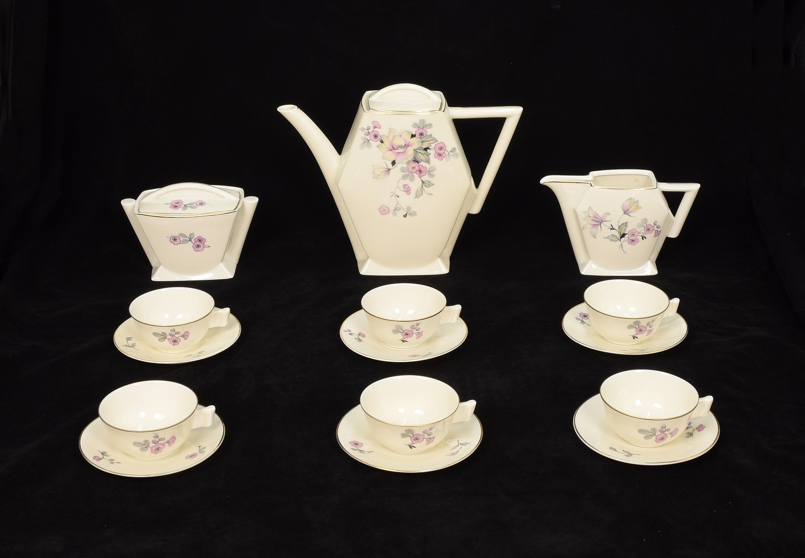 Serwis dla 6 osób, składa się z dzbanek z nakrywką, cukiernicy z nakrywką, mlecznika i 6 filiżanek ze spodkami; razem 15 naczyń, z dekoracją kwiatową luźnymi kompozycjami , gałązkami kwiatowymi i rzutami listków, m.in. z clematisem, w tonacji różowo-szarej; krawędzie złocone.