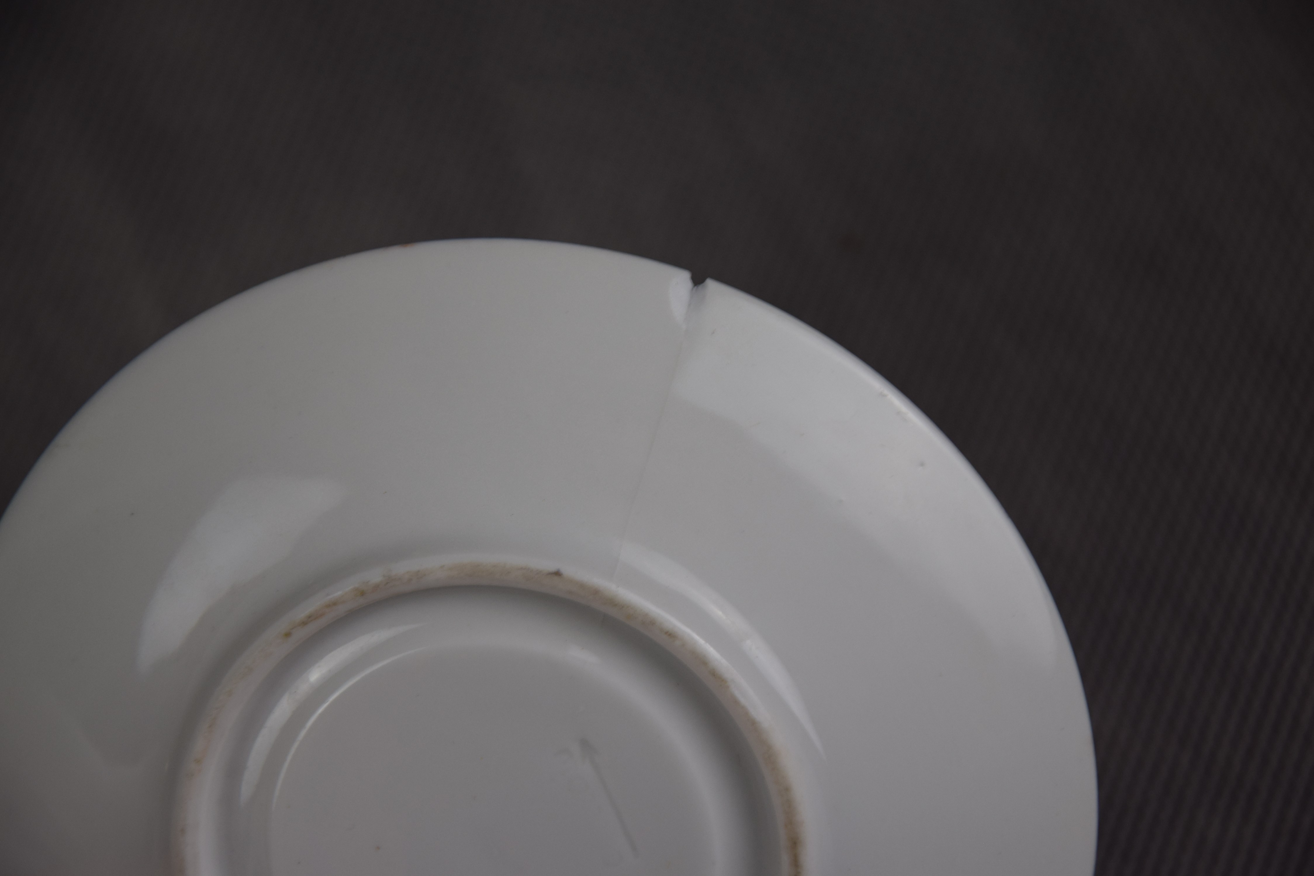 Jeden spodek na pęknięcie z małym wyszczerbieniem na rancie.