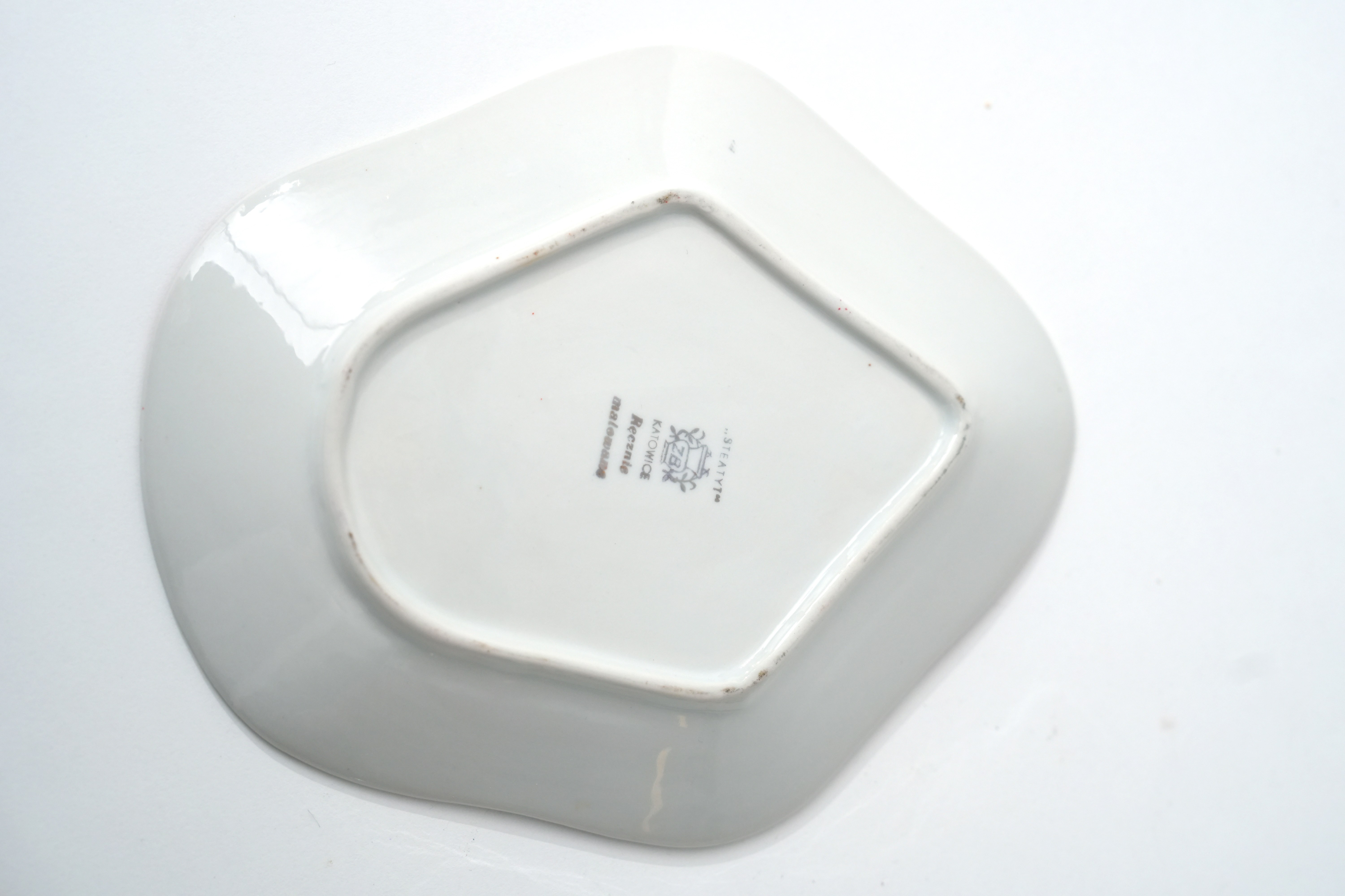 Cztery porcelanowe talerzyki o nieregularnym kształcie.