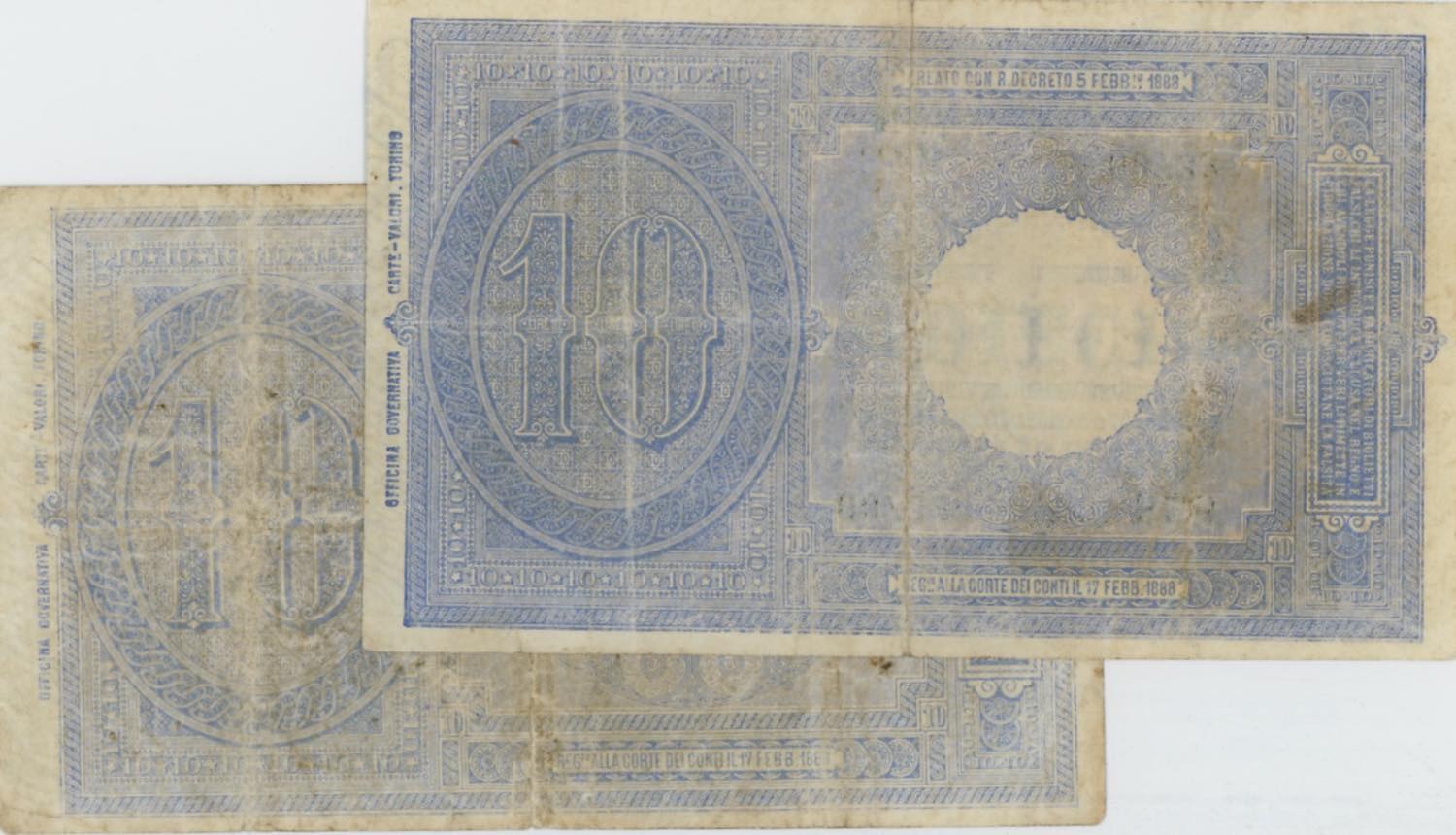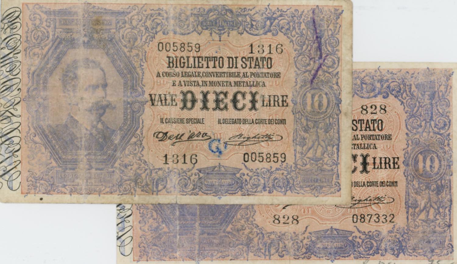 BIGLIETTI DI STATO 10 Lire - Lotto di due biglietti, entrambi rari, stirati e con macchie e scritte, da esaminare