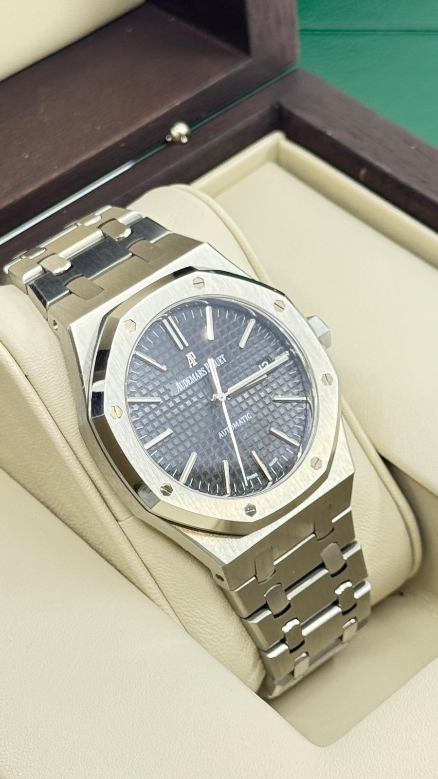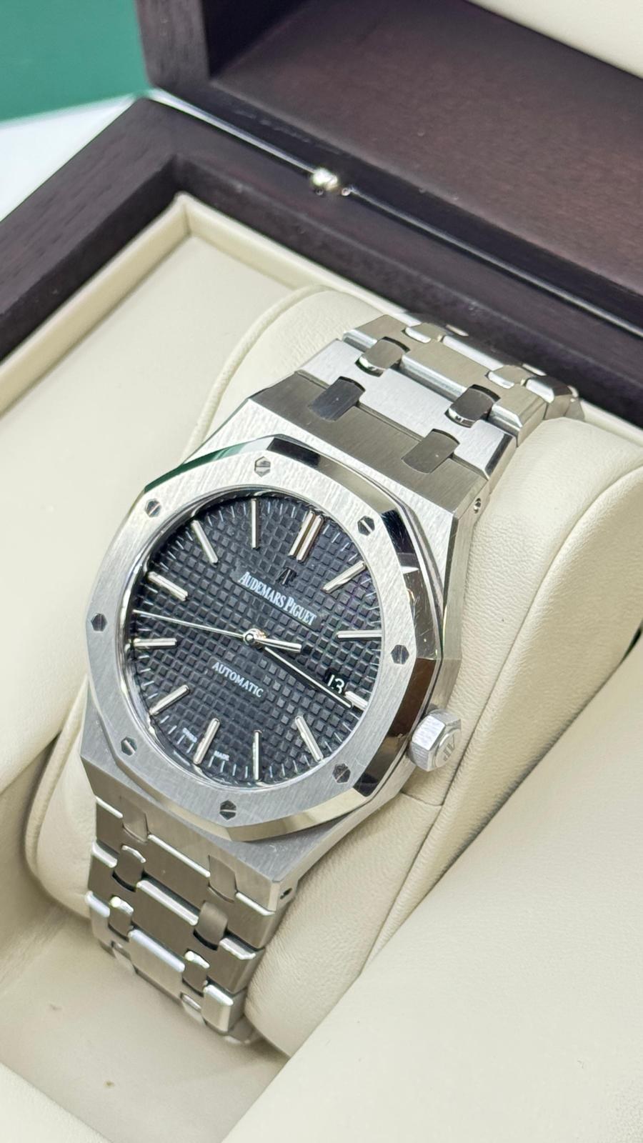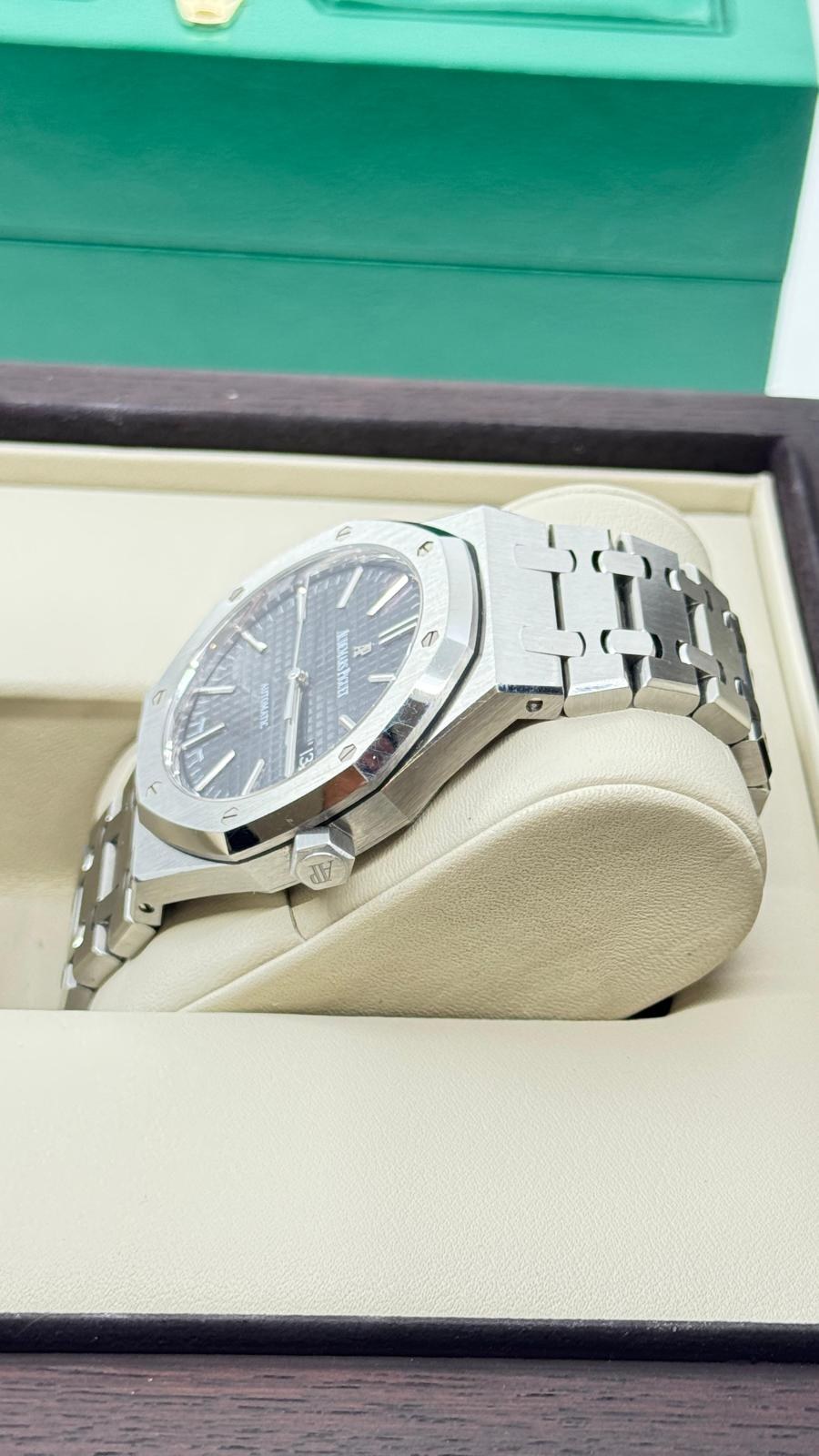 BRAND: AUDEMARS PIGUET MODEL: ROYAL OAK SELFWINDING REFERENCE NUMBER: 15400ST MOVEMENT: AUTOMATIC CASE MATERIAL: STEEL BAND MATERIAL: STEEL CONDITION: USED (EXCELLENT) THE ITEM SHOWS MINOR SIGNS OF WEAR, SUCH AS LIGHT SCRATCHES, BUT THEY ARE NOT PERCEPTIBLE TO THE TOUCH. ACCESSORIES: WITH ORIGINAL BOX AND ORIGINAL PAPERS CASE MATERIAL: STEEL DIAMETER: 41 MM WATER RESISTANT: 5 ATM BEZEL MATERIAL: STEEL GLASS: SAPPHIRE CRYSTAL DIAL COLOR: BLACK NUMBERS ON DIAL: NO NUMERALS BAND MATERIAL: STEEL BAND COLOR: STEEL CLASP: DOUBLE FOLDING CLASP CLASP MATERIAL: STEEL FUNCTIONS: DATE - AUCTION GRADE: 25% |