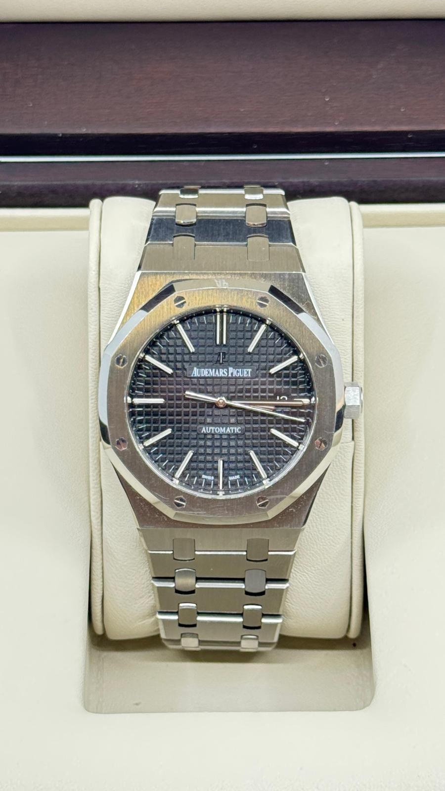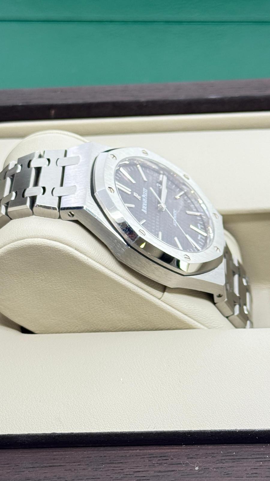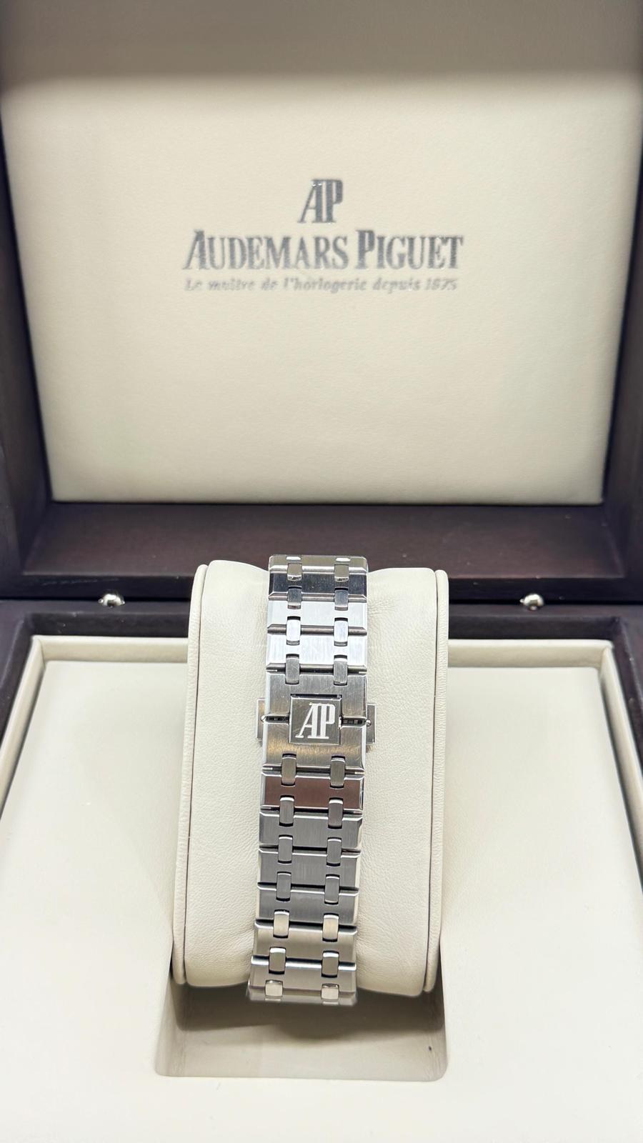 BRAND: AUDEMARS PIGUET MODEL: ROYAL OAK SELFWINDING REFERENCE NUMBER: 15400ST MOVEMENT: AUTOMATIC CASE MATERIAL: STEEL BAND MATERIAL: STEEL CONDITION: USED (EXCELLENT) THE ITEM SHOWS MINOR SIGNS OF WEAR, SUCH AS LIGHT SCRATCHES, BUT THEY ARE NOT PERCEPTIBLE TO THE TOUCH. ACCESSORIES: WITH ORIGINAL BOX AND ORIGINAL PAPERS CASE MATERIAL: STEEL DIAMETER: 41 MM WATER RESISTANT: 5 ATM BEZEL MATERIAL: STEEL GLASS: SAPPHIRE CRYSTAL DIAL COLOR: BLACK NUMBERS ON DIAL: NO NUMERALS BAND MATERIAL: STEEL BAND COLOR: STEEL CLASP: DOUBLE FOLDING CLASP CLASP MATERIAL: STEEL FUNCTIONS: DATE - AUCTION GRADE: 25% |