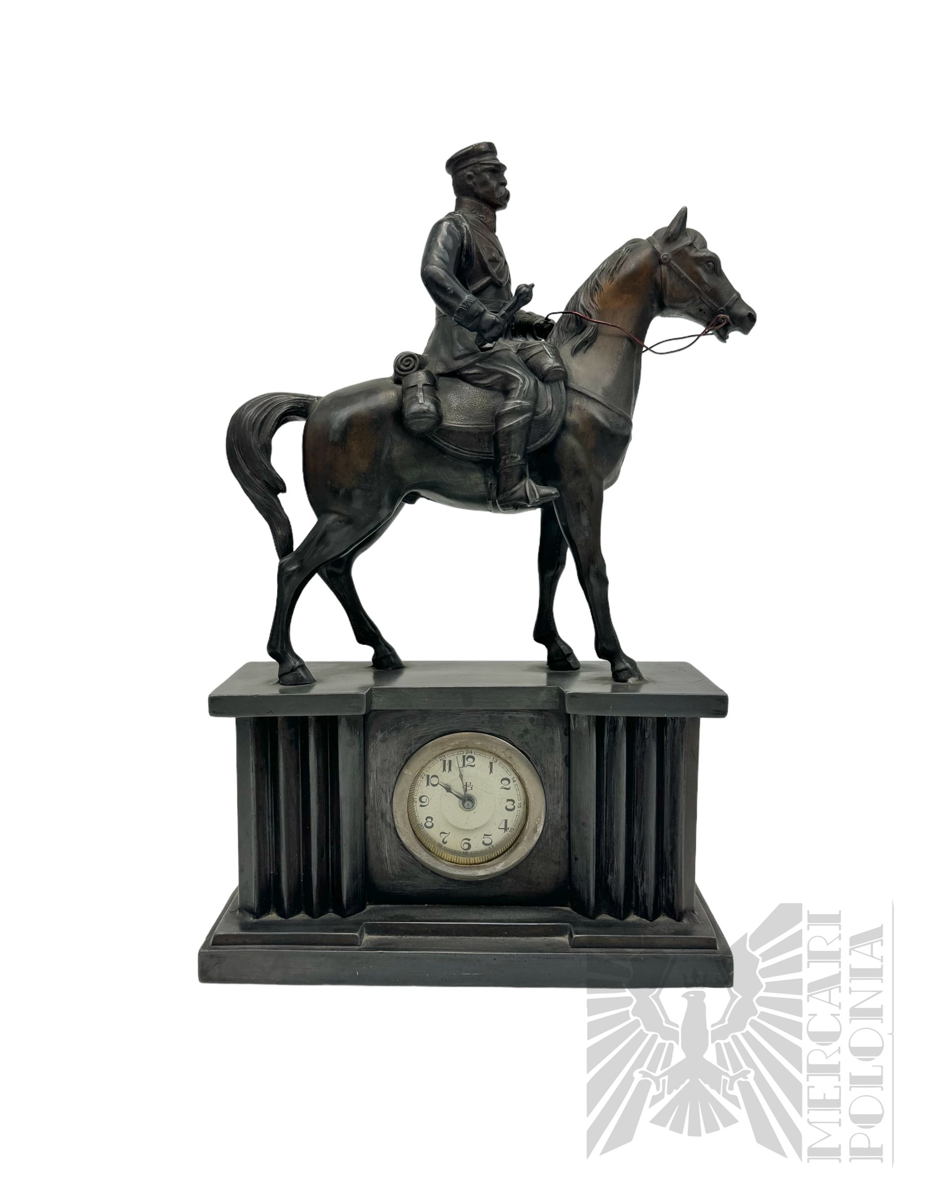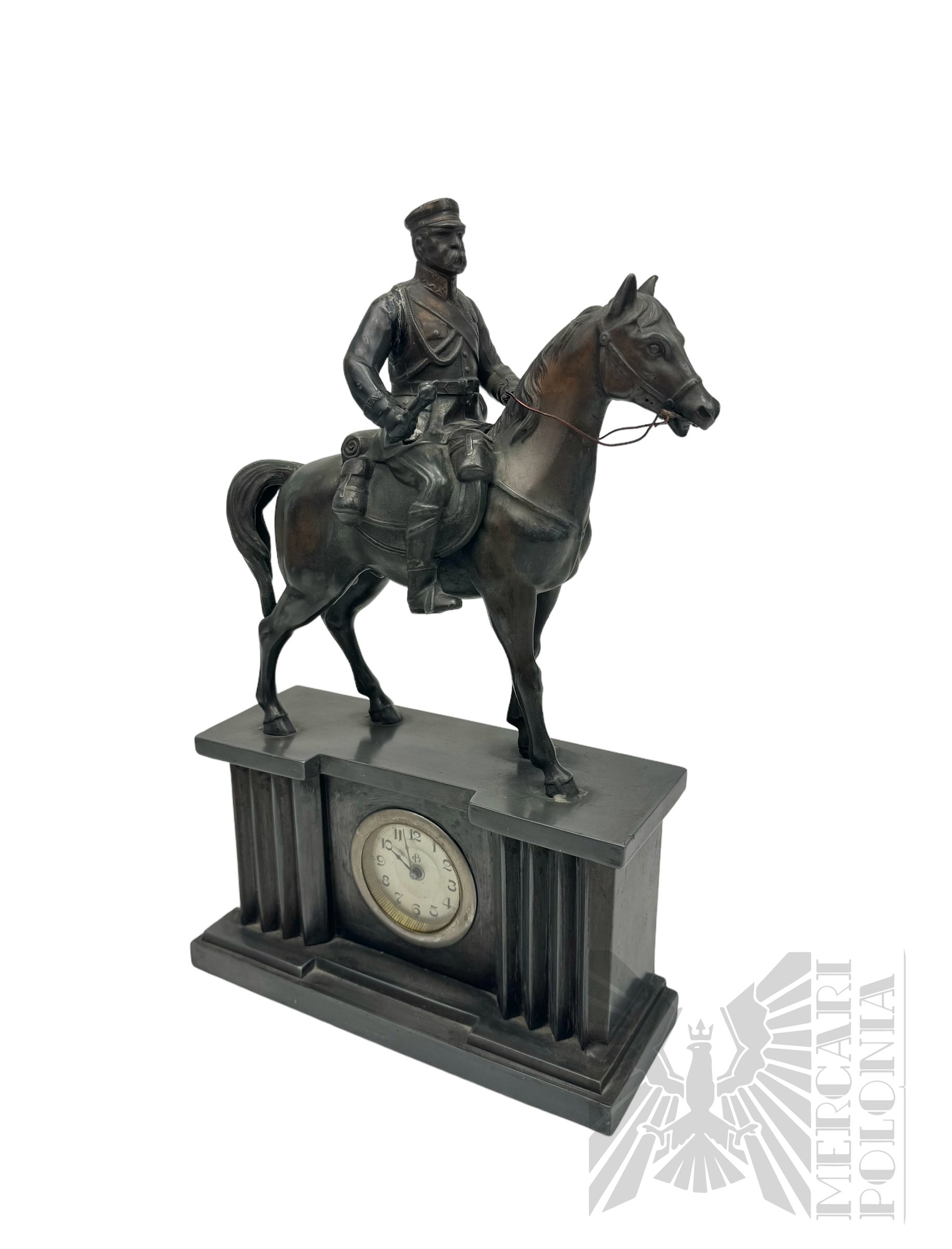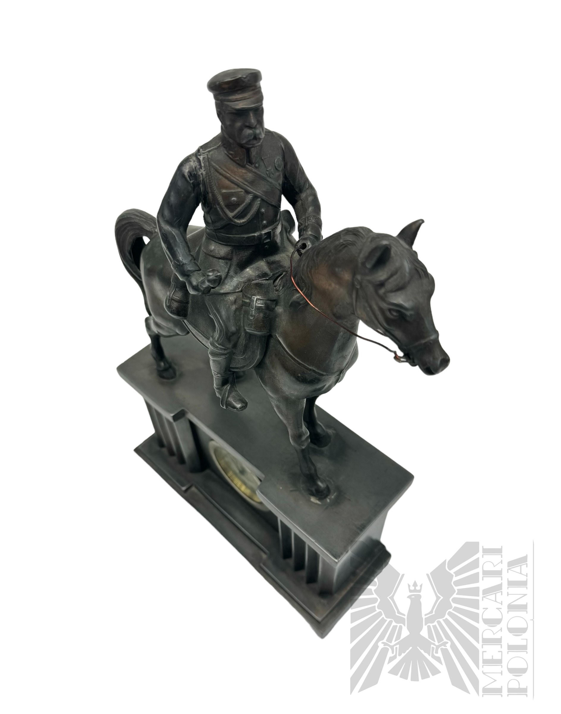 Zegar kominkowy wykonany z cynku w formie prostokątnej podstawy, po bokach ozdobionej trzema filarami z obu storn, w centralnej części widoczny zegar mechaniczny. Na podstawie jako element dekoracyjny i patriotyczny został umieszczony wizerunek Marszałka Józefa Piłsudskiego siedzącego na Kasztance. Postać Piłsudskiego dostojna, wyprostowana, dzierżąca w prawej dłoni Buławę Marszałkowską, a w lewej lejce. Ujęcie odnoszące się do parad wojskowych etc. Mechanizm zegara nakręcany od tyłu, brak informacji o stanie technicznym, sama figura z widocznymi ubytkami i mankamentami.