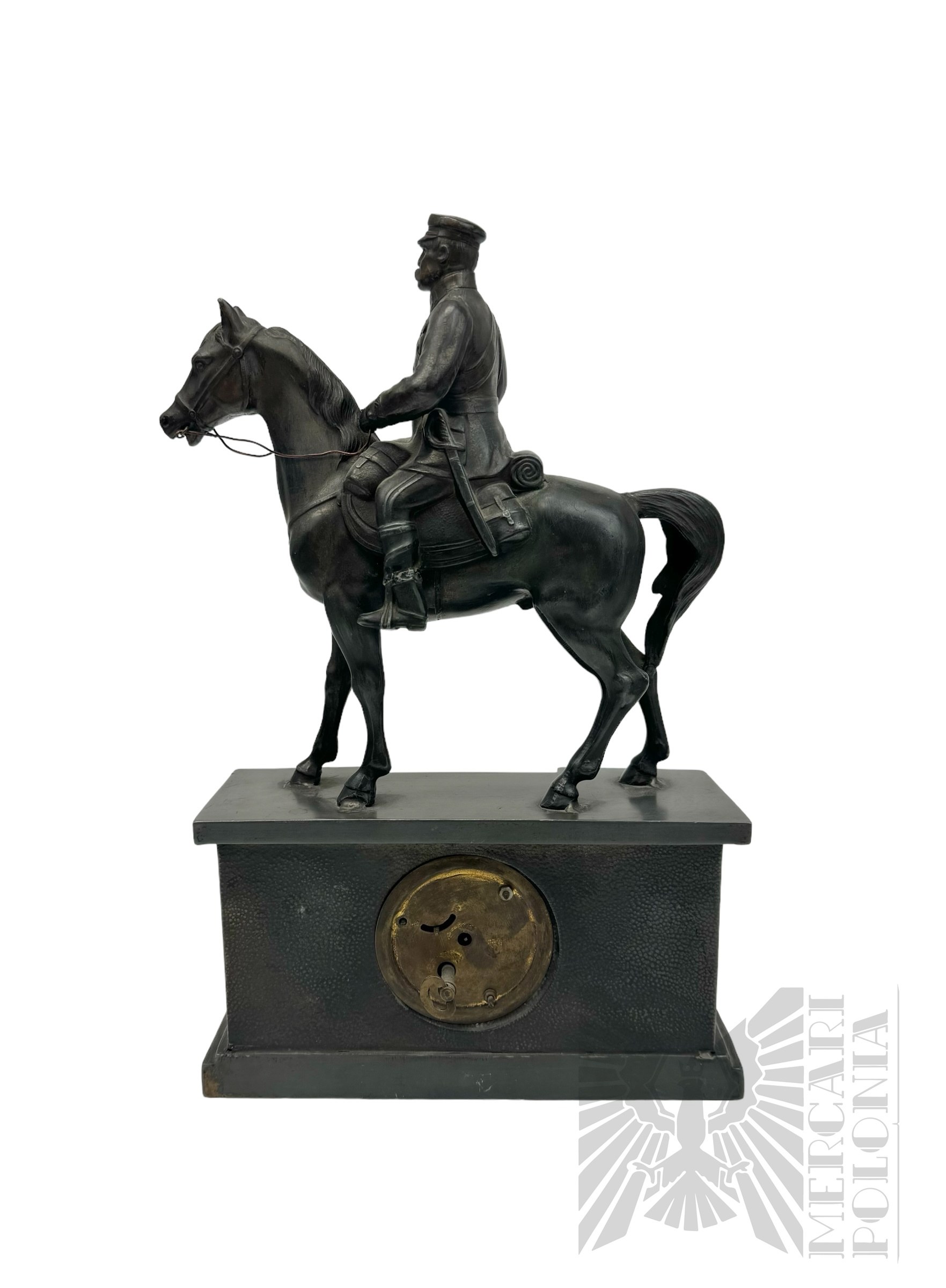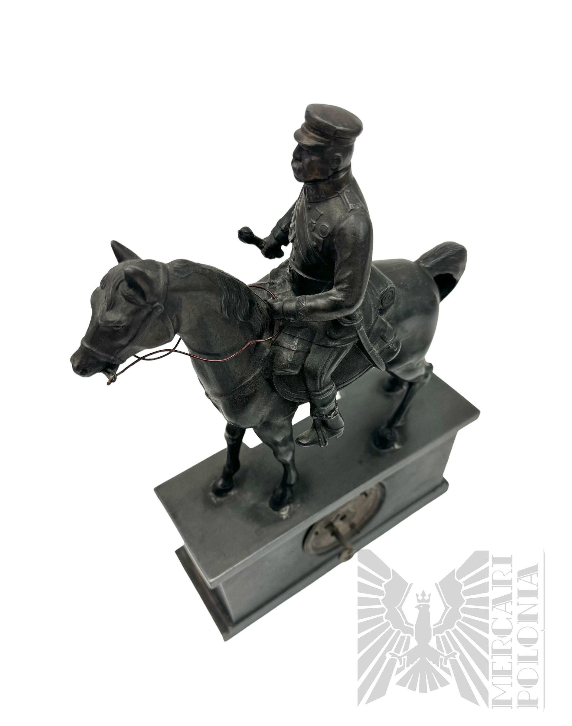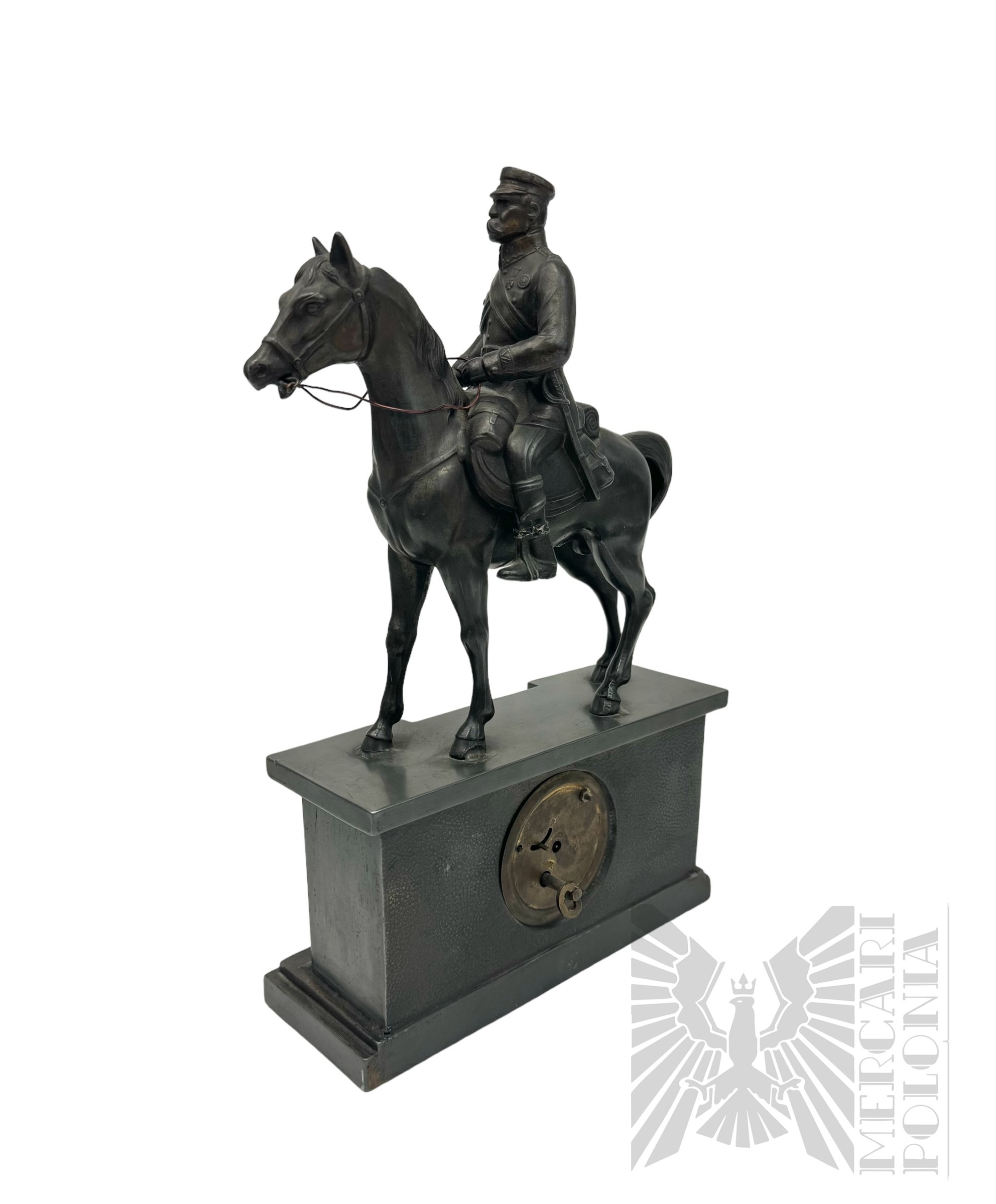 Zegar kominkowy wykonany z cynku w formie prostokątnej podstawy, po bokach ozdobionej trzema filarami z obu storn, w centralnej części widoczny zegar mechaniczny. Na podstawie jako element dekoracyjny i patriotyczny został umieszczony wizerunek Marszałka Józefa Piłsudskiego siedzącego na Kasztance. Postać Piłsudskiego dostojna, wyprostowana, dzierżąca w prawej dłoni Buławę Marszałkowską, a w lewej lejce. Ujęcie odnoszące się do parad wojskowych etc. Mechanizm zegara nakręcany od tyłu, brak informacji o stanie technicznym, sama figura z widocznymi ubytkami i mankamentami.