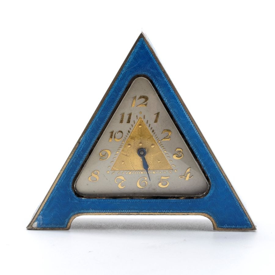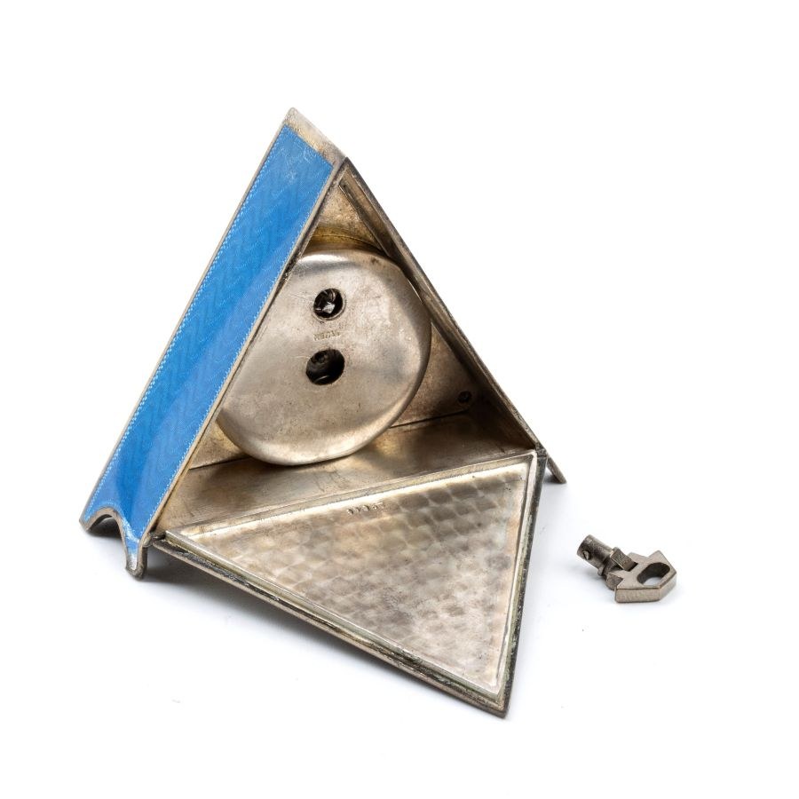 Triangular-shaped case in sterling silver with guilloché enamel in shades of blue, white and gold dial with golden Arabic numerals and black hour markers. The watch is key wound and set.