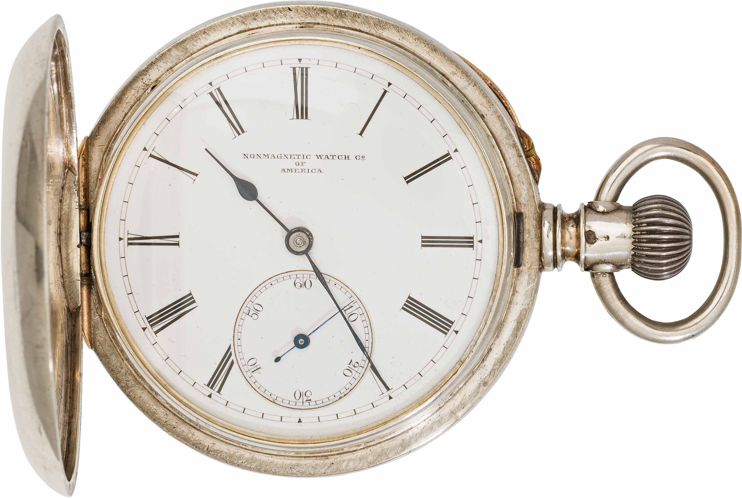 silver; crown winding; hunter; enamel dial with small second; anchor escapement with stone palettes, screwed chatons, swan neck regulation