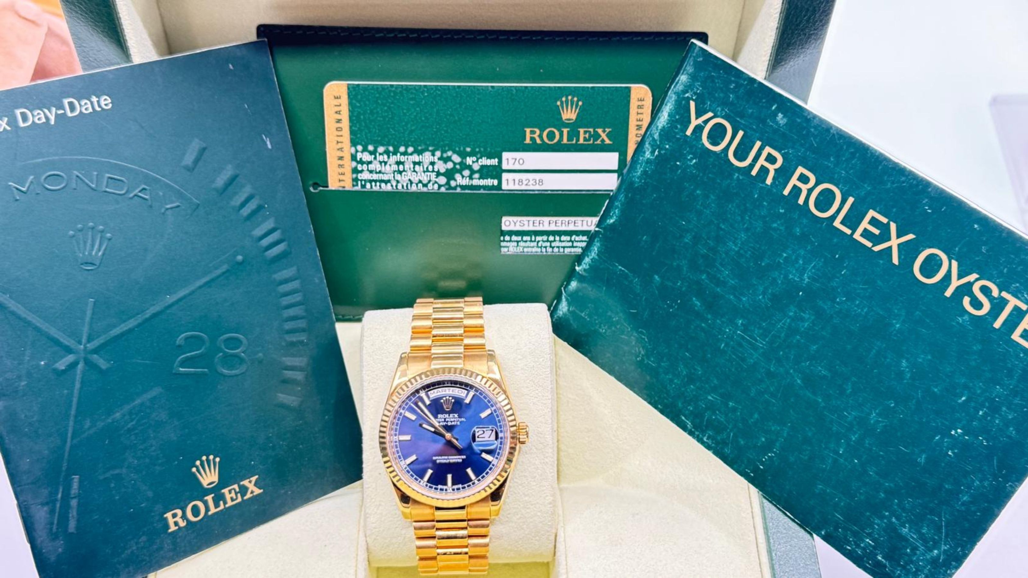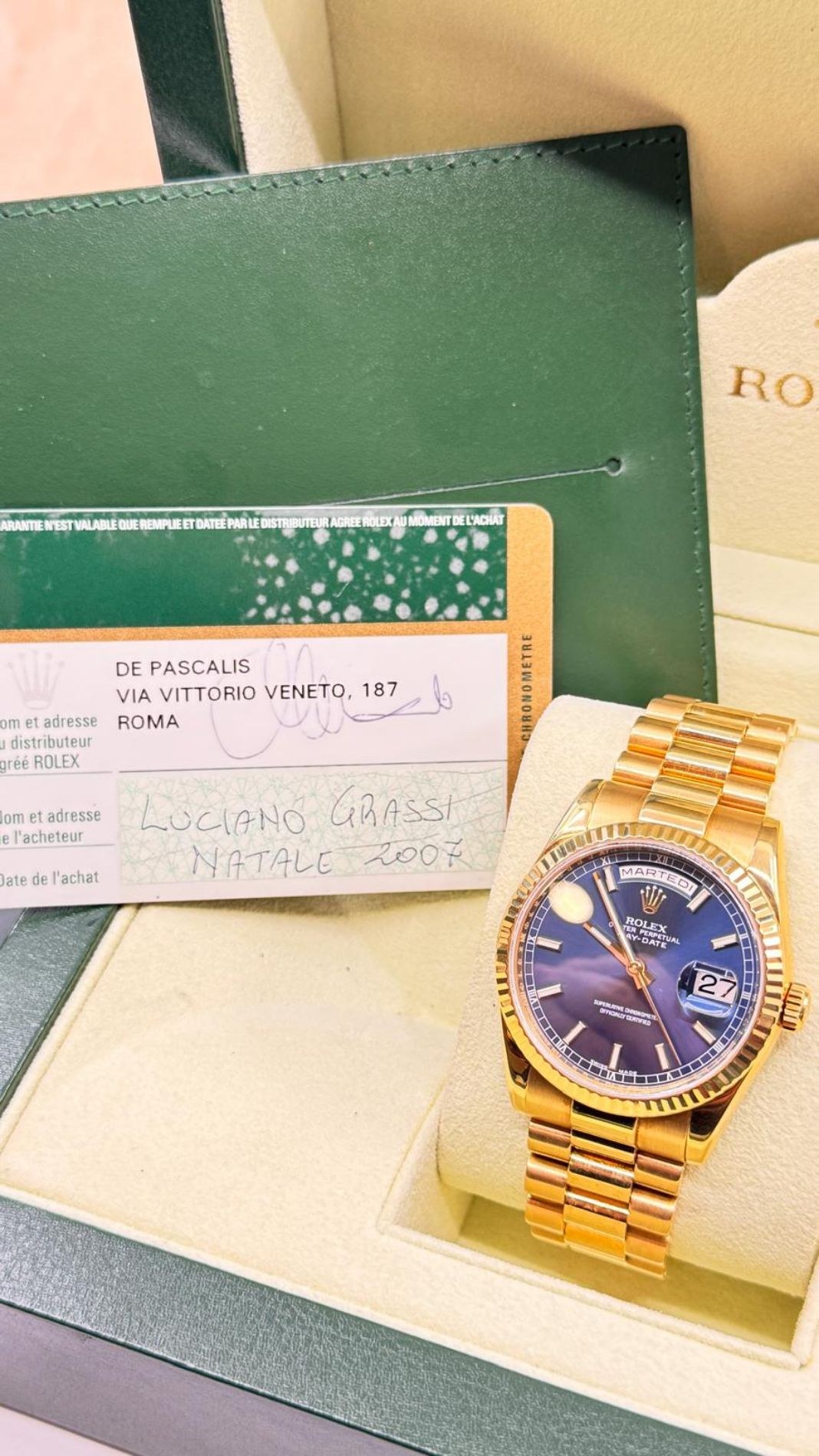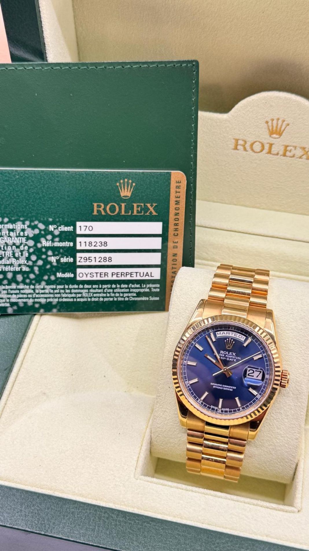 BRAND ROLEX MODEL (WATCH) DAY-DATE 36 REFERENCE NUMBER 118238 MOVEMENT AUTOMATIC CASE MATERIAL YELLOW GOLD STRAP MATERIAL YELLOW GOLD YEAR OF PRODUCTION 2007 CONDITION EXCELLENT (PRE-OWNED, NO OR BARELY VISIBLE SIGNS OF WEAR) SET OF ORIGINAL DOCUMENTS, NO BOX MOVEMENT AUTOMATIC CASE MATERIAL YELLOW GOLD DIAMETER 36 MM WATER RESISTANT 10 ATM BEZEL MATERIAL YELLOW GOLD GLASS SAPPHIRE CRYSTAL NUMBERS ON THE DIAL WITHOUT NUMBERS STRAP STRAP MATERIAL YELLOW GOLD STRAP COLOR GOLD CLASP MATERIAL YELLOW GOLD - AUCTION COMMISSION 25%