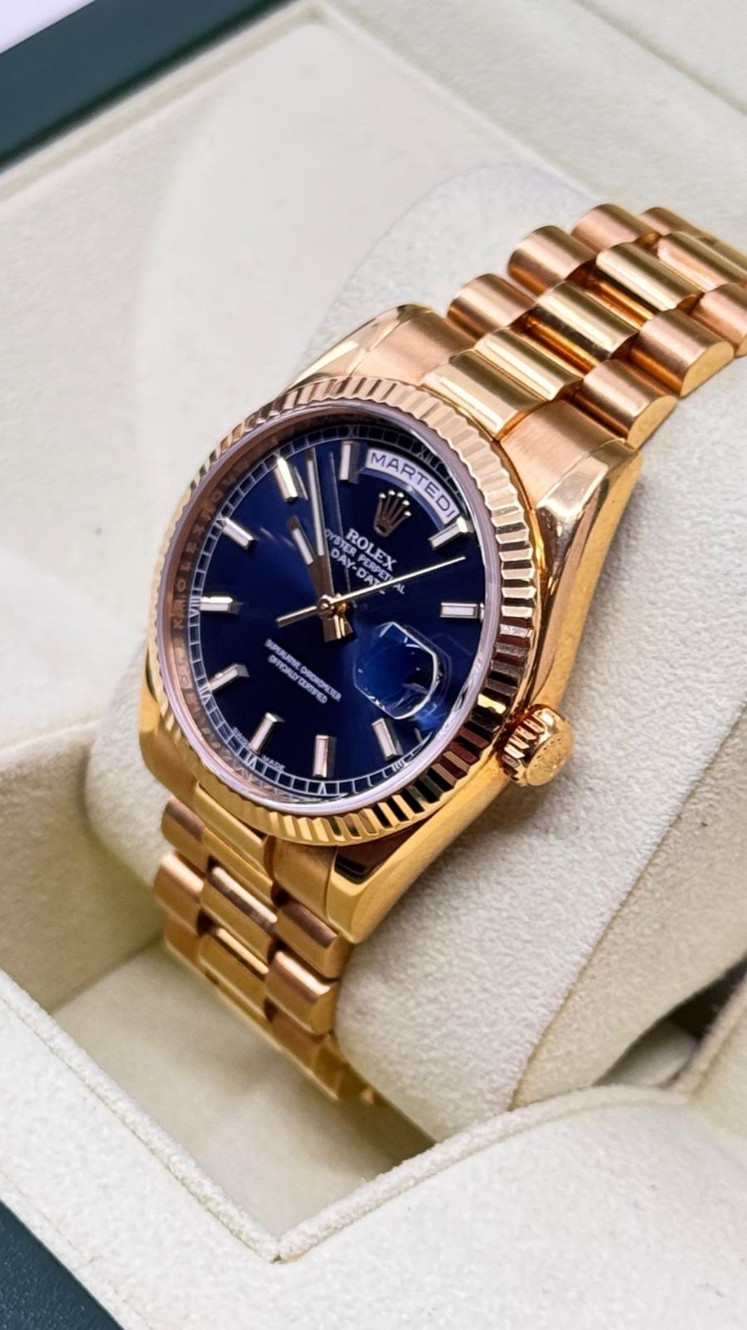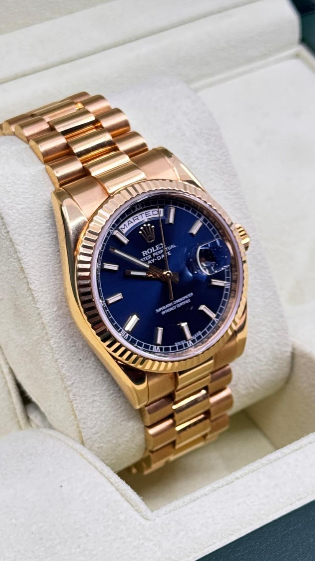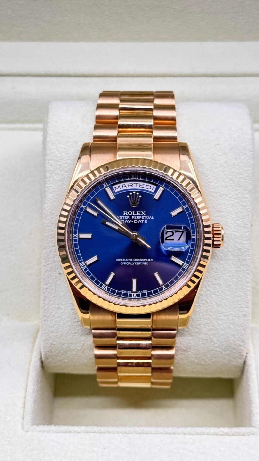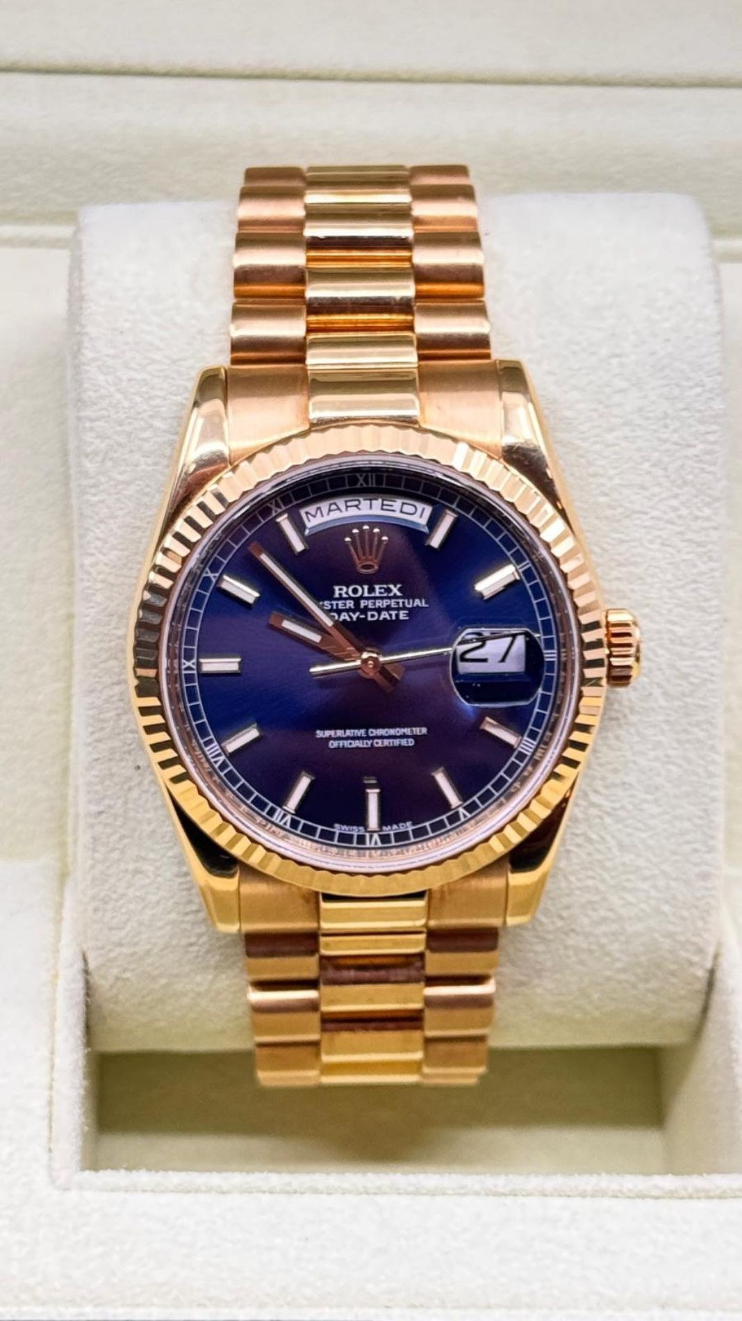 BRAND ROLEX MODEL (WATCH) DAY-DATE 36 REFERENCE NUMBER 118238 MOVEMENT AUTOMATIC CASE MATERIAL YELLOW GOLD STRAP MATERIAL YELLOW GOLD YEAR OF PRODUCTION 2007 CONDITION EXCELLENT (PRE-OWNED, NO OR BARELY VISIBLE SIGNS OF WEAR) SET OF ORIGINAL DOCUMENTS, NO BOX MOVEMENT AUTOMATIC CASE MATERIAL YELLOW GOLD DIAMETER 36 MM WATER RESISTANT 10 ATM BEZEL MATERIAL YELLOW GOLD GLASS SAPPHIRE CRYSTAL NUMBERS ON THE DIAL WITHOUT NUMBERS STRAP STRAP MATERIAL YELLOW GOLD STRAP COLOR GOLD CLASP MATERIAL YELLOW GOLD - AUCTION COMMISSION 25%