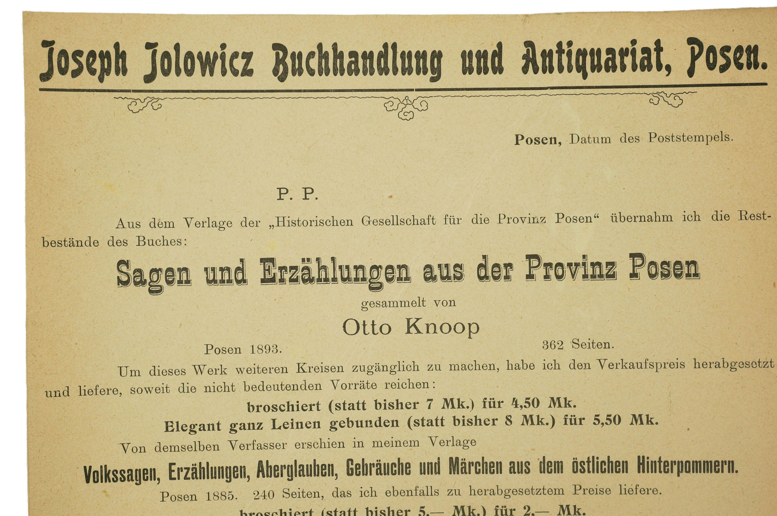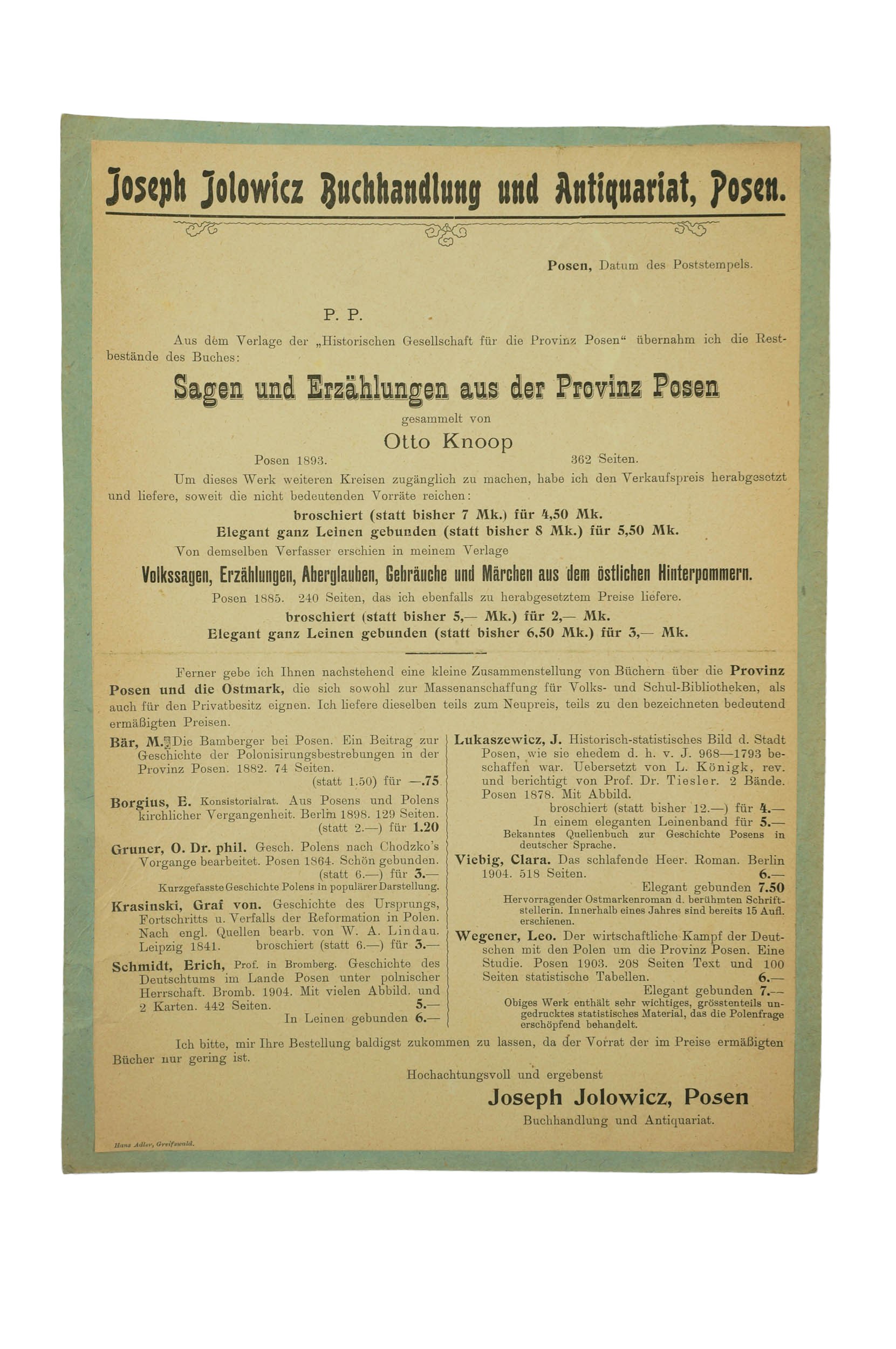 Joseph Jolowicz Buchhandlung und Antiquariat, Posen, REKLAMA z ofertą książek dostępnych w księgarni, m.in.: Łukaszewicz "Historyczno - statystyczny opis Poznania", f. 19,5 x 27,5cm