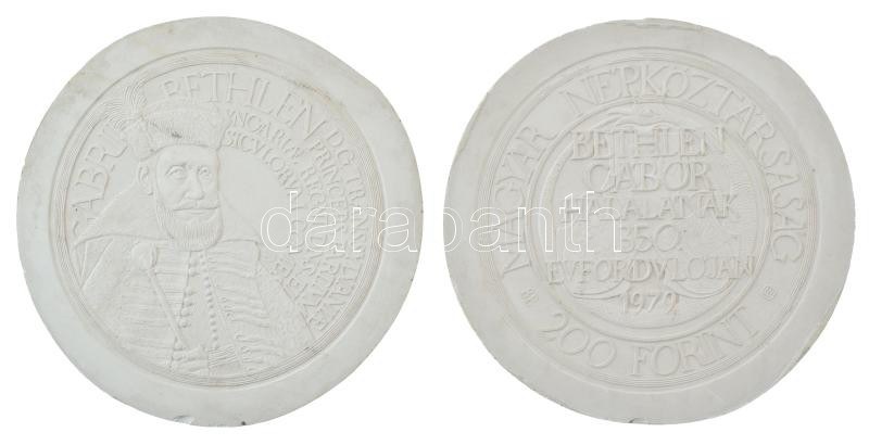 1979. 200Ft "Bethlen Gábor halálának 350. évfordulóján" meg nem valósult érmetervezet gipsz előlapi és hátlapi POZITÍV nagyminta (160mm) T:AU,XF ph. / Hungary 1979. 200 Forint "Bethlen Gábor halálának 350. évfordulóján (On the 350th anniversary of the death of Gábor Bethlen)" unrealized coin's plan obverse and reverse POSITIVE large plaster sample (160mm) C:AU,XF edge error Adamovszky katalógusban nem szerepel / Not listed in Adamovszky's catalogue