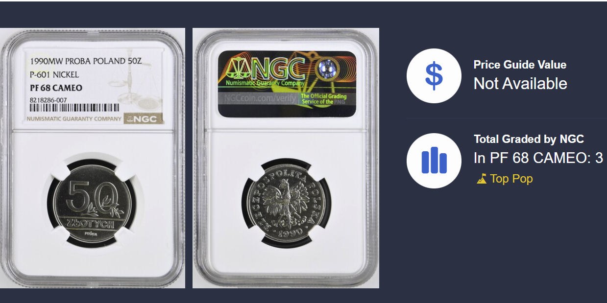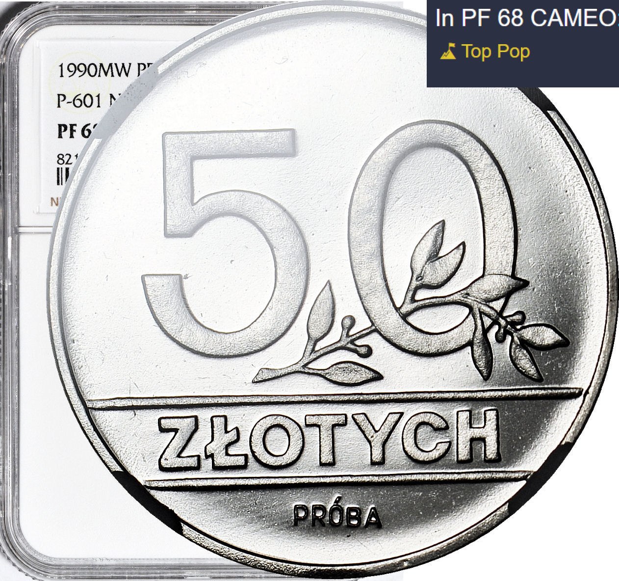 Wizerunek orła jak na monetach podenominacyjnych. Pierwsza próbna moneta III RP z orłem w koronie. Próba niklowa wybita w nakładzie 500 szt. Menniczy selekcjonowany egzemplarz, najwyższa nota w NGC. Mała kolekcja selekcjonowanych pod względem stanów zachowania prób niklowych w gradingu NGC.