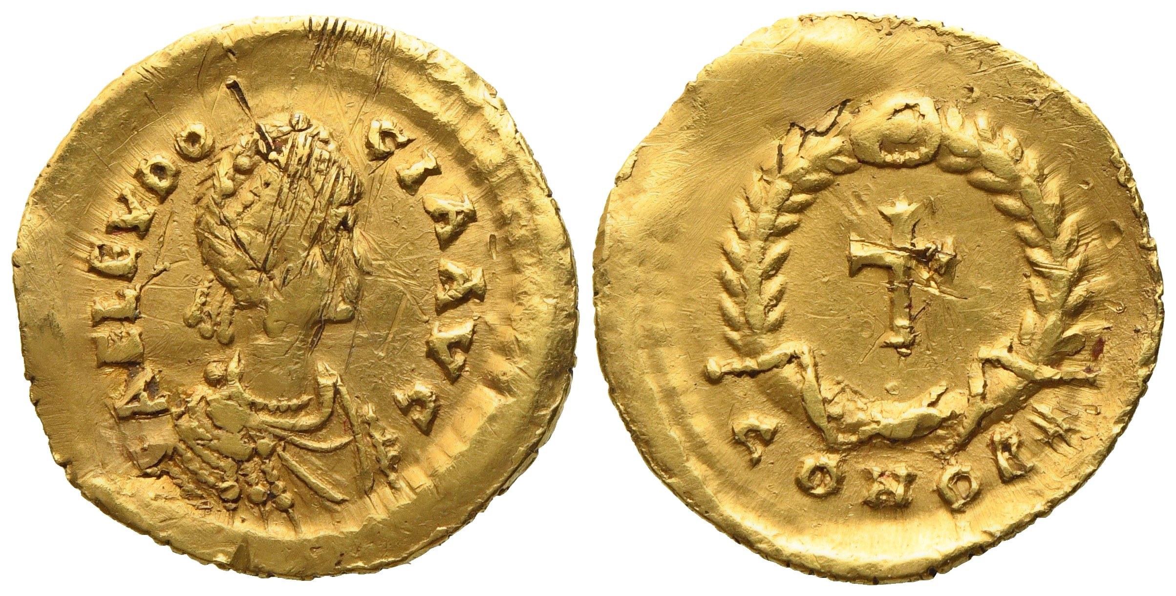 AEL EVDOCIA AVG, pearl-diademed and draped bust r.; Rv. Cross within wreath; CONOB* in exergue. RIC 335; Depeyrot 72/2. Flan slightly bent; scratches on the obverse, otherwise very fine.