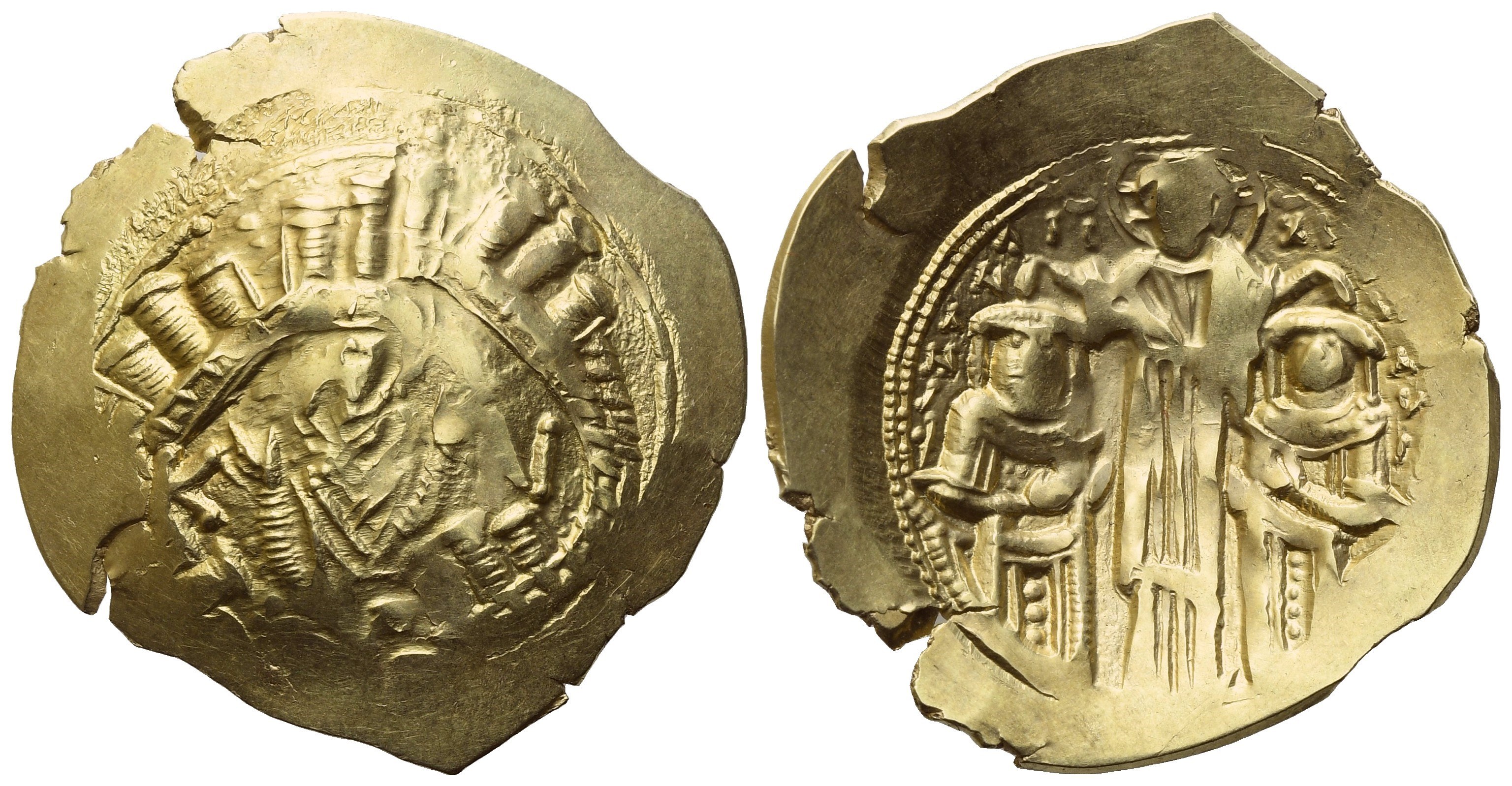 Bust of Virgin Mary, orans, flanked by MHP and ΘV,all within city walls furnished with six groups of towers. Rv./ Christ blessing Andronicus II and Michael IX, kneeling to left and right, respectively; in fields, IC - XC with the names of the emperors below. DOC 367. SB 2396. Good very fine / about extremely fine.