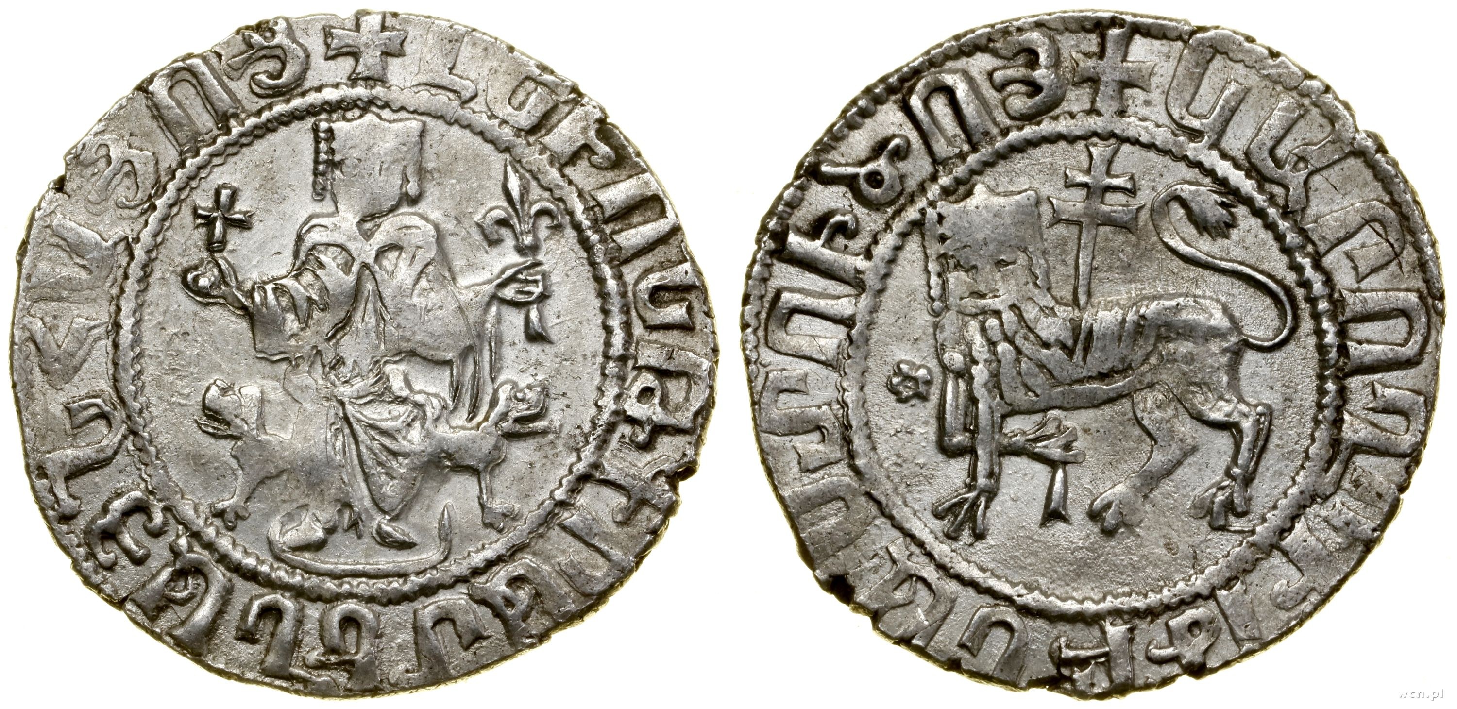Aw: Władca siedzący na tronie, legenda, Rw: Lew kroczący w lewo, ze skrzyżowanymi przednimi łapami, za nim krzyż, po lewej pięciopłatkowa rozeta