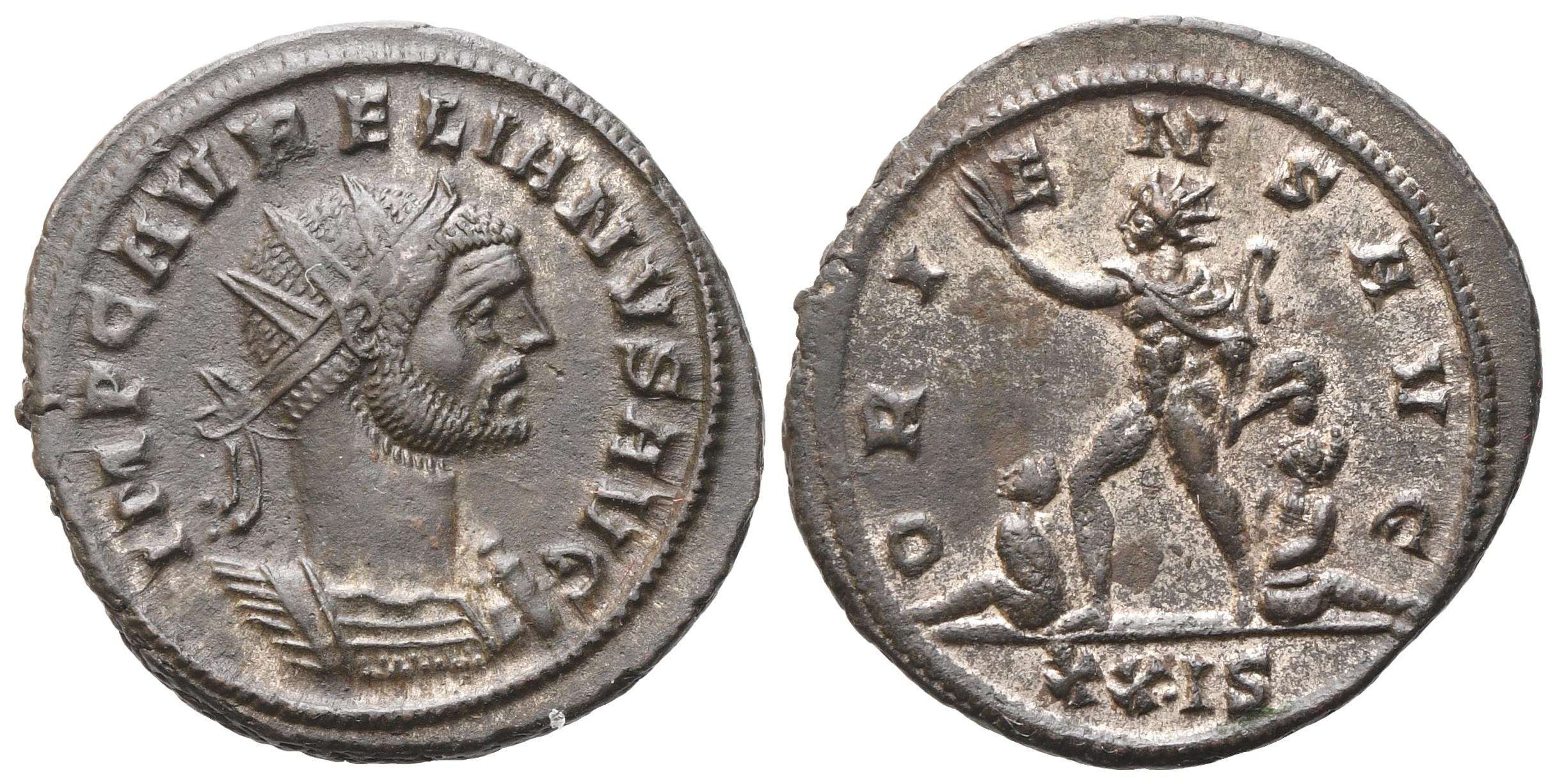 IMP C AVRELIANVS AVG Radiate and cuirassed bust r.; Rv. ORIENS AVG Sol walking l., raising r. hand and holding whip in l. hand; at feet, on each side, a bound and std. captive in oriental dress, the captive on the r. has his head turned l. RIC online 2366. Extremely fine.