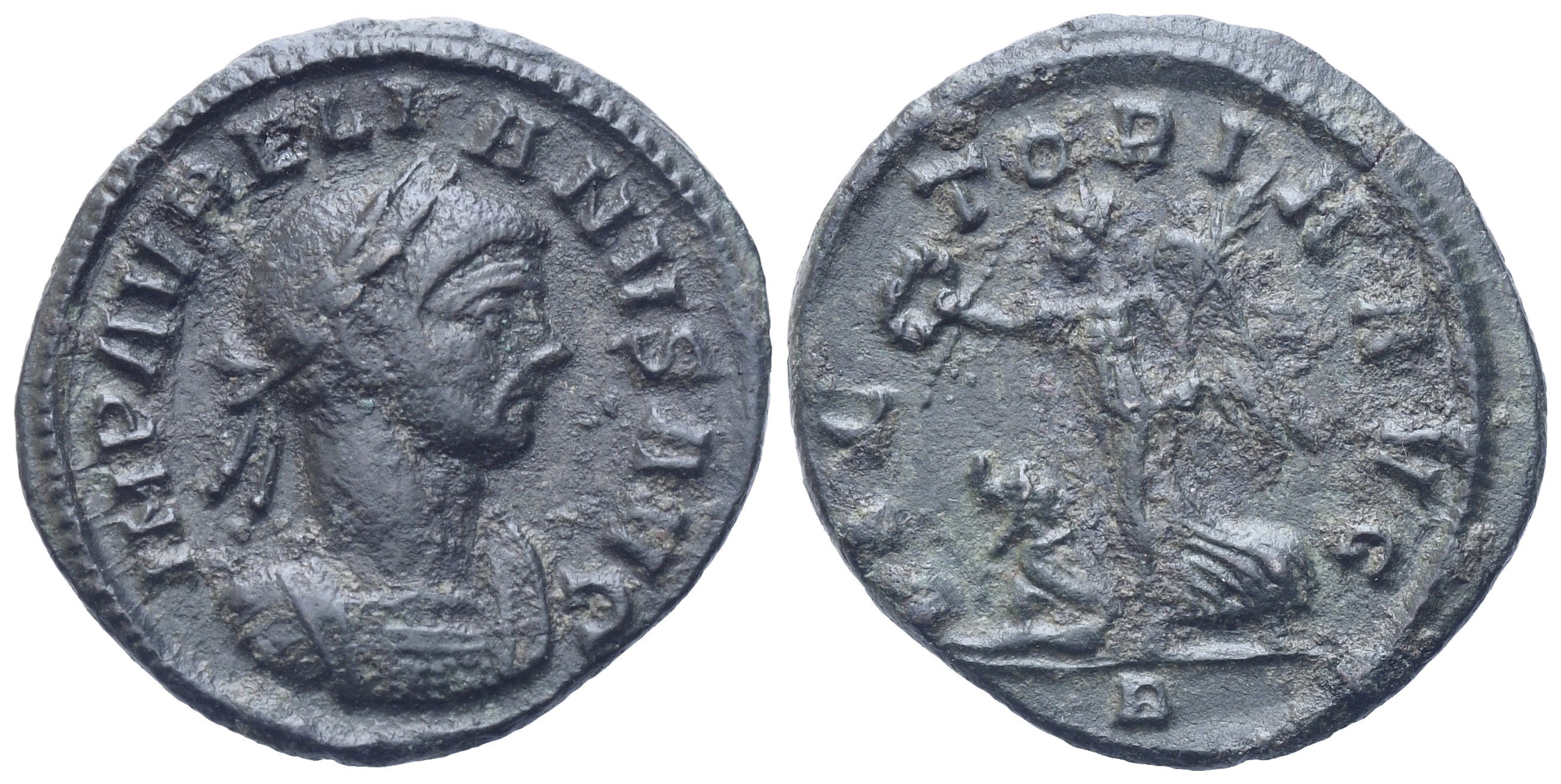 IMP AVRELIANVS AVG Laureate and cuirassed bust r.; Rv. VICTORIA AVG Victory walking l. holding wreath and palm; in ex, B. RIC 55. VF