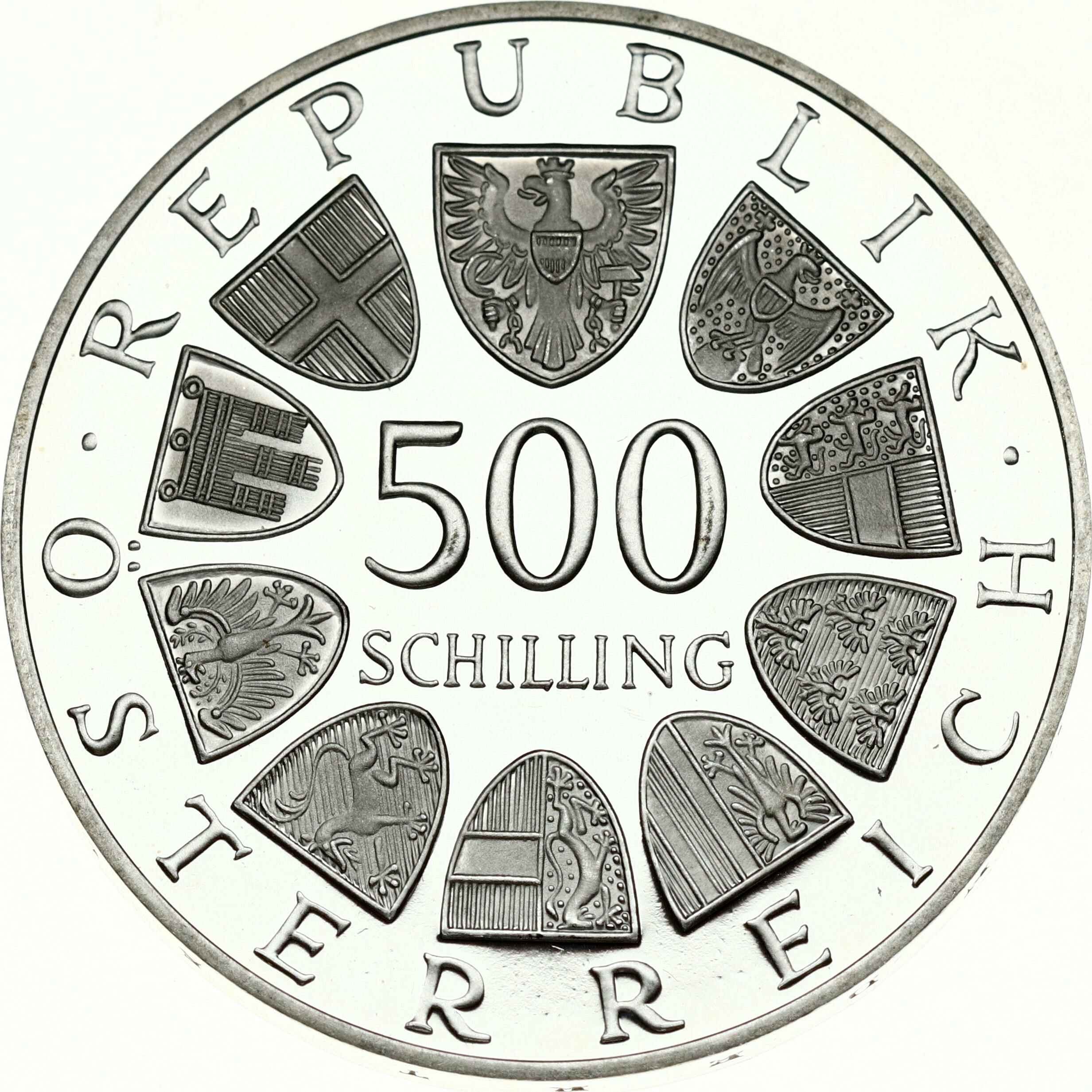 Austria 500 Schilling 1988 100th Anniversary - Victor Adler and Christian Socialist Party. Obverse: Value within circle of shields. Reverse: Victor Adler and Christian Socialist Party. Silver (.925) 24g. KM-2986