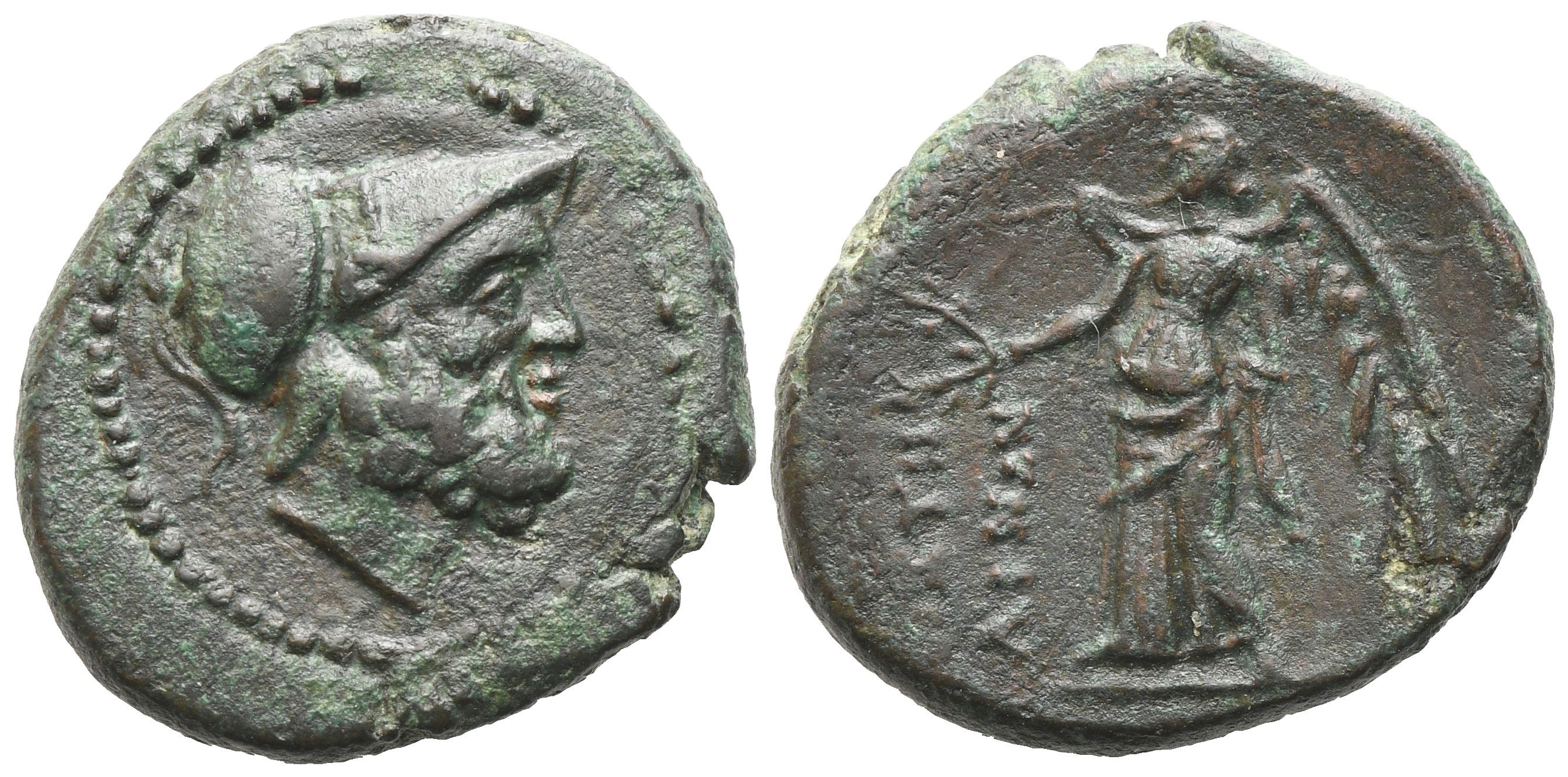 Helmeted head of Ares r., dotted border; Rv. ΠETE-ΛINΩN, Nike standing l., holding wreath. HNItaly 2456; SNG ANS 607. Dark brown and green patina. Near extremely fine.