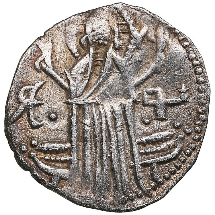 1.50g. 19mm. XF/XF Obv.: Christ enthroned facing, raising hands in benediction; IC XC and monograms AΛЄ (Alexander) – ЦР (Tsar; mirrored) across field. Rev.: Ivan Alexander and Michael Asen IV standing facing, each holding cross-tipped scepter, holding banner between them; monograms across field; stars flanking base of staff. Raduchev & Zhekov Type 1.13.3-6; Youroukova & Penchev 74-80. At the beginning of the reign Ivan Alexander had crowned his eldest son Michael co-ruler.