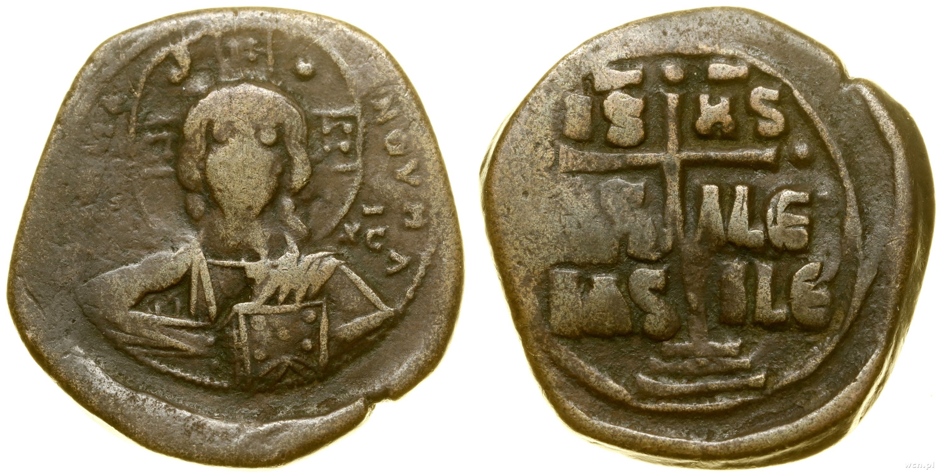 Aw: Popiersie Chrystusa Pantokratora na wprost, nieczytelna legenda, Rw: Krzyż na podstawie, po bokach IS-XS / BAS-ILE / BAS-ILE