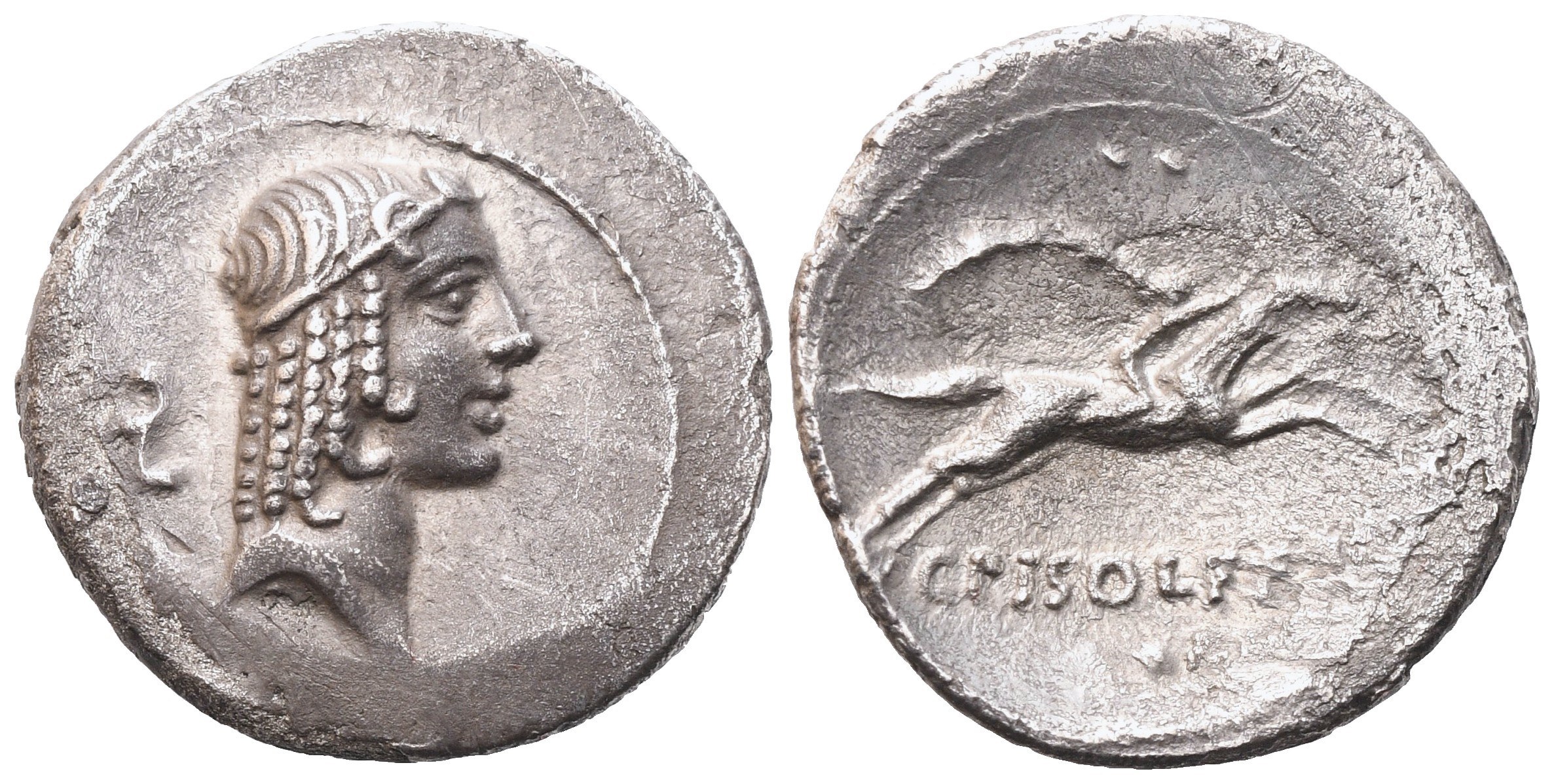 Diademed head of Apollo facing right; behind, control symbol. Rv. C PISO L F F[RVGI] Naked horseman, galloping right, holding a palm branch; above, two dots; below, one dot. Crawford 408/1b; Hersh, Piso 323 (O264/R2077). VF