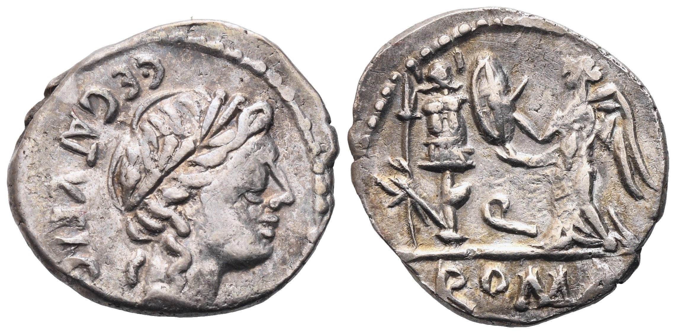 Laureate head of Apollo r.; behind, partially ligate, C·EGNATVLEI·C[·F·Q]; Rv. Victory standing l., inscribing shield attached to trophy; in field, Q; in exergue, ROMA. Crawford 333/1; Babelon (Egnatuleia) 1; Sydenham 588. Good VF