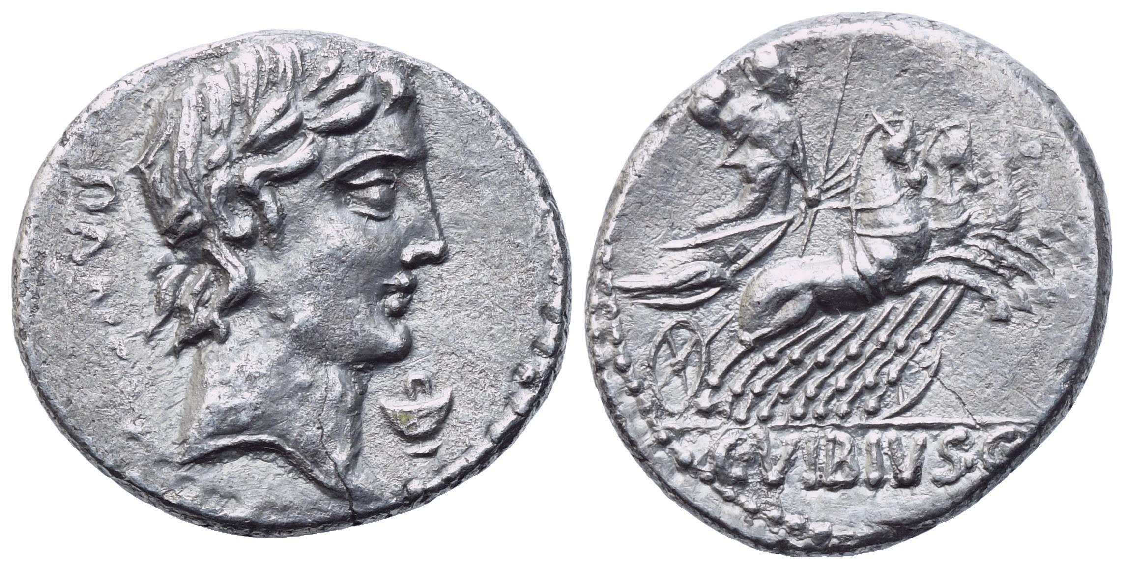 PANS[A] laureate head of Apollo r.; control mark below chin; Rv. C•VIBIVS•C•[F] Minerva driving quadriga galloping r., spear and reins in r. hand, trophy over shoulder in l.. Crawford 342/5b. Sydenham 684. Vibia 2. Near extremely fine.