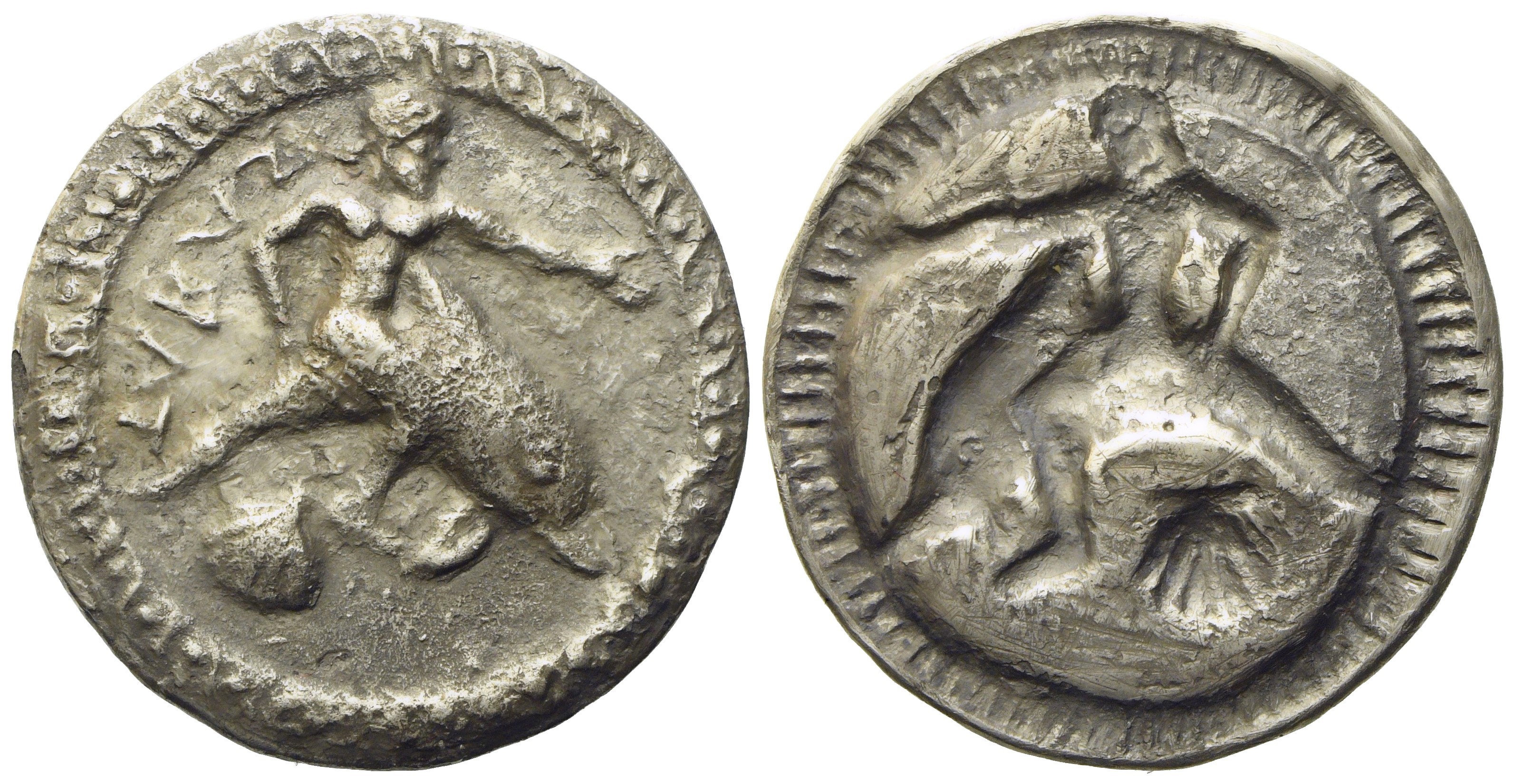 Taras, nude, riding dolphin right, extending left hand, right hand resting on dolphin's back; TARAS (retrograde) to left, scallop shell below, dot-and-cable border around, Rv. Incuse of obverse type; radiate border around. HN Italy 826; Vlasto 62-9. Good very fine. Slight porosity.