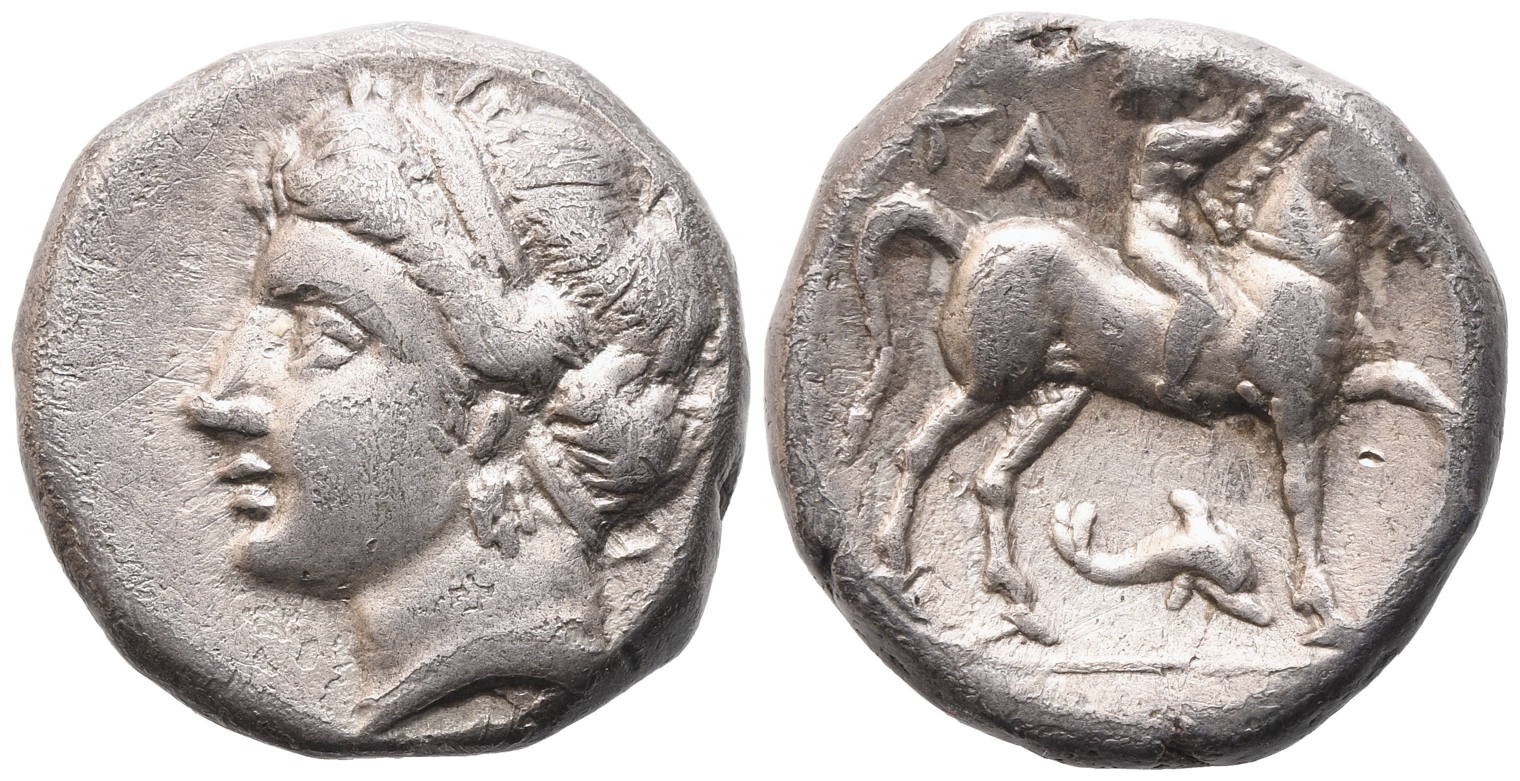 Calabria, Tarentum. Campano-Tarentine series. Circa 281-272 BC. AR Nomos (7,07 g; 19,2 mm; 9 h)